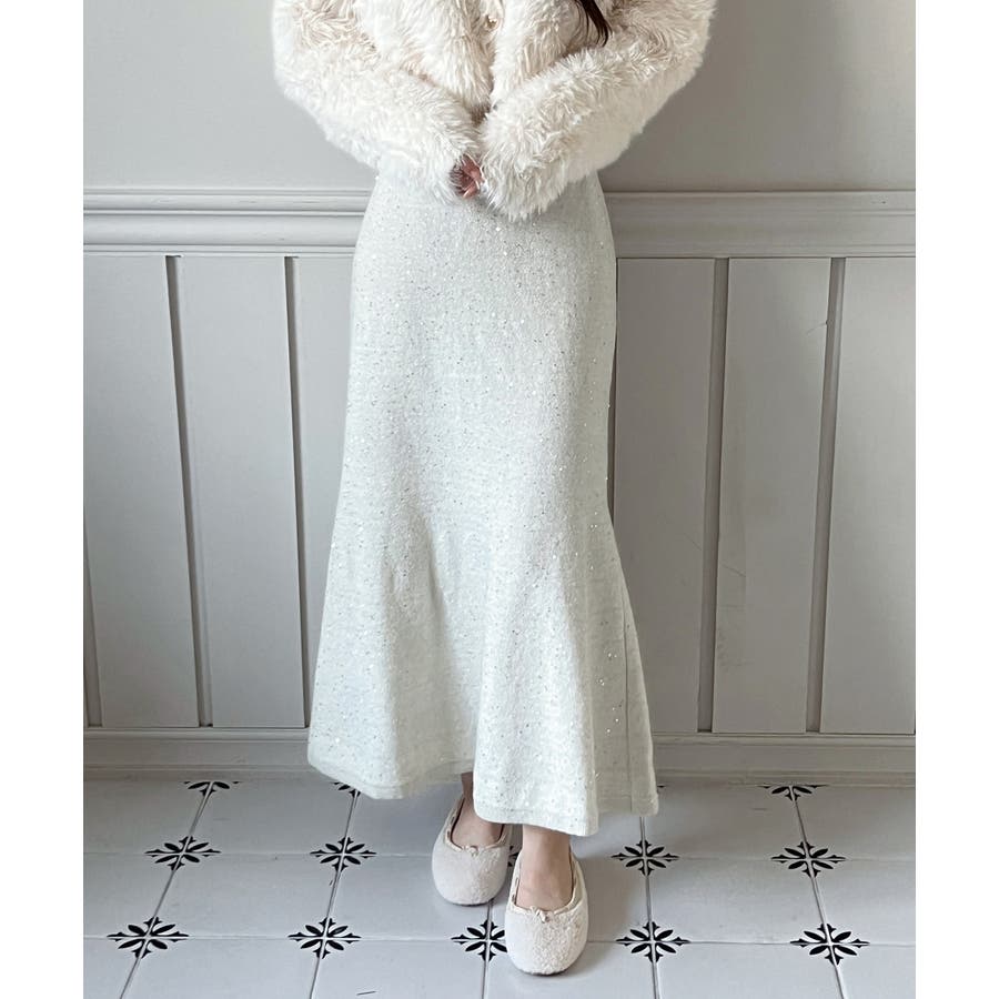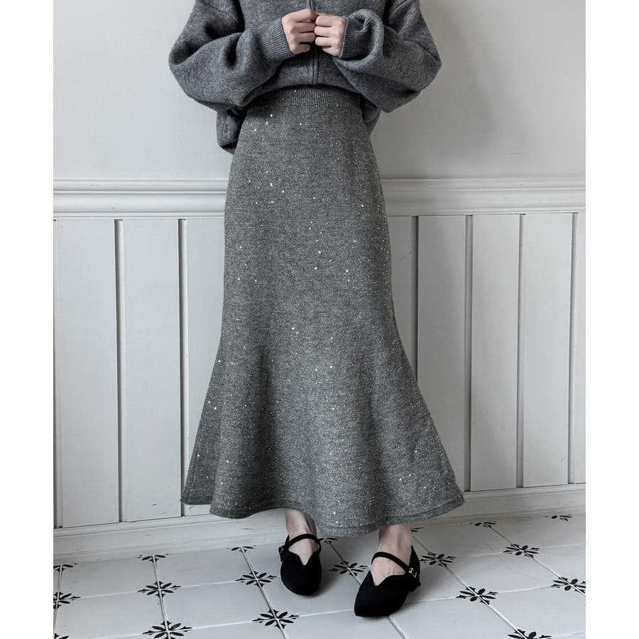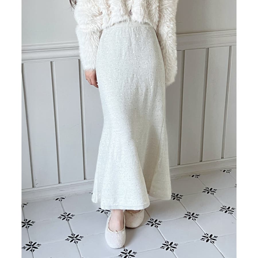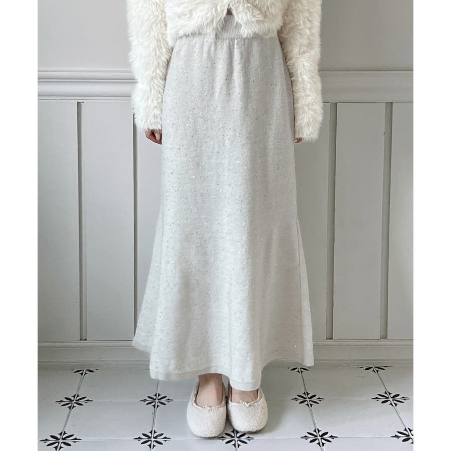 動くたびにほのかにきらめくパールポイントが魅力の、上品なフレアニットスカート。