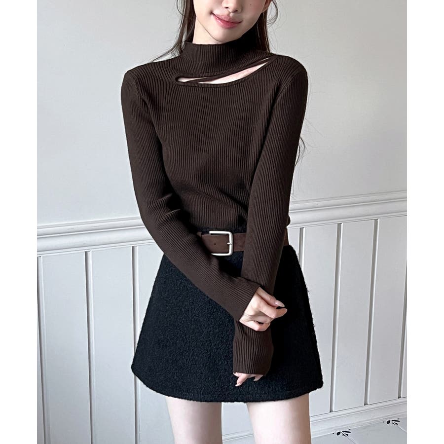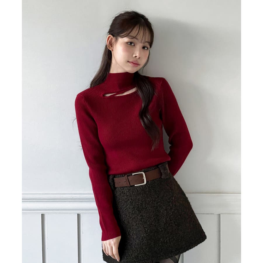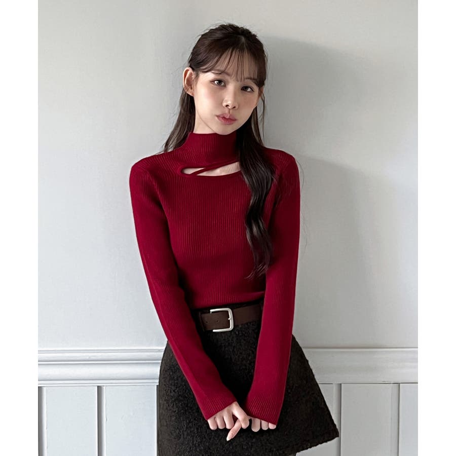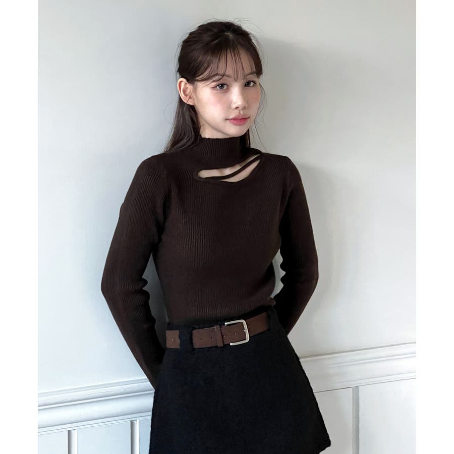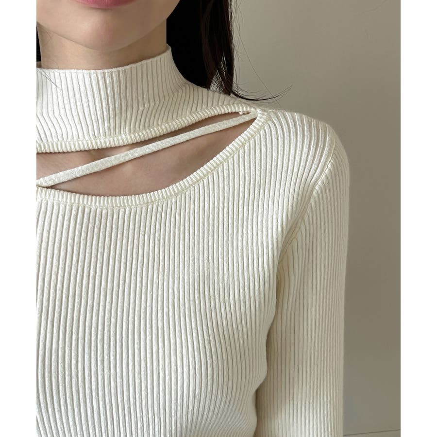 ネックラインのカットアウトディテールが印象的な、スリムフィットニットカットソー。