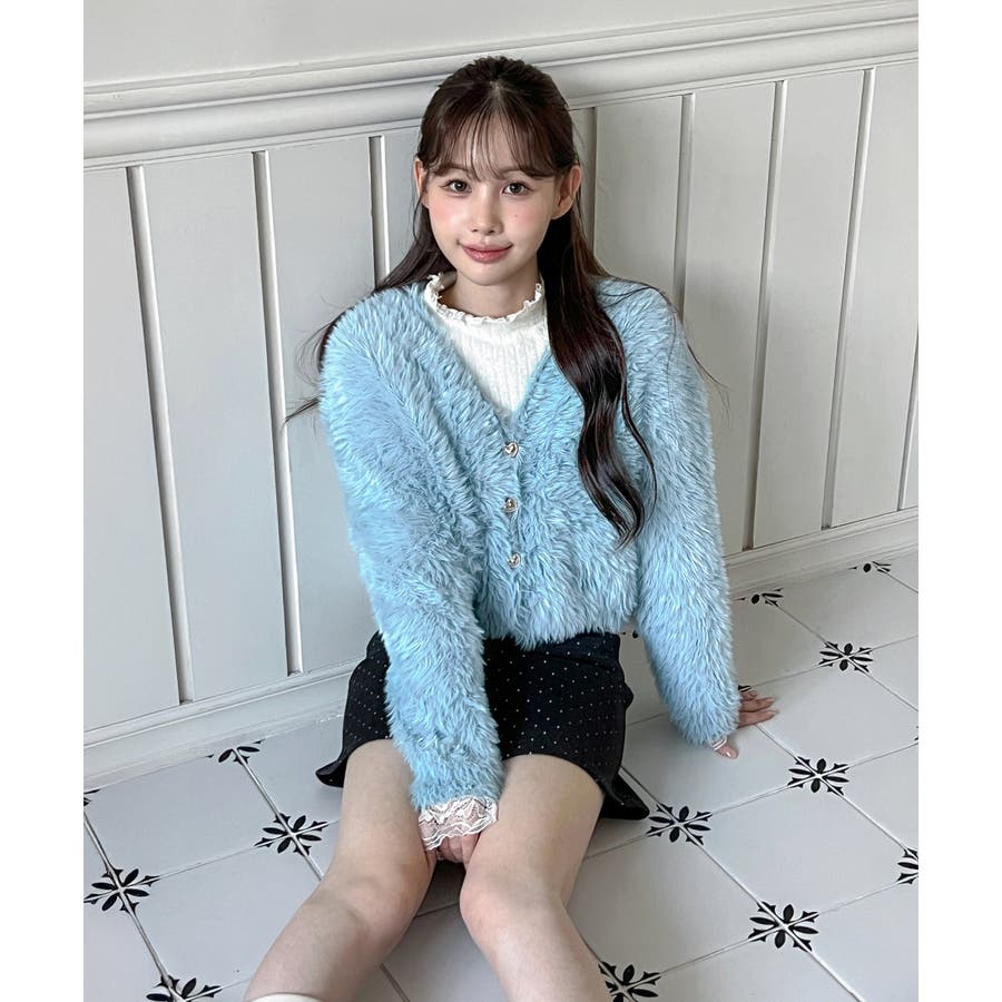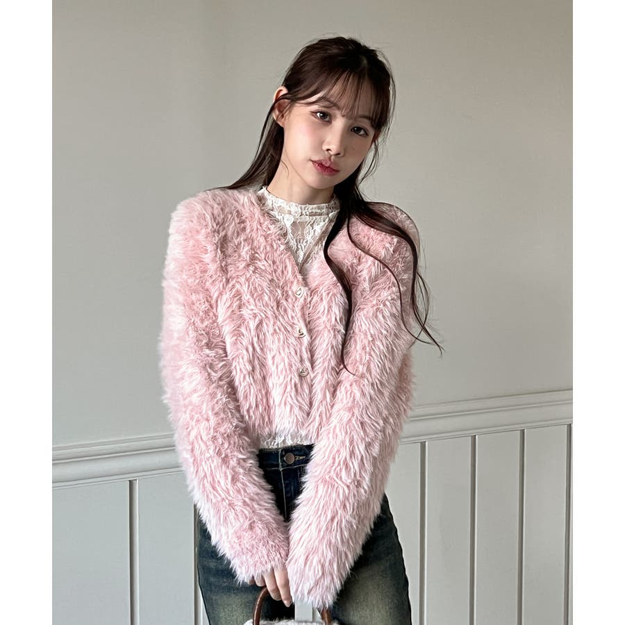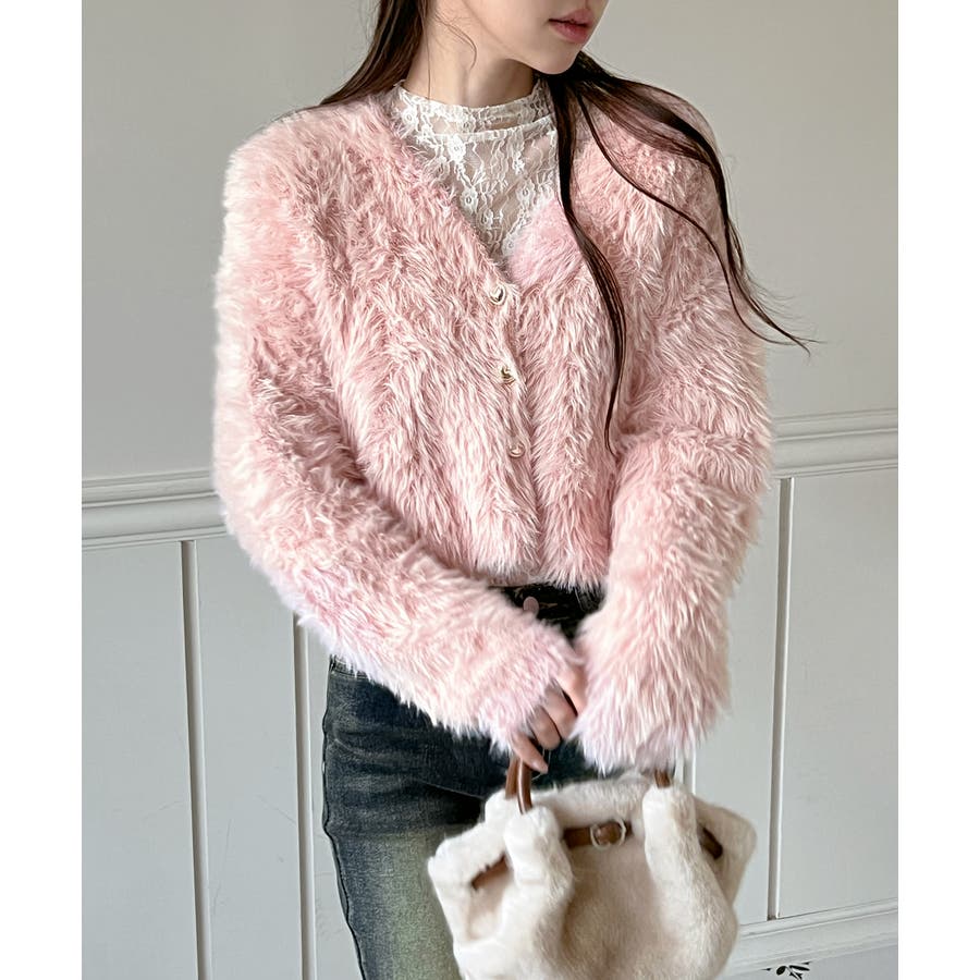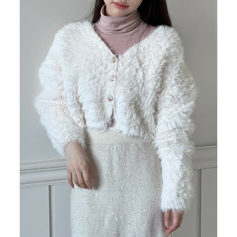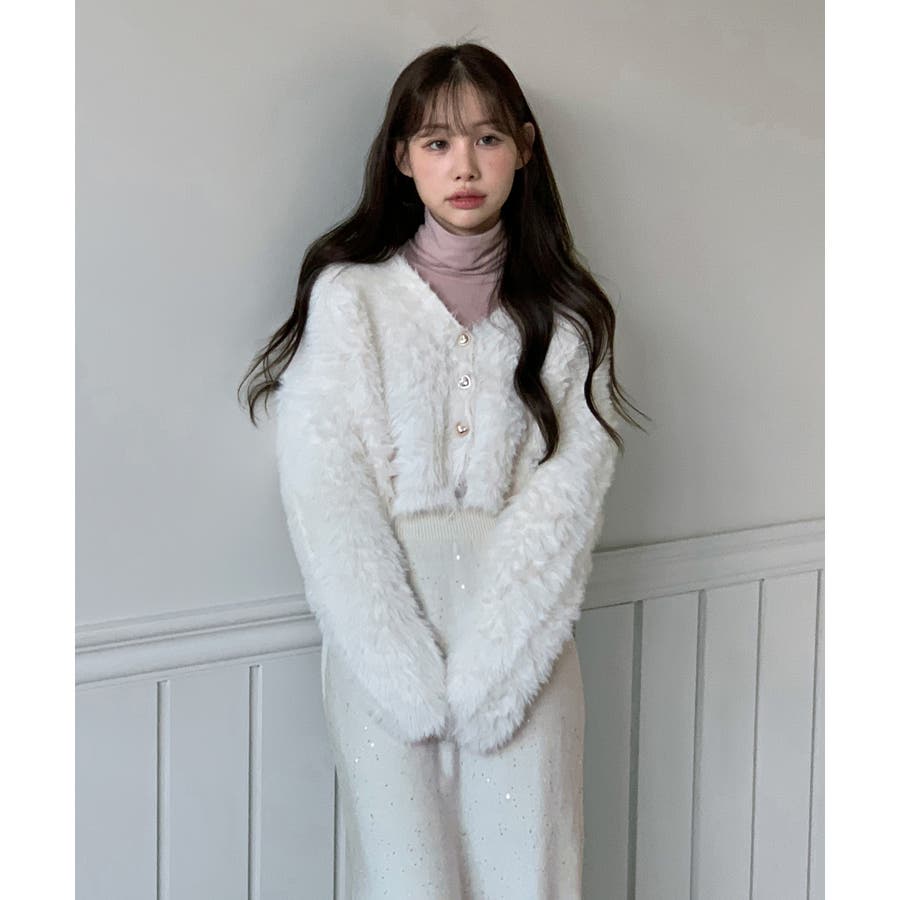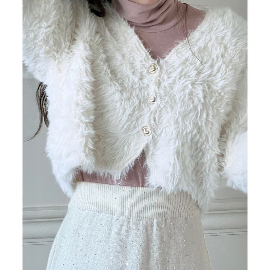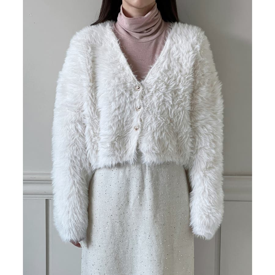 ふわふわで柔らかな質感が魅力の、ハートキュービックファー ニットカーディガン。