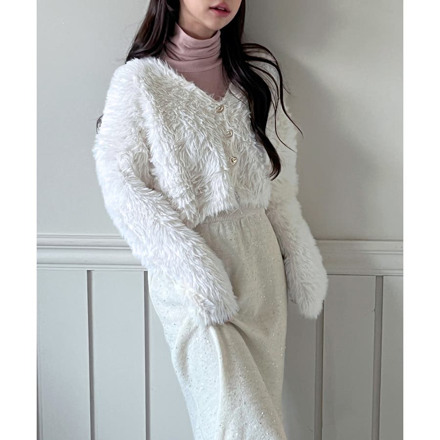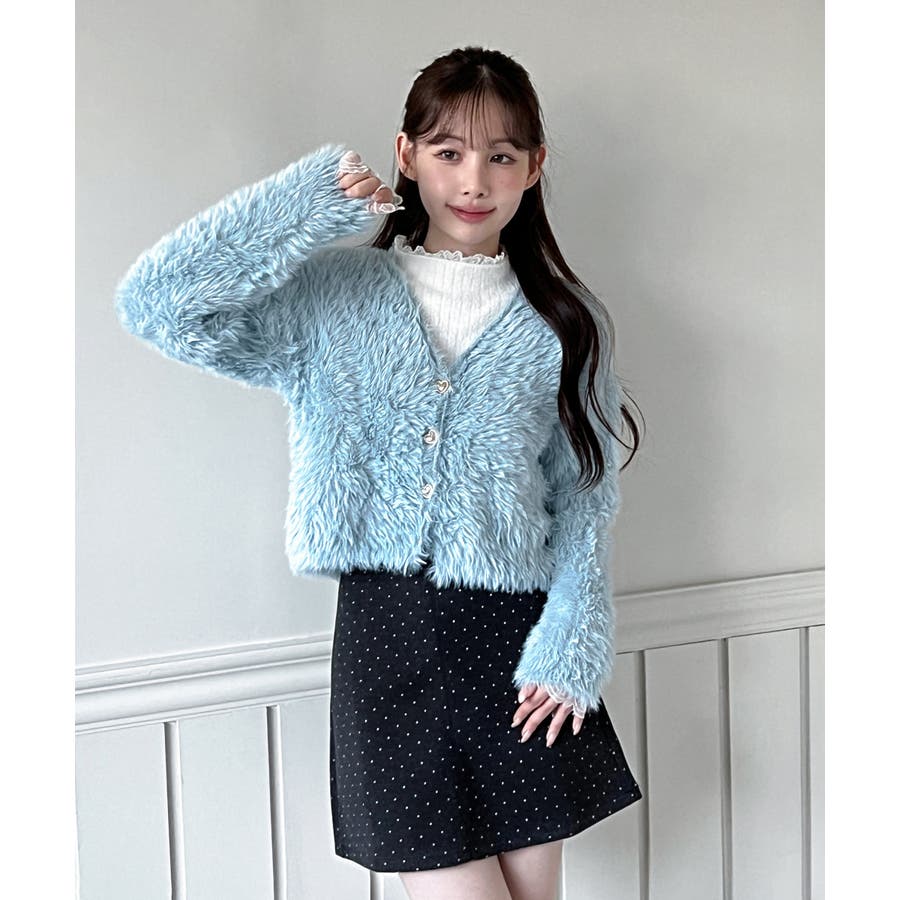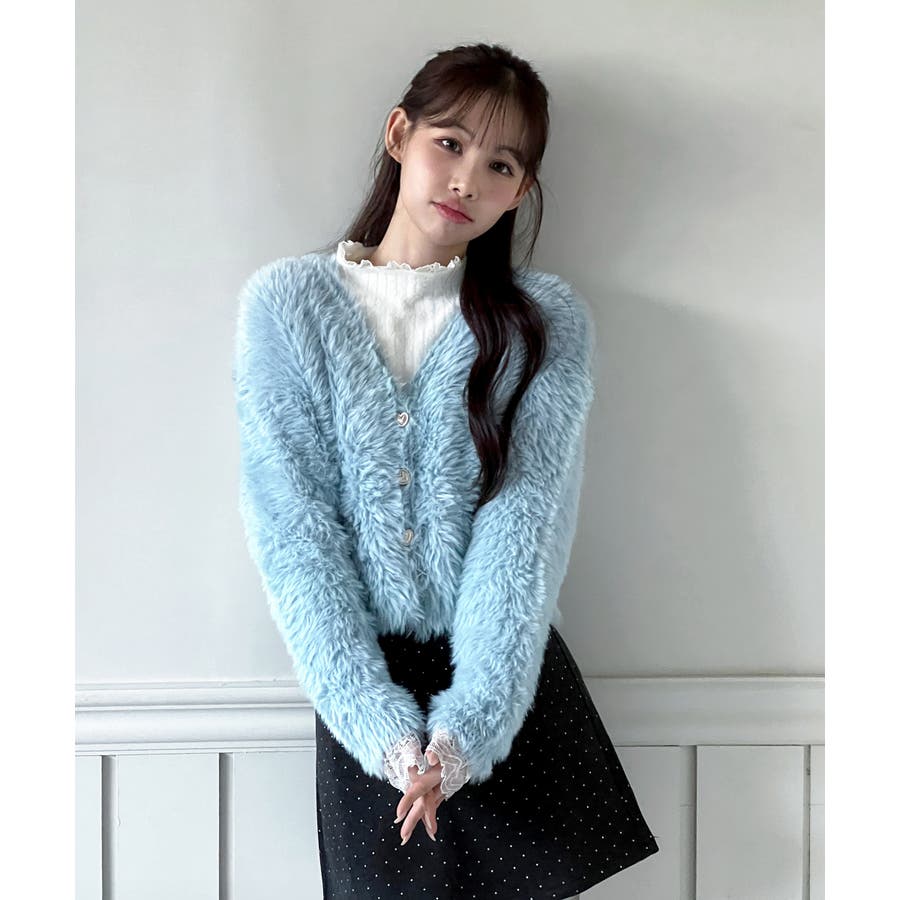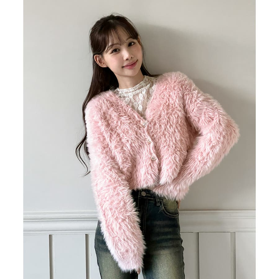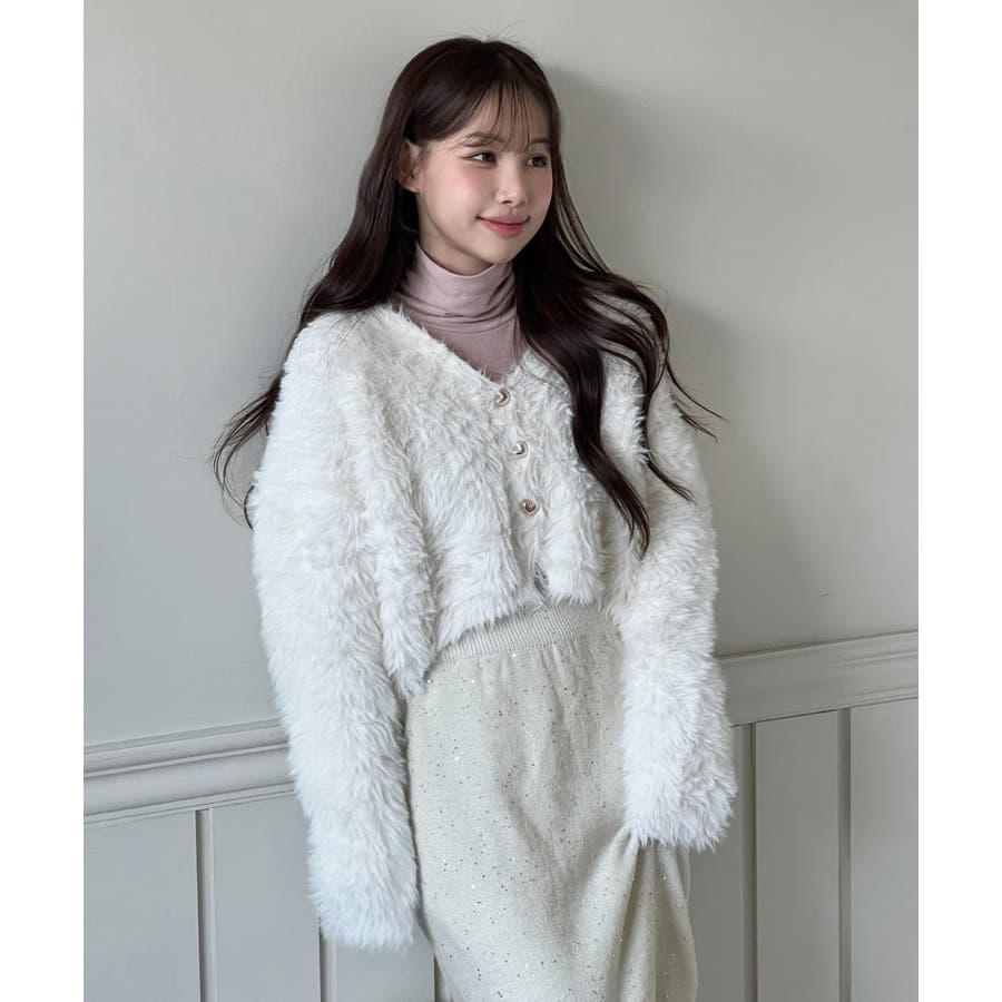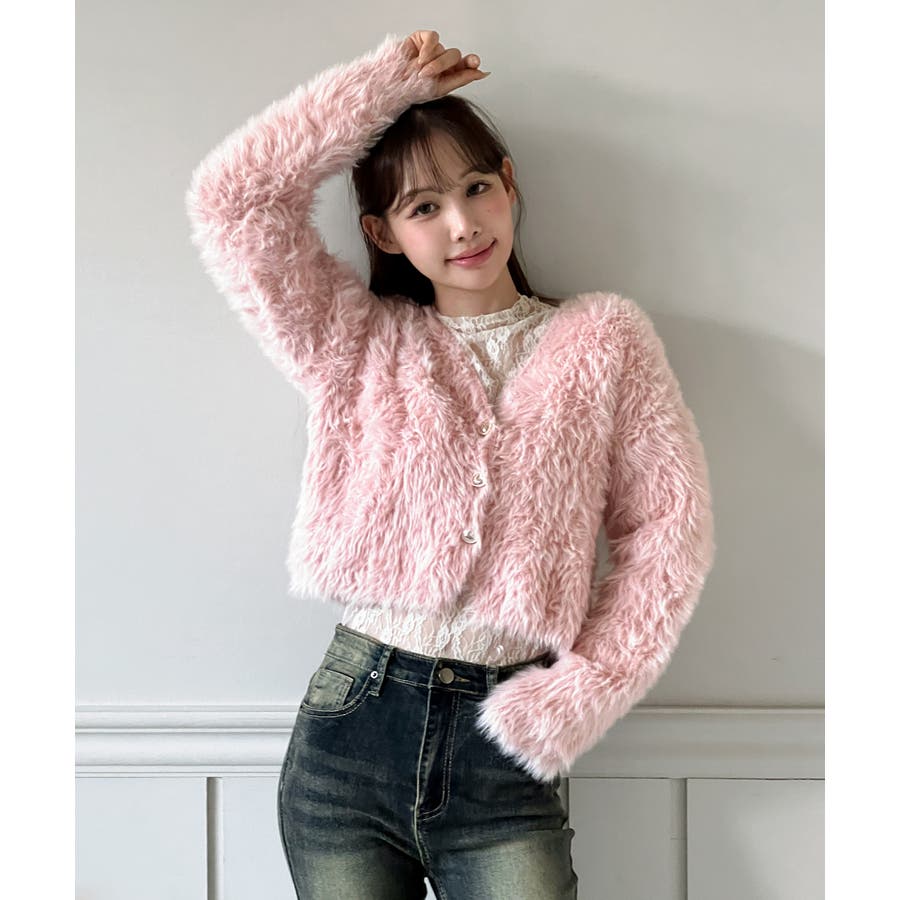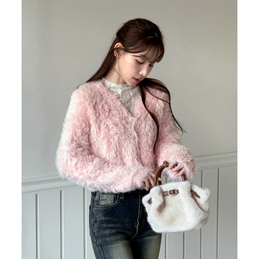 ふわふわで柔らかな質感が魅力の、ハートキュービックファー ニットカーディガン。