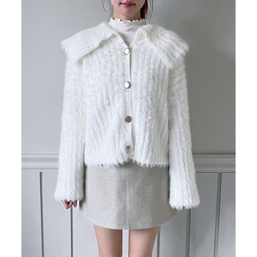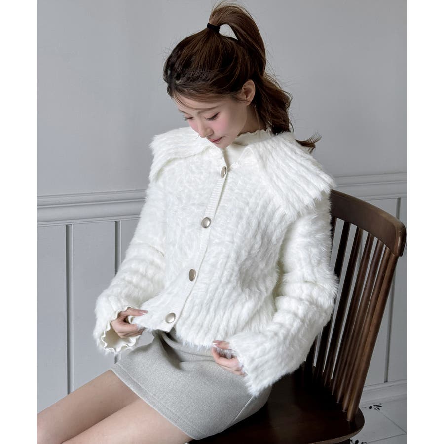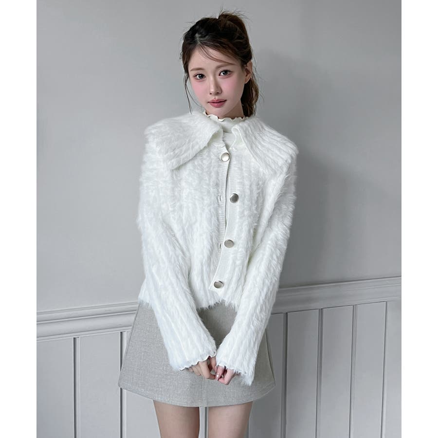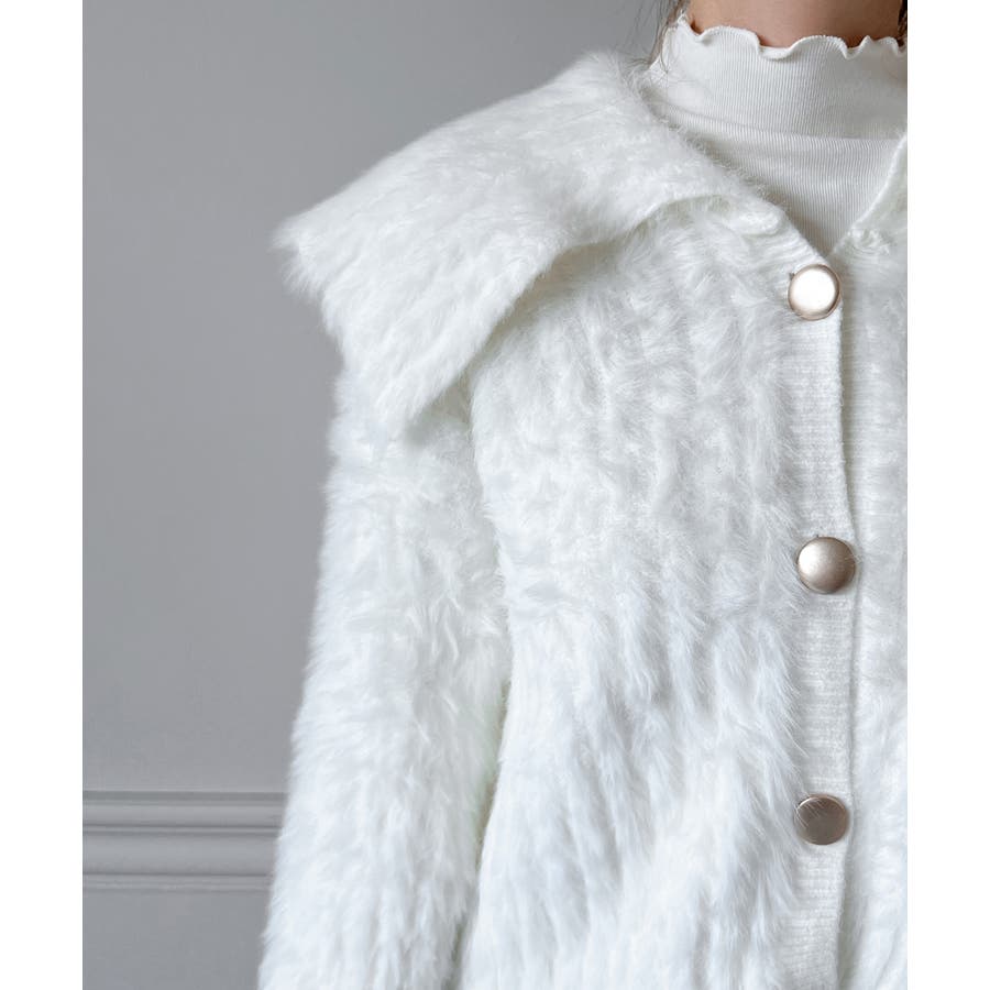 柔らかく、ぬくもりのある風合いが魅力のフラッフィーカラーボタンニットカーディガン。