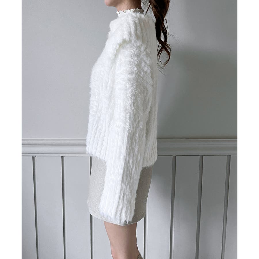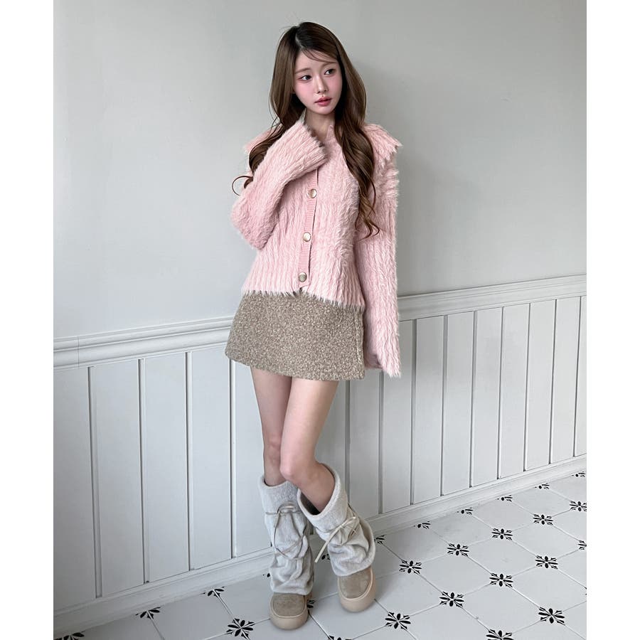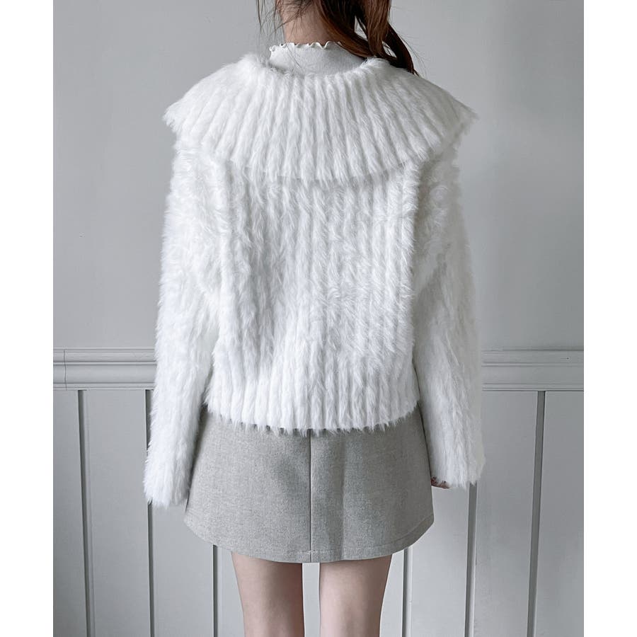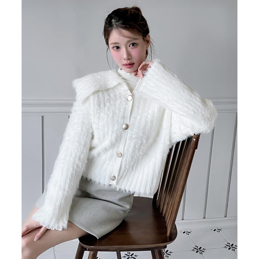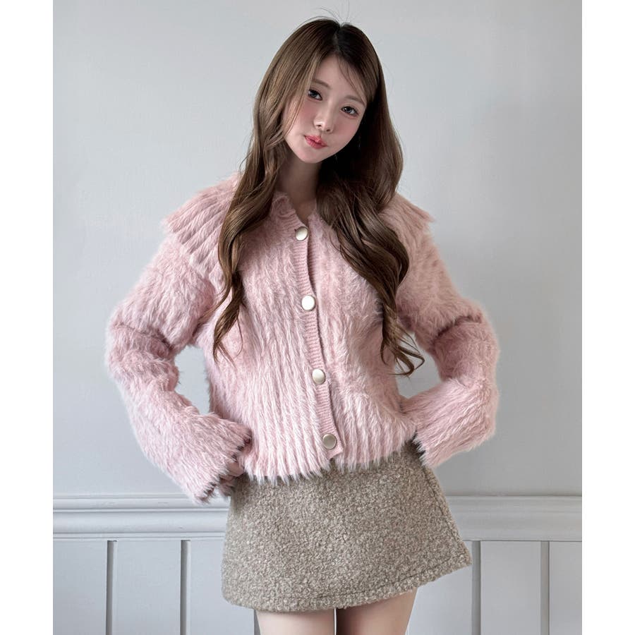 柔らかく、ぬくもりのある風合いが魅力のフラッフィーカラーボタンニットカーディガン。