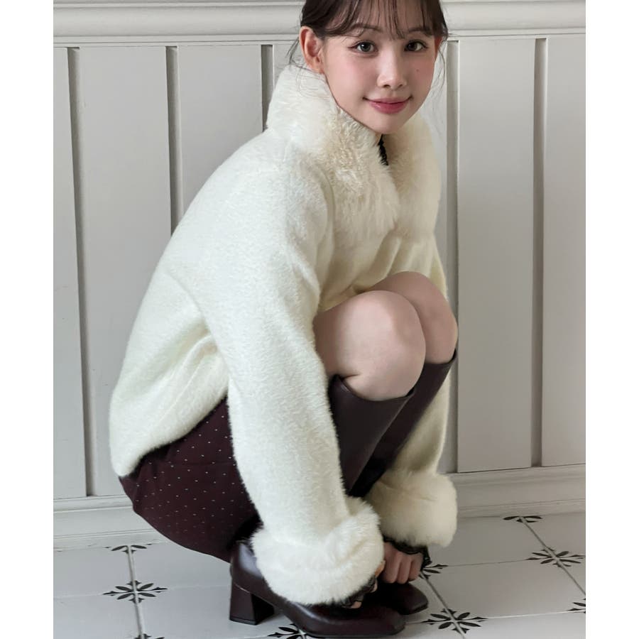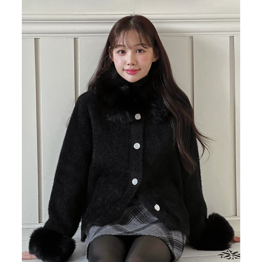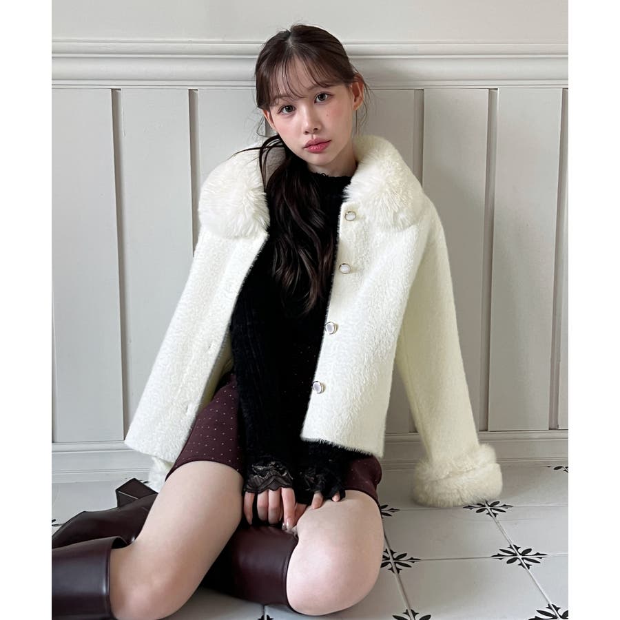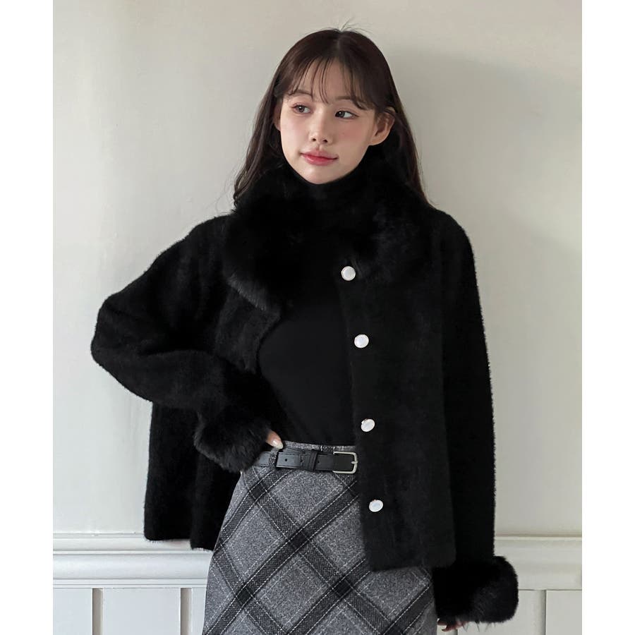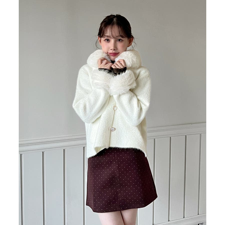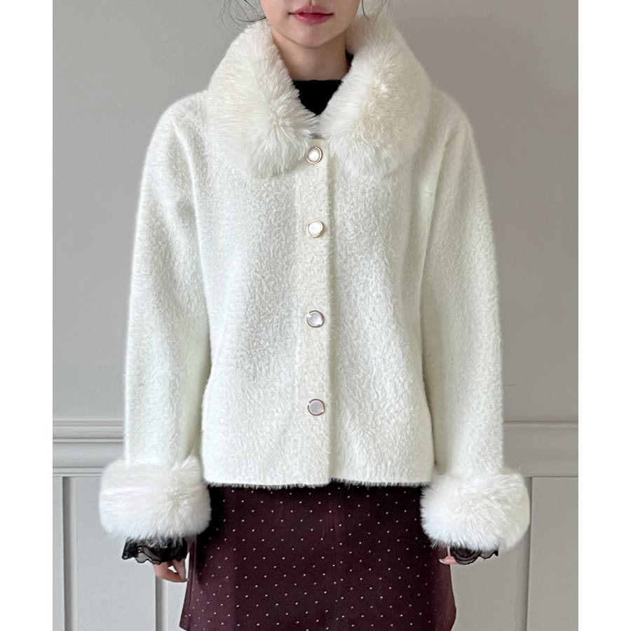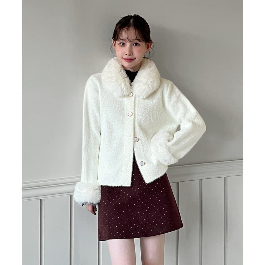 柔らかなニット素材にファートリミングをあしらったショートコート。