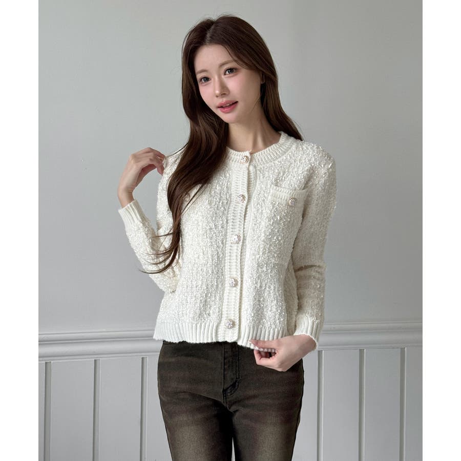 ツイードのような表情豊かなニットテクスチャーが魅力の、フラワーボタンニットカーディガン。