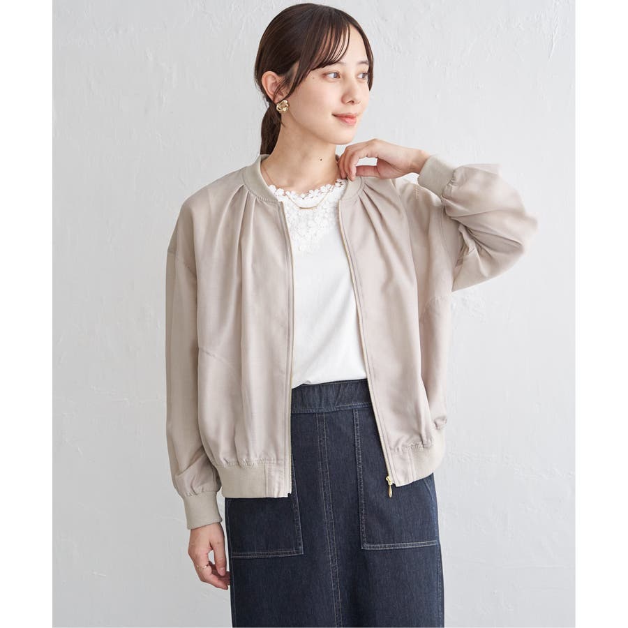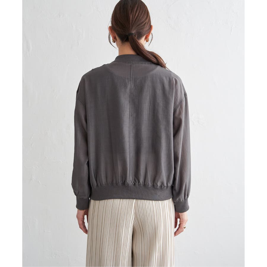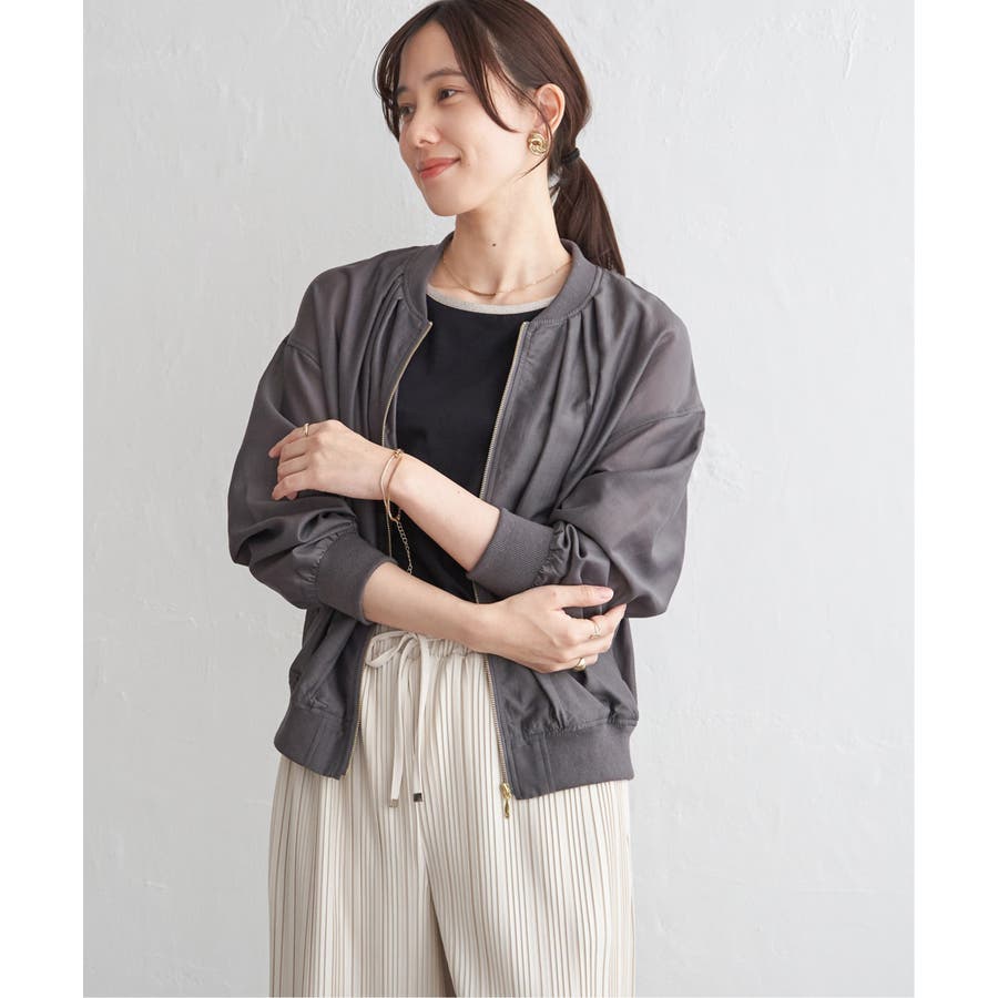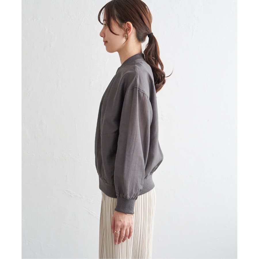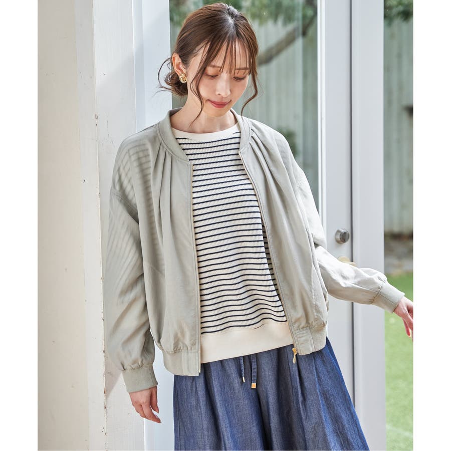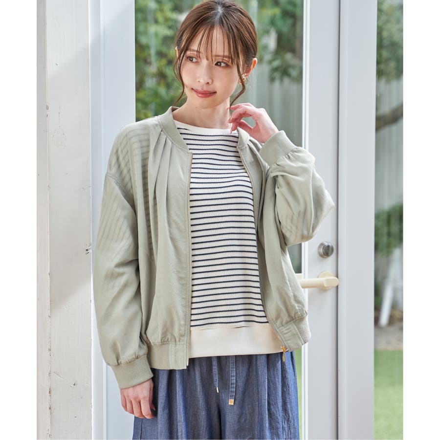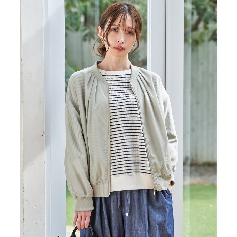 ほんのり光沢のあるシアー素材が軽やかな印象を与える、ライトな着心地のリブブルゾン。