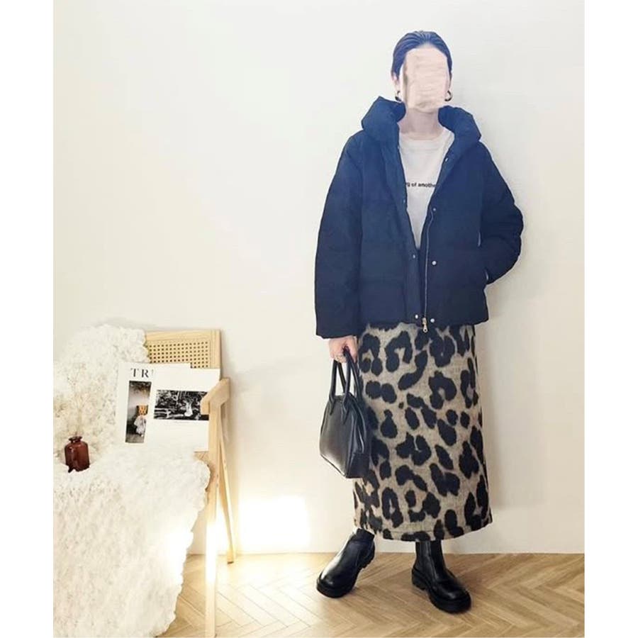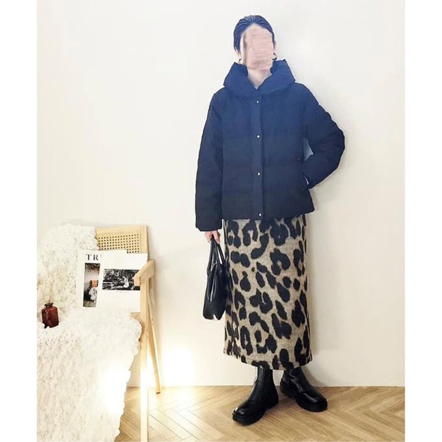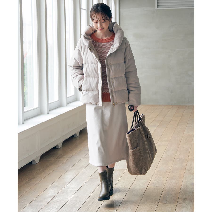 ダウンコートのミドル丈は、華やかなスカートやお気に入りのパンツも邪魔せず