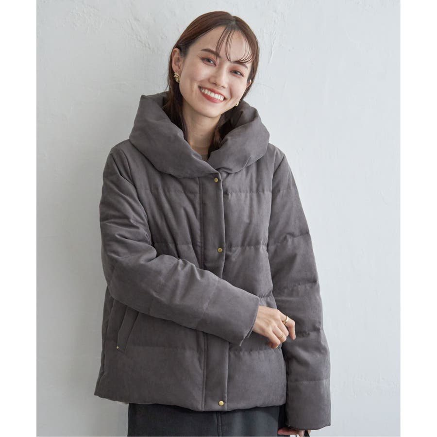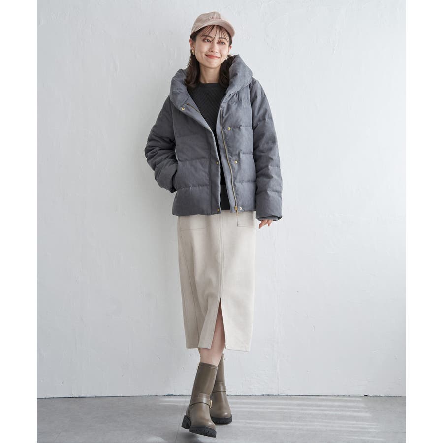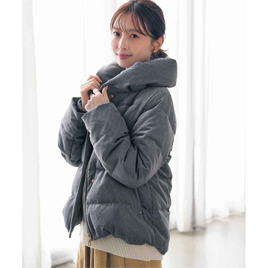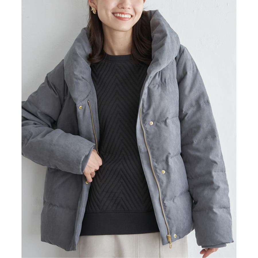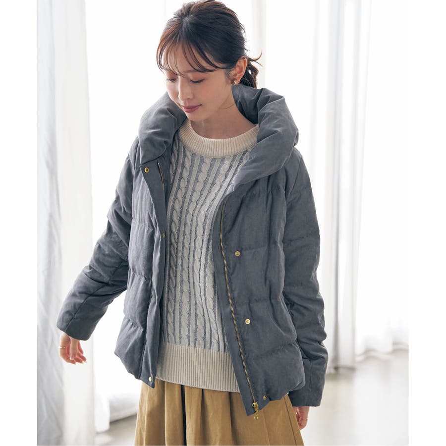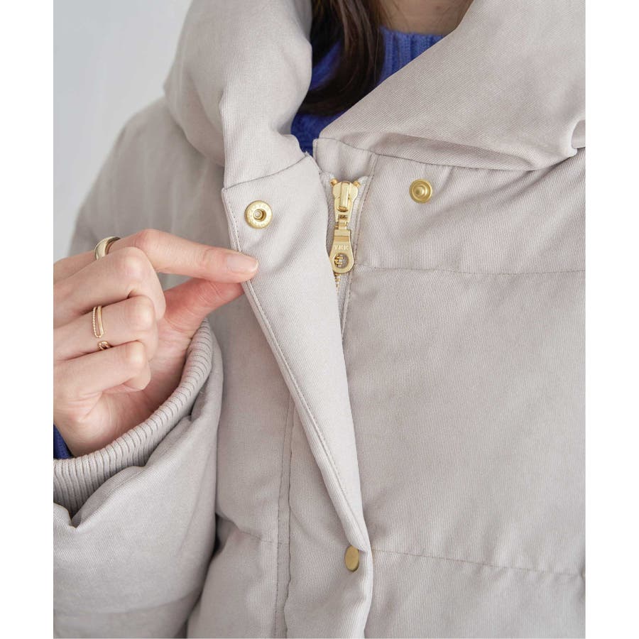ボリュームのある襟元は、ファスナーを開けるとビックカラーのようにきれいに広がり、前を閉めても開けても品よく着こなしていただけます。
