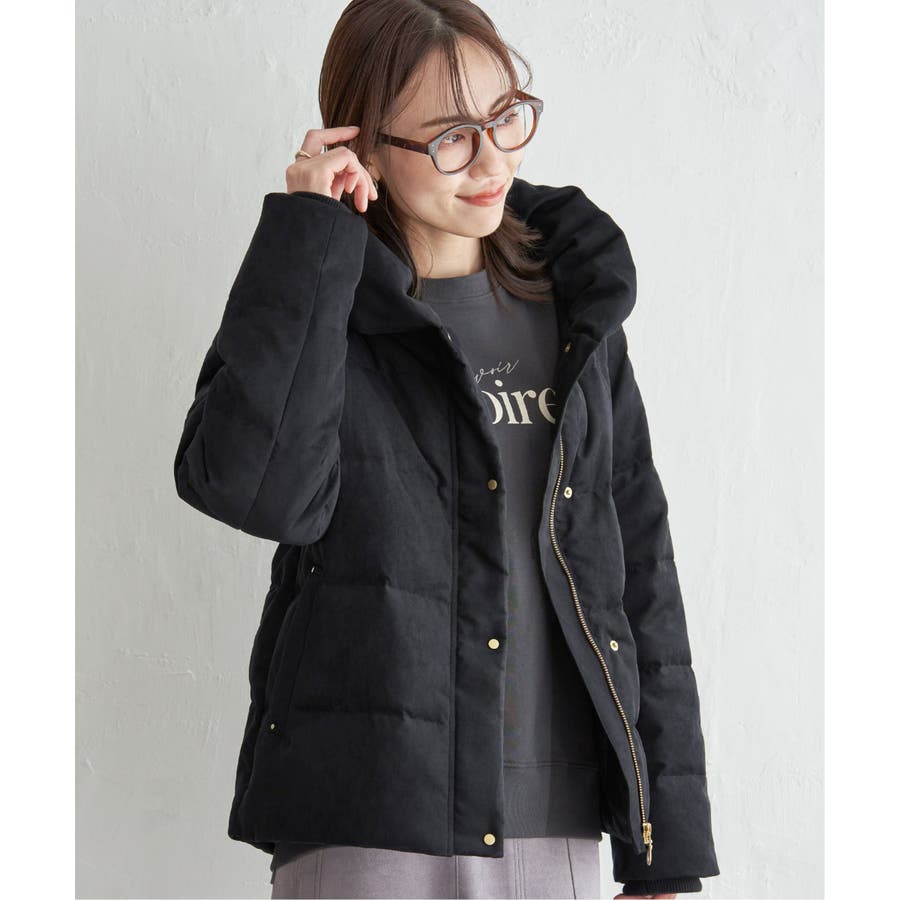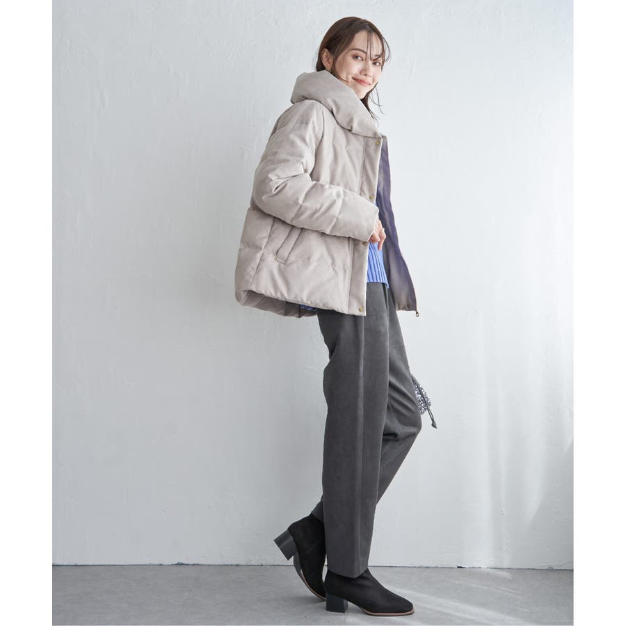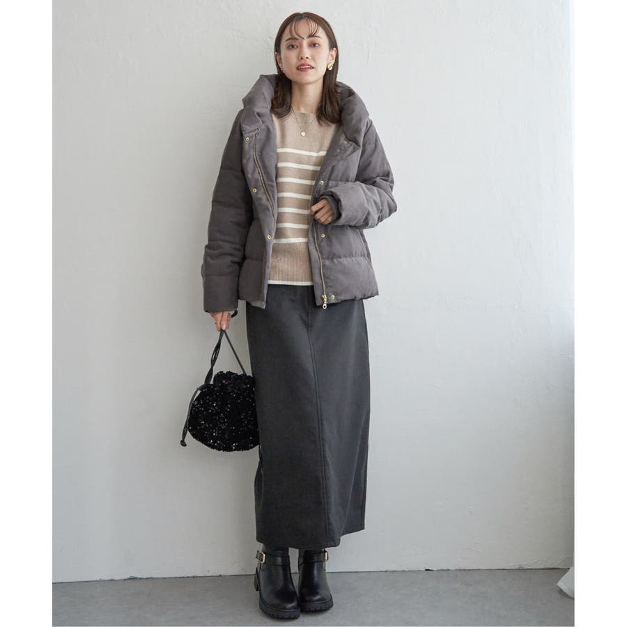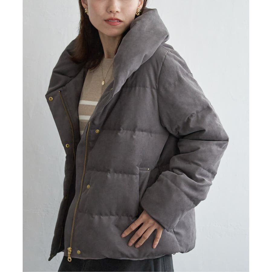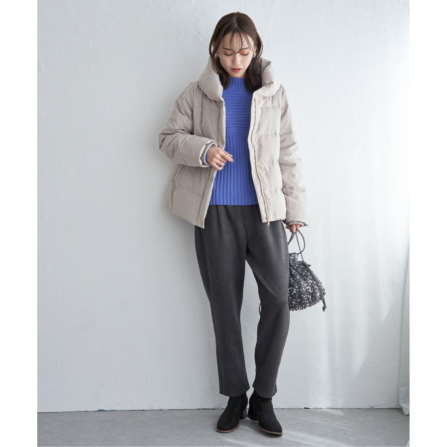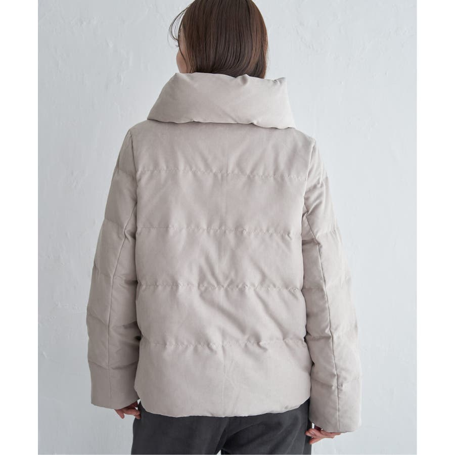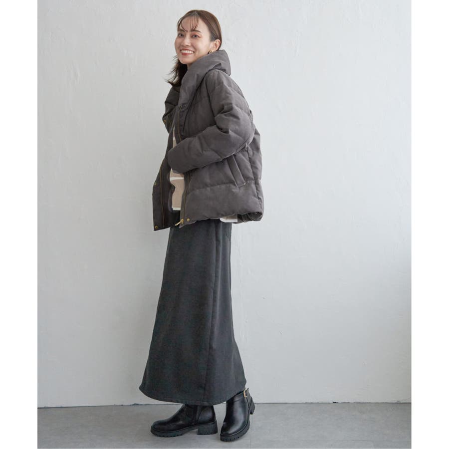 ボリュームのある襟元は、ファスナーを開けるとビックカラーのようにきれいに広がり、前を閉めても開けても品よく着こなしていただけます。