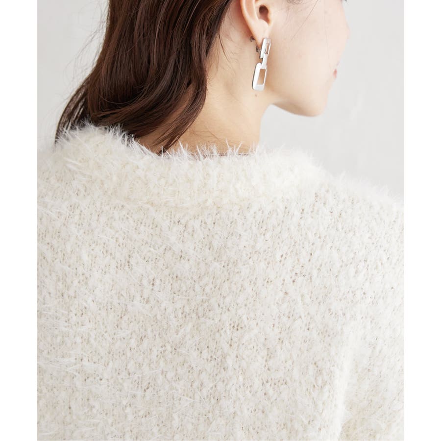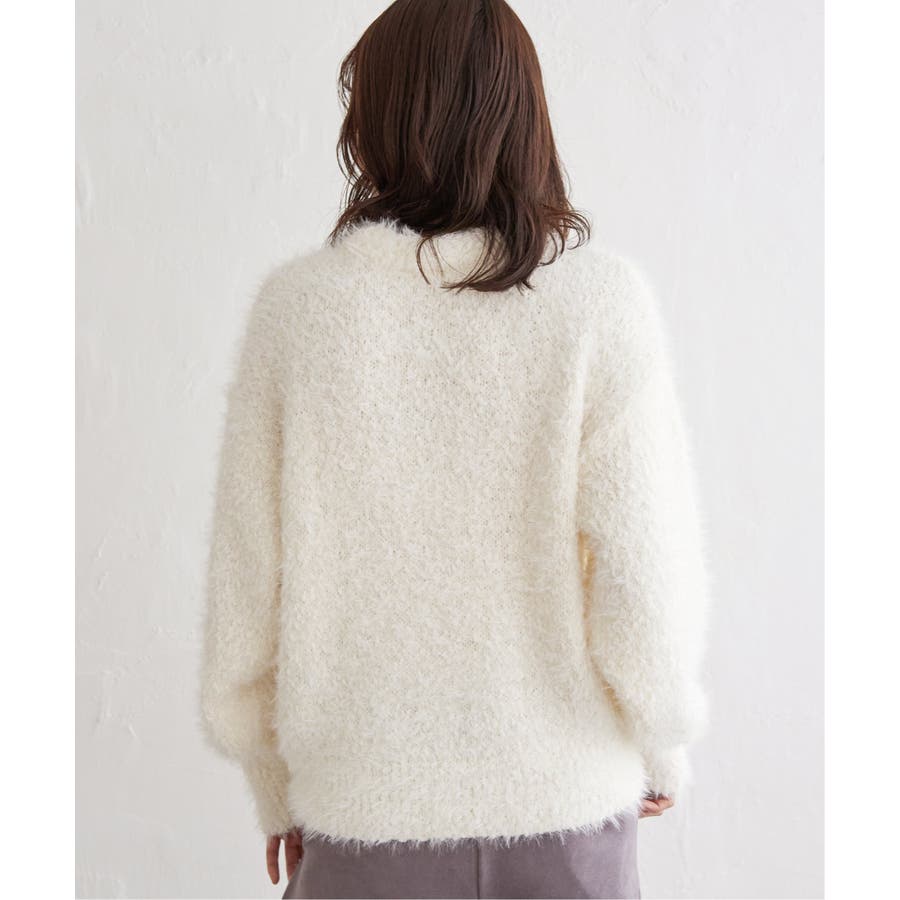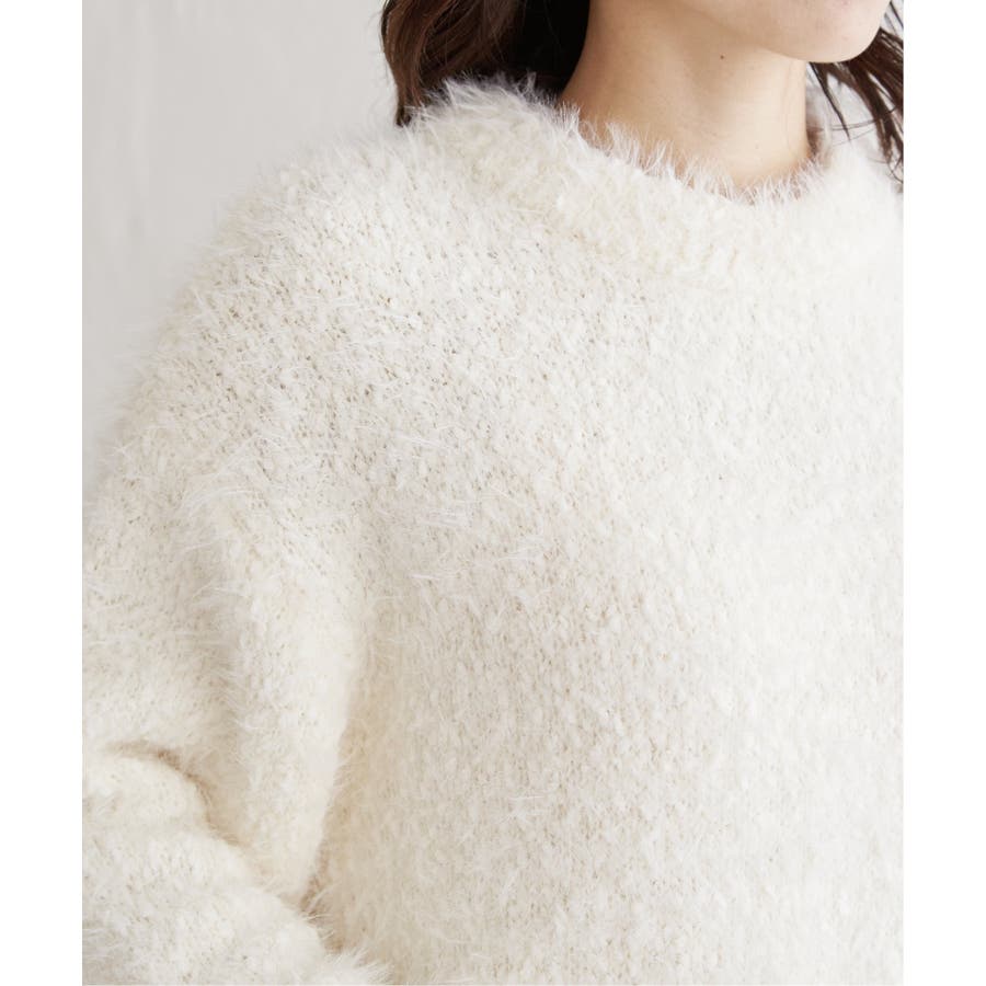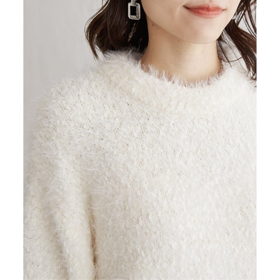 ぽこぽこしたポップコーン糸と、毛足の長いフェザーヤーンをMIXした、立体感のある風合いが自慢のニット。