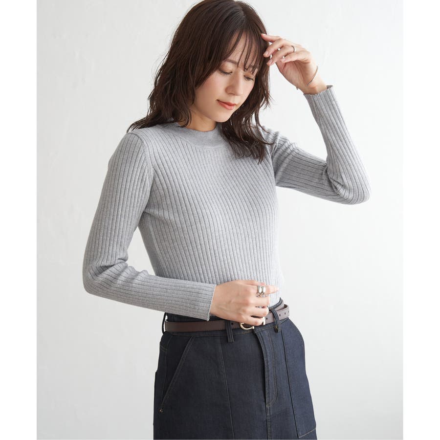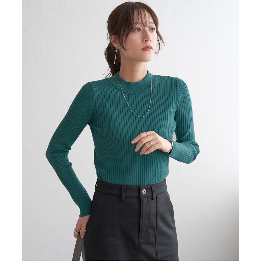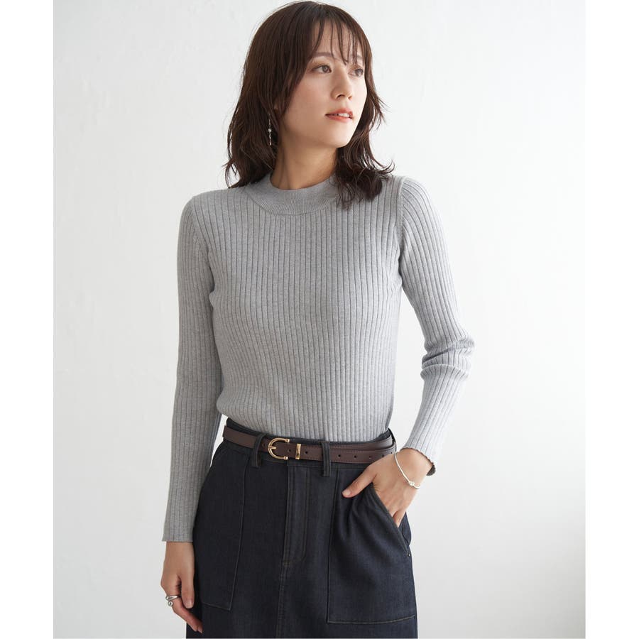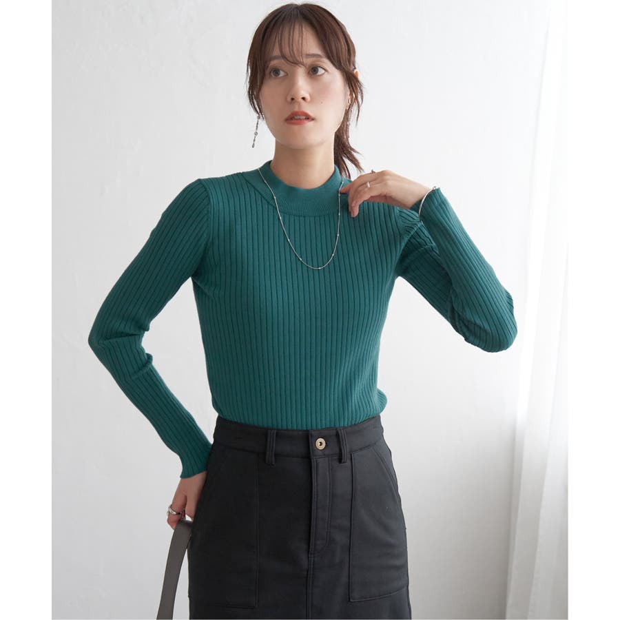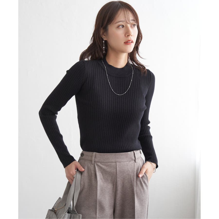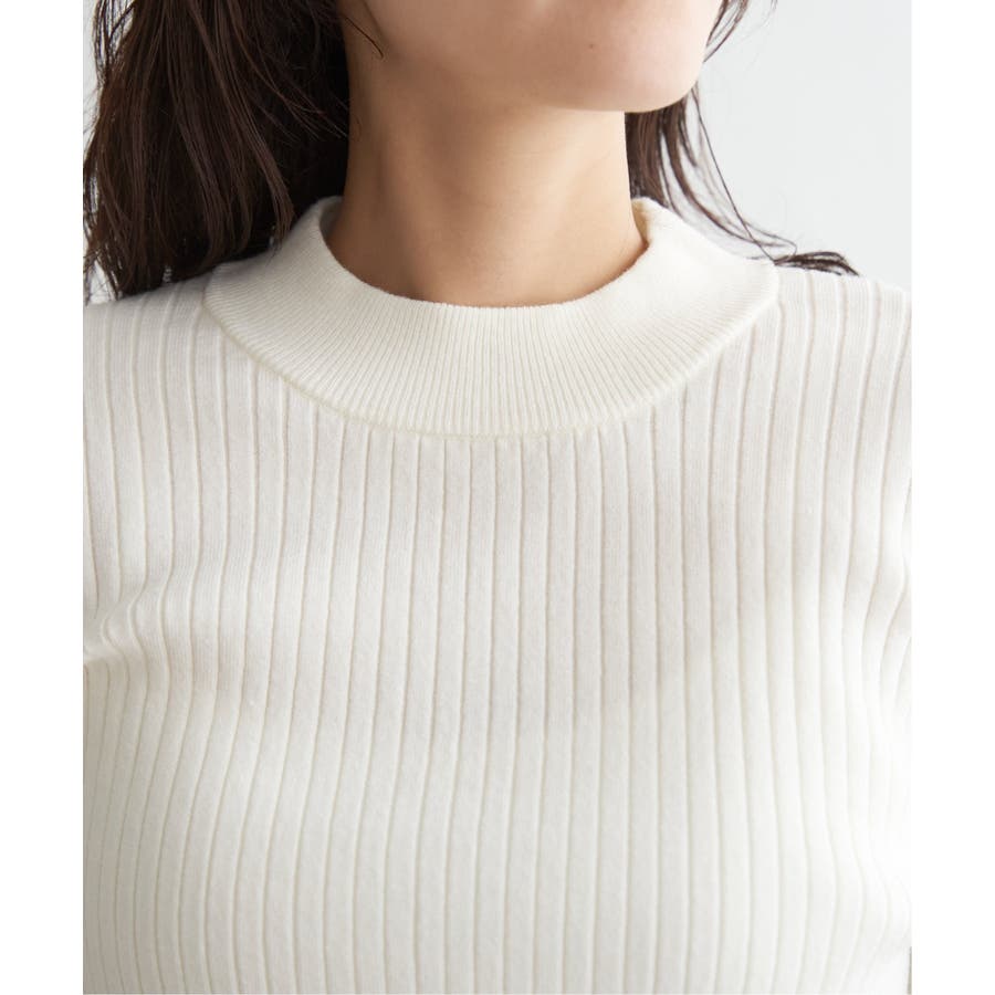 首元をあたたかく包むモックネック襟、インナーに適したコンパクトなサイズ感のリブニットです。