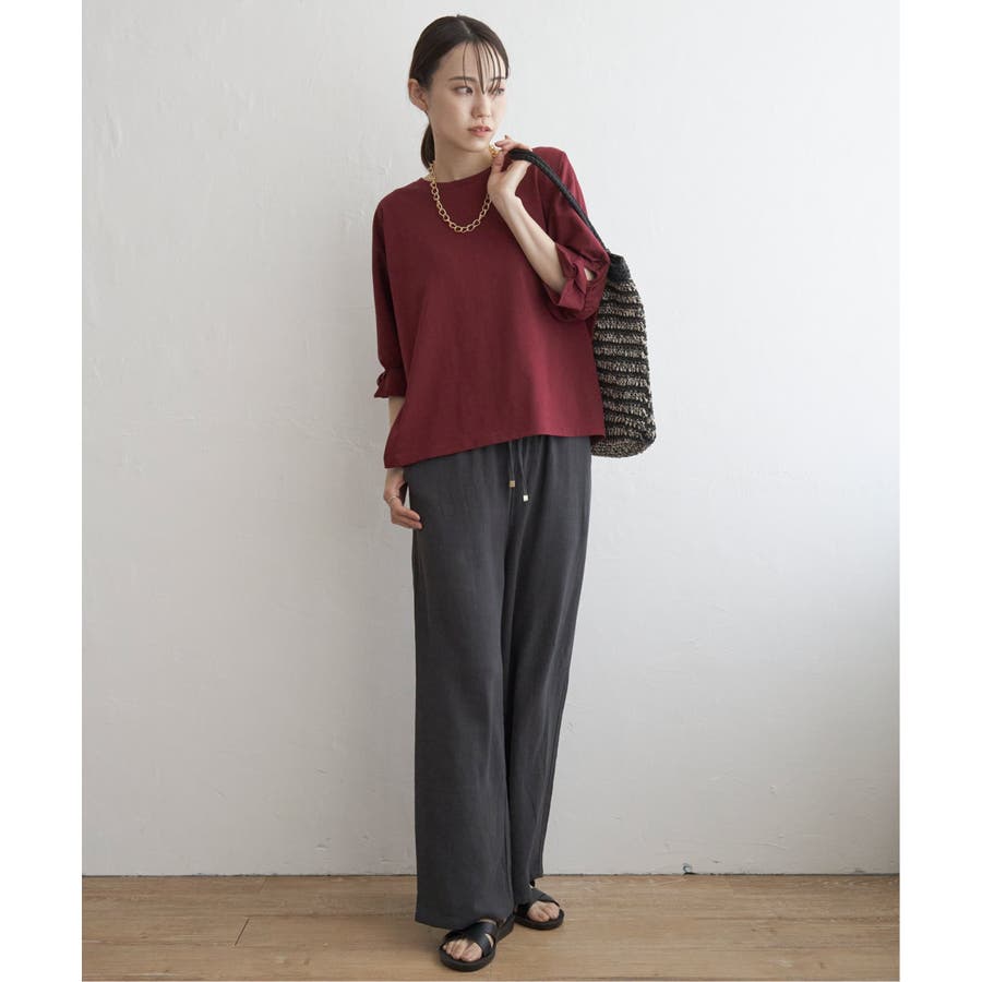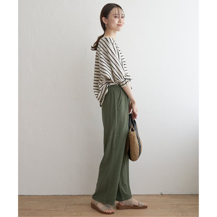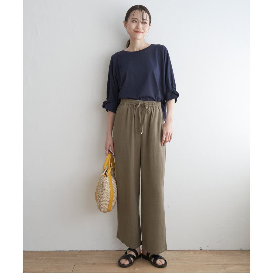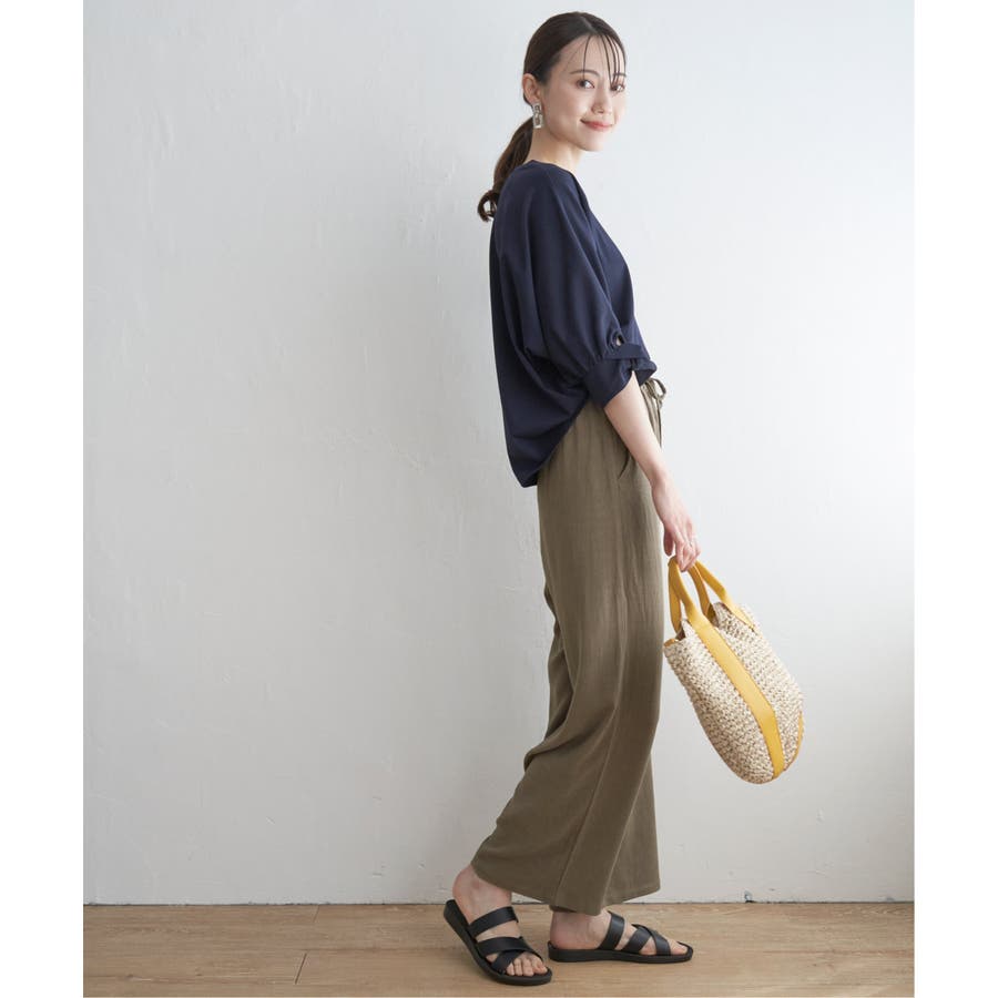 旬のワイドパンツやフレアスカートにウエストINですっきりと着こなすのもおすすめ。