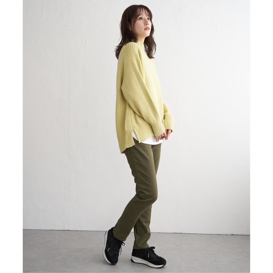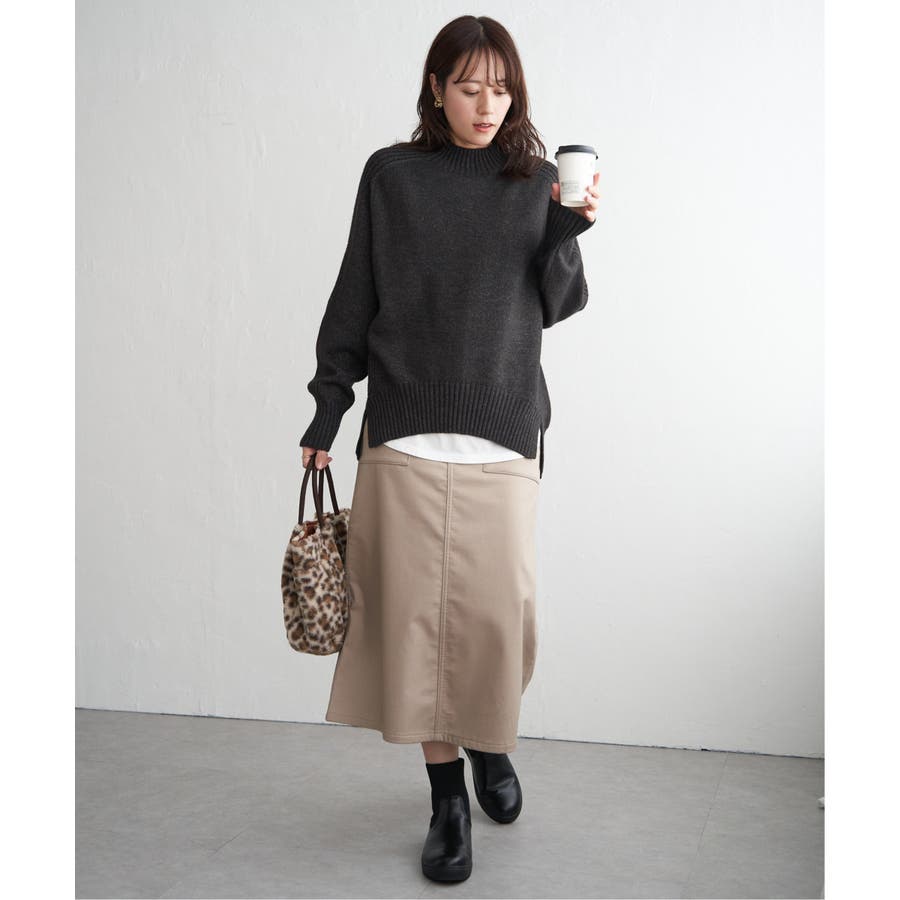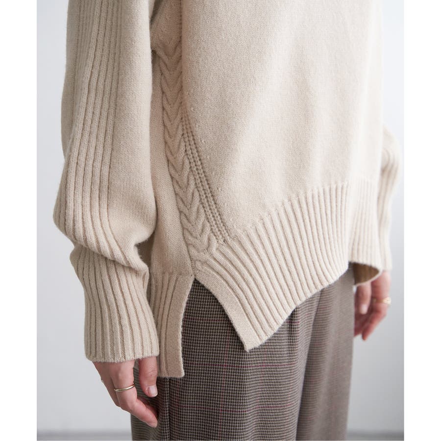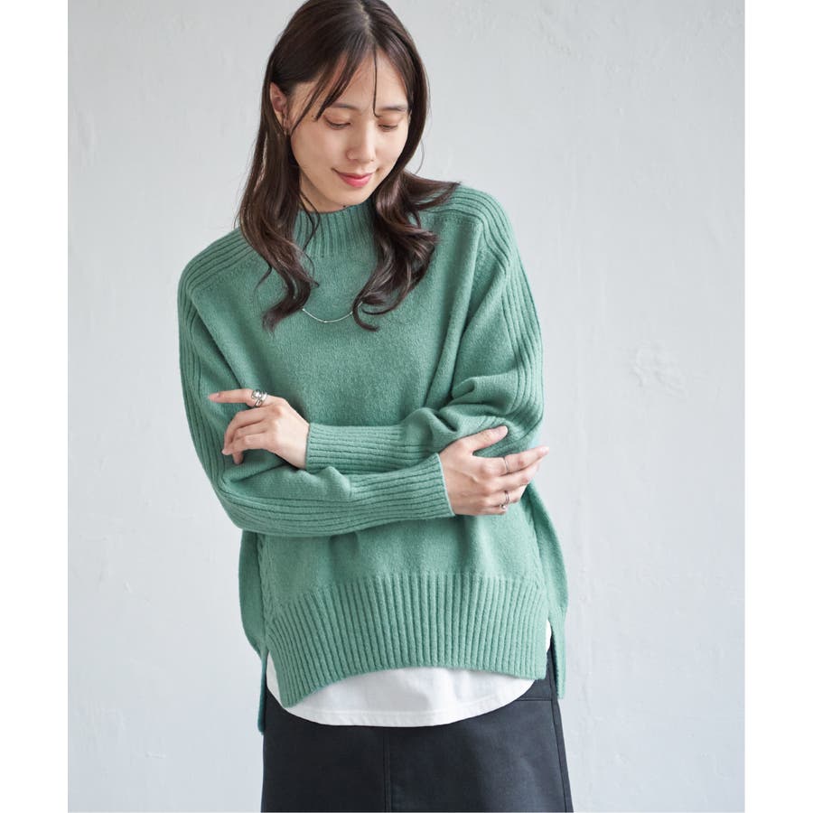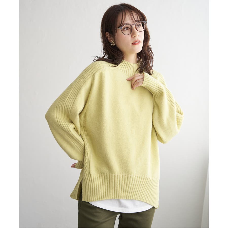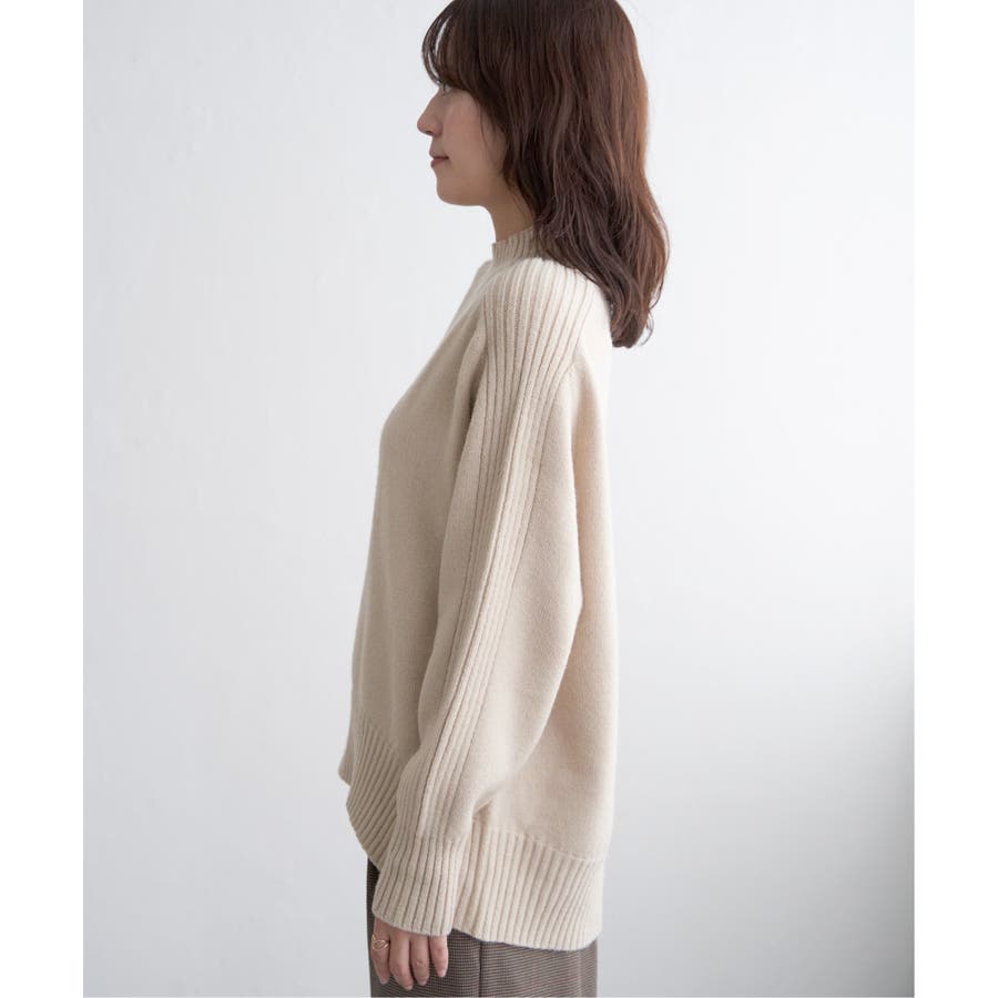 前振りにした脇線の裾にスリットが入った、前後差をつけた着丈のニット。