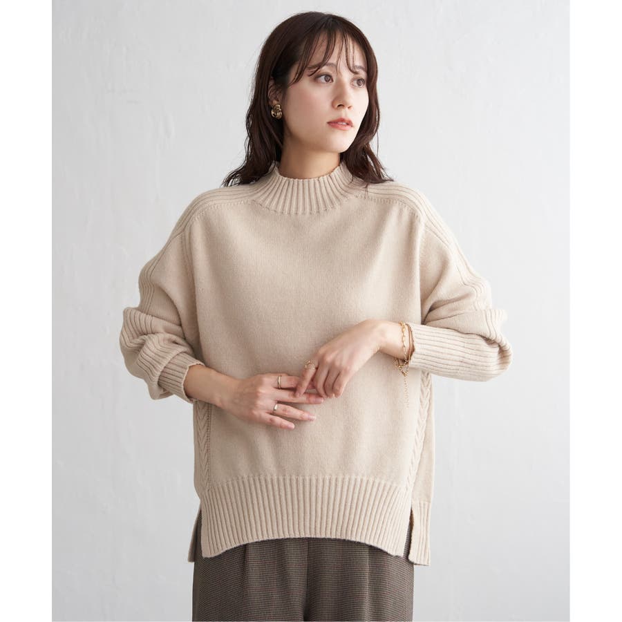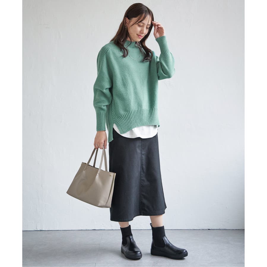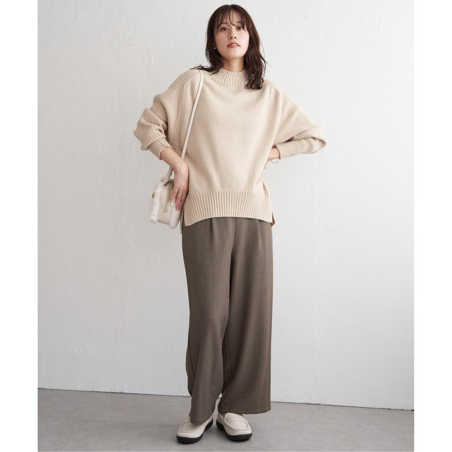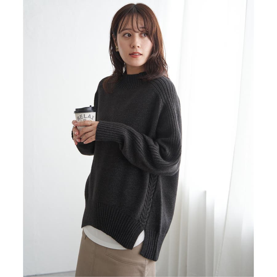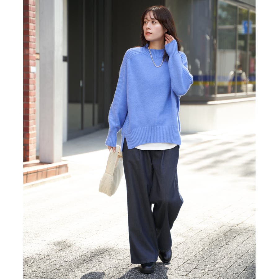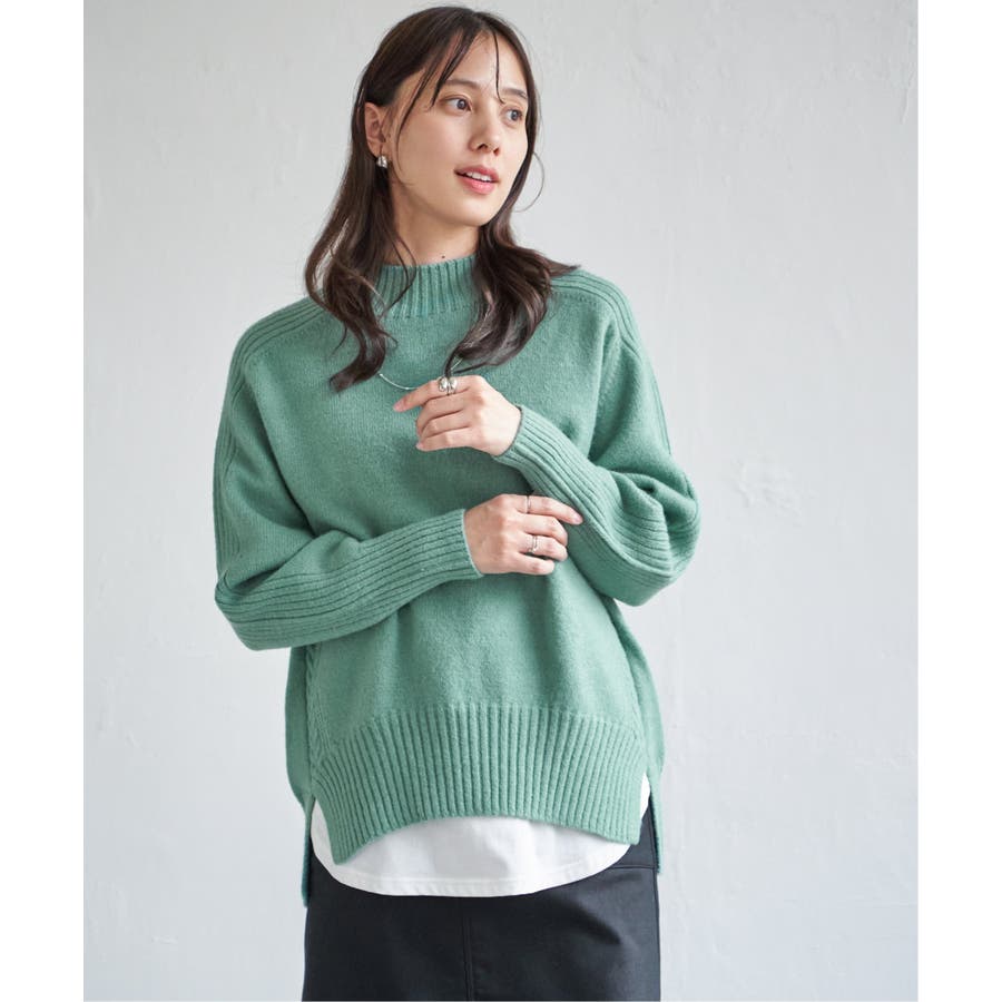 前振りにした脇線の裾にスリットが入った、前後差をつけた着丈のニット。