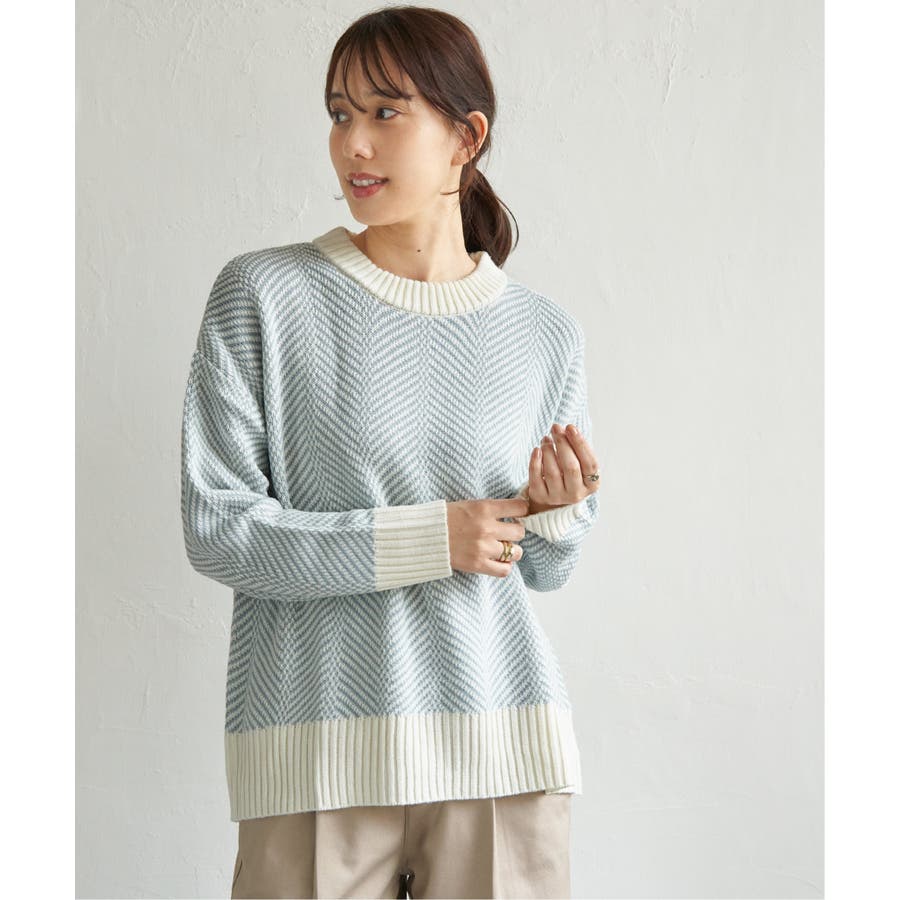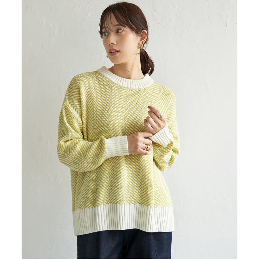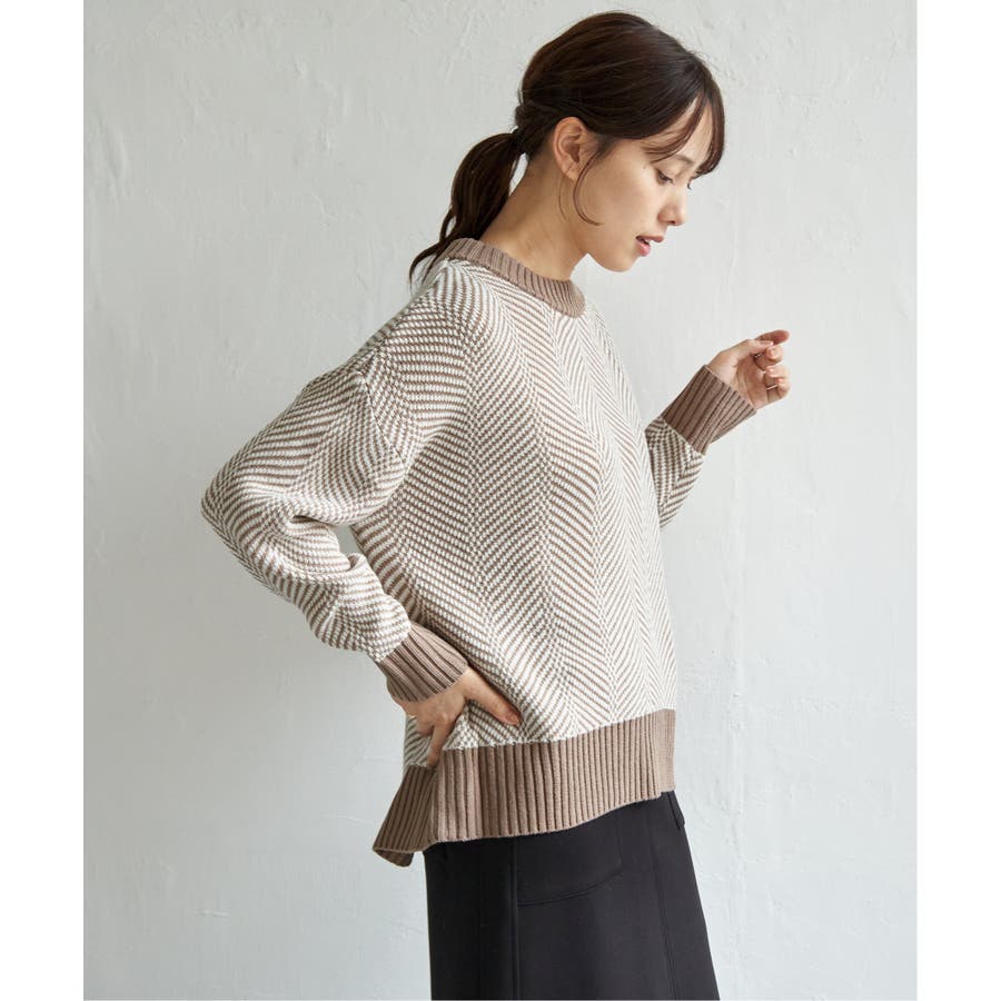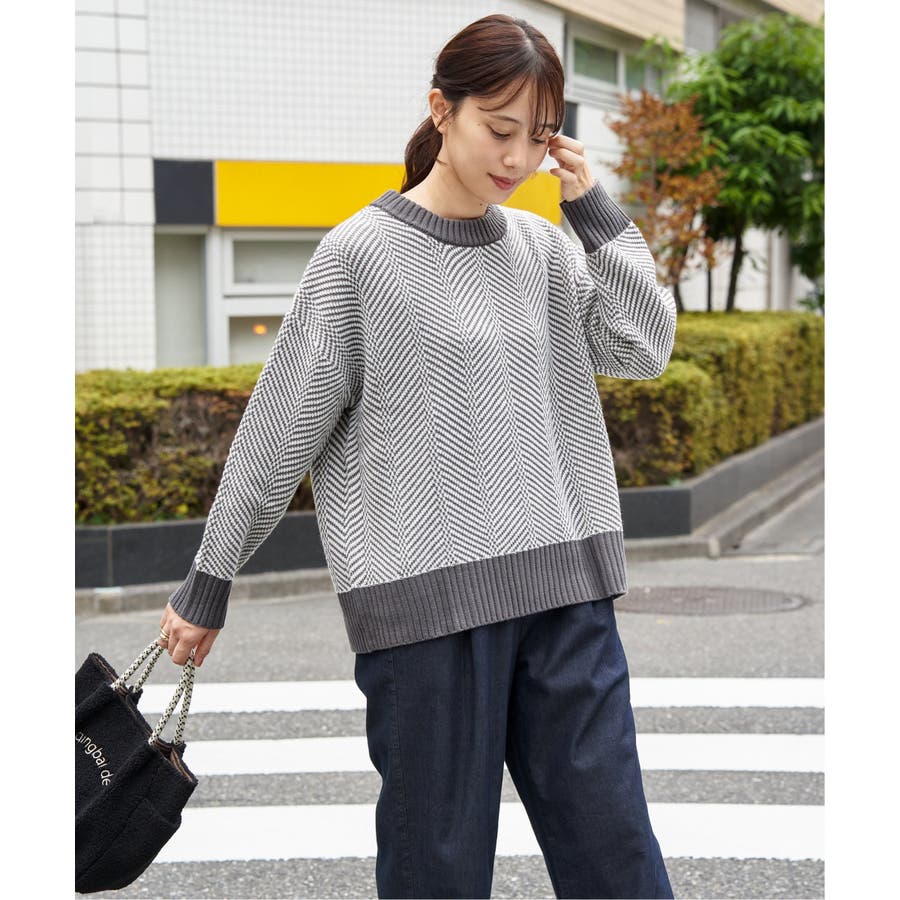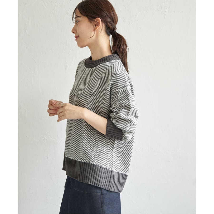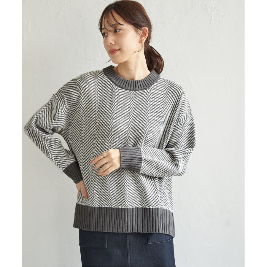 ・スッキリ見え効果のあるヘリンボン柄の配色編みのニット