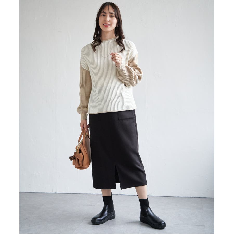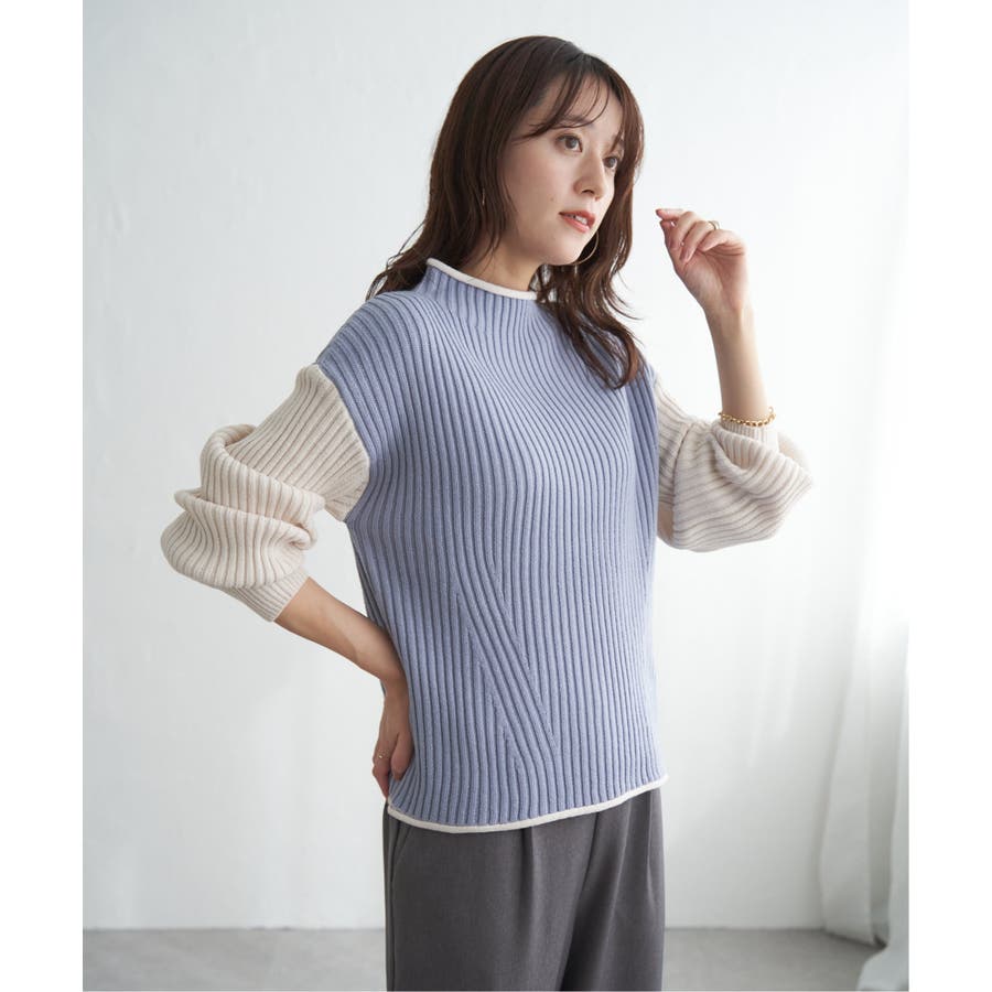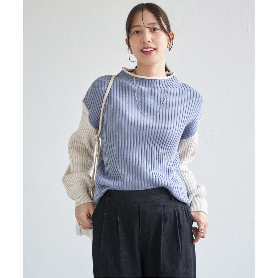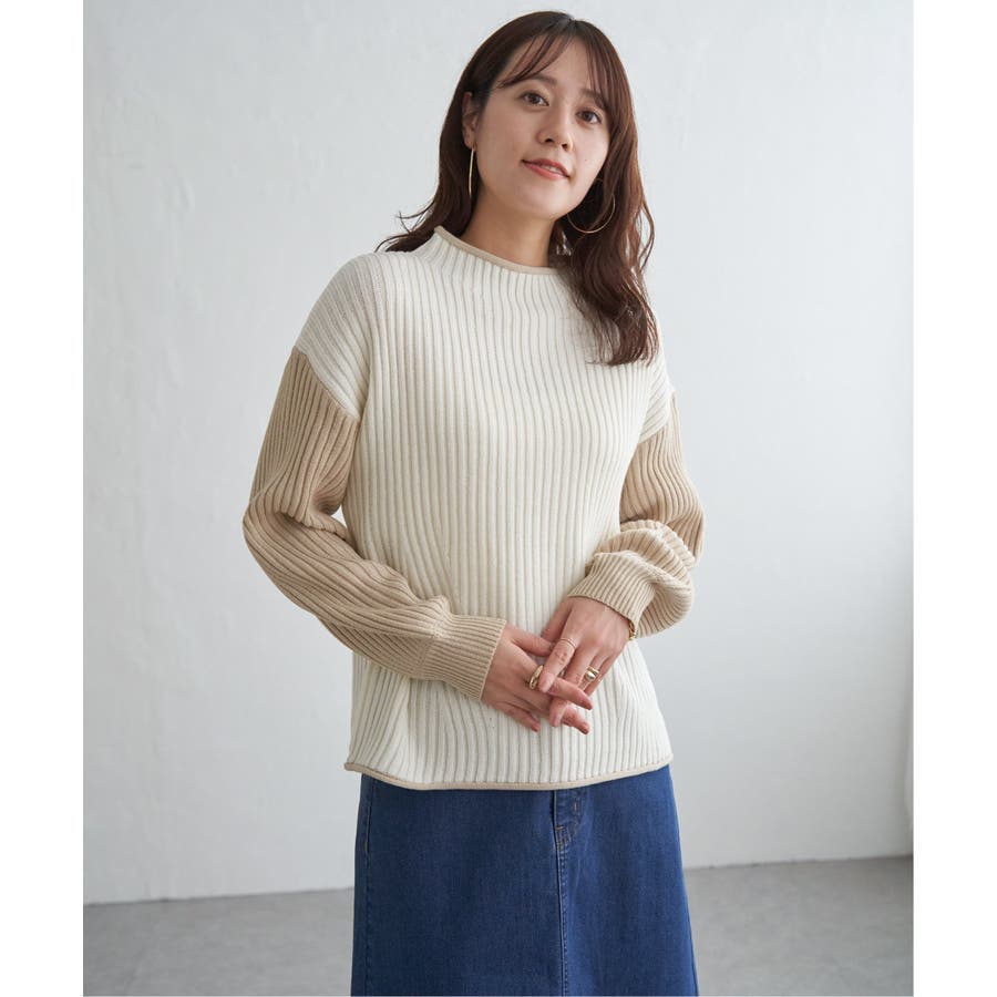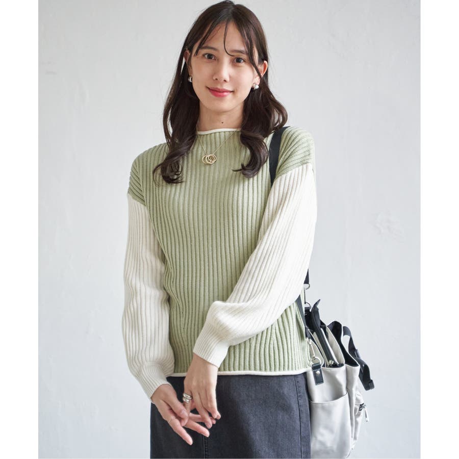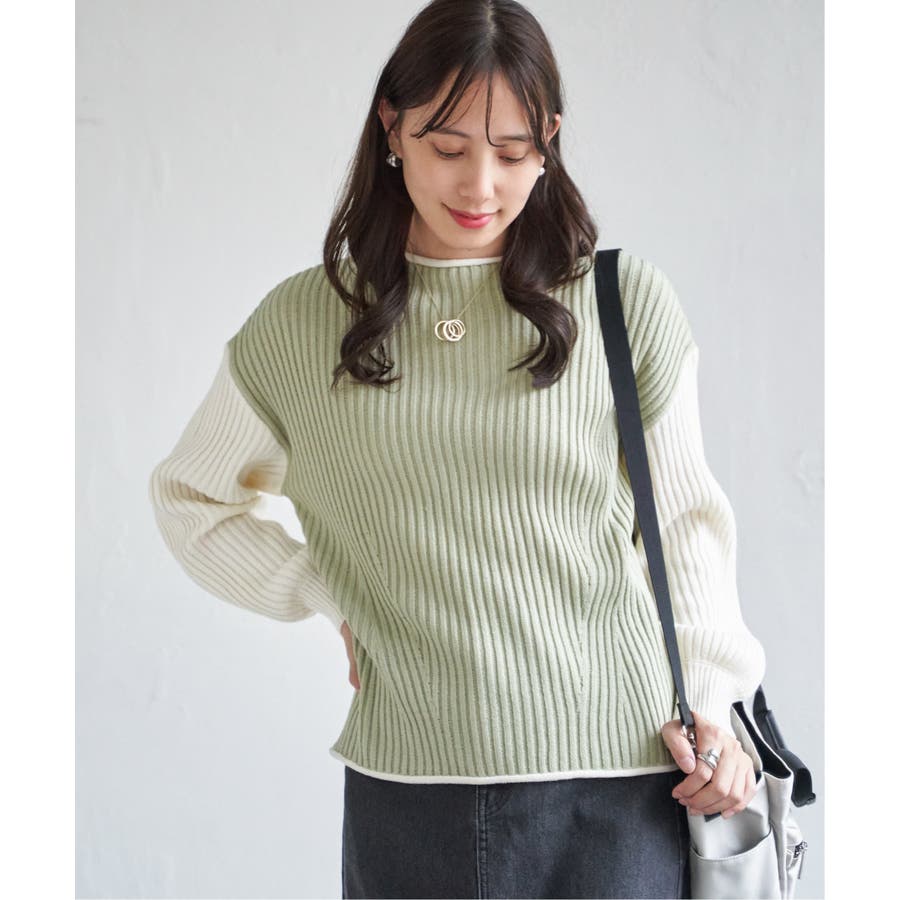 すっきり見えするリブ編みと、アクセントになる袖配色がスタイリングにメリハリを生み出します。