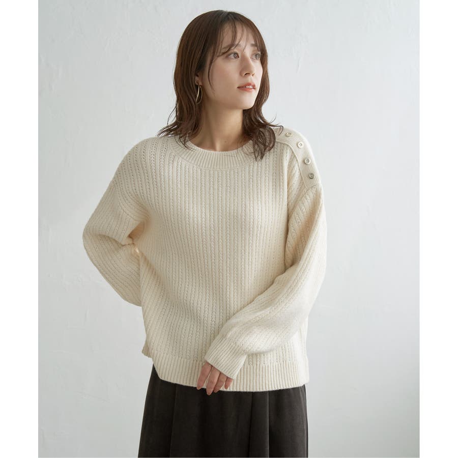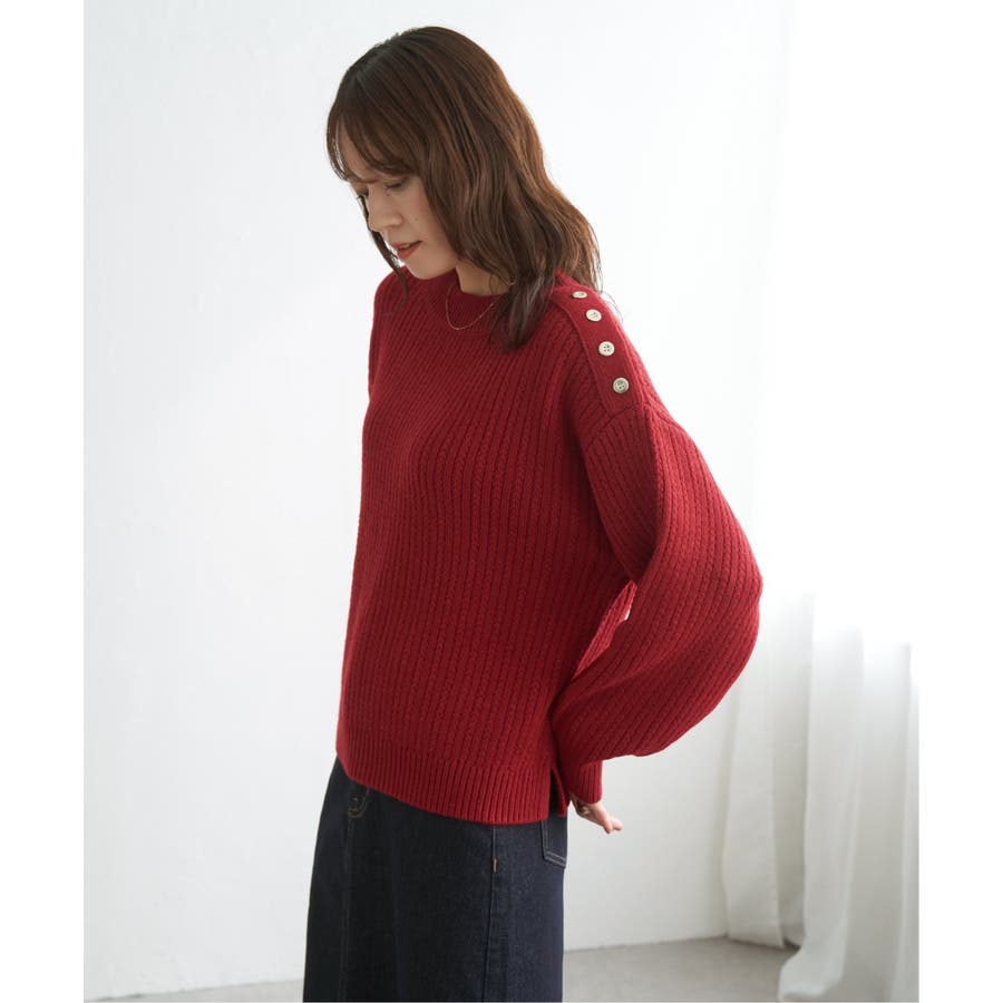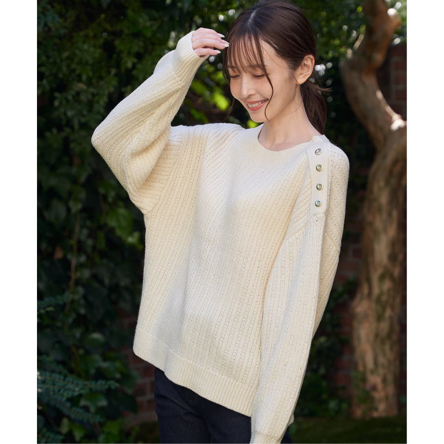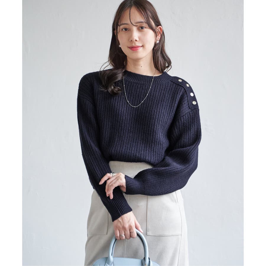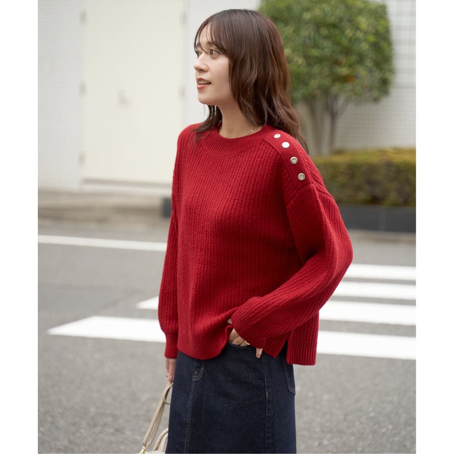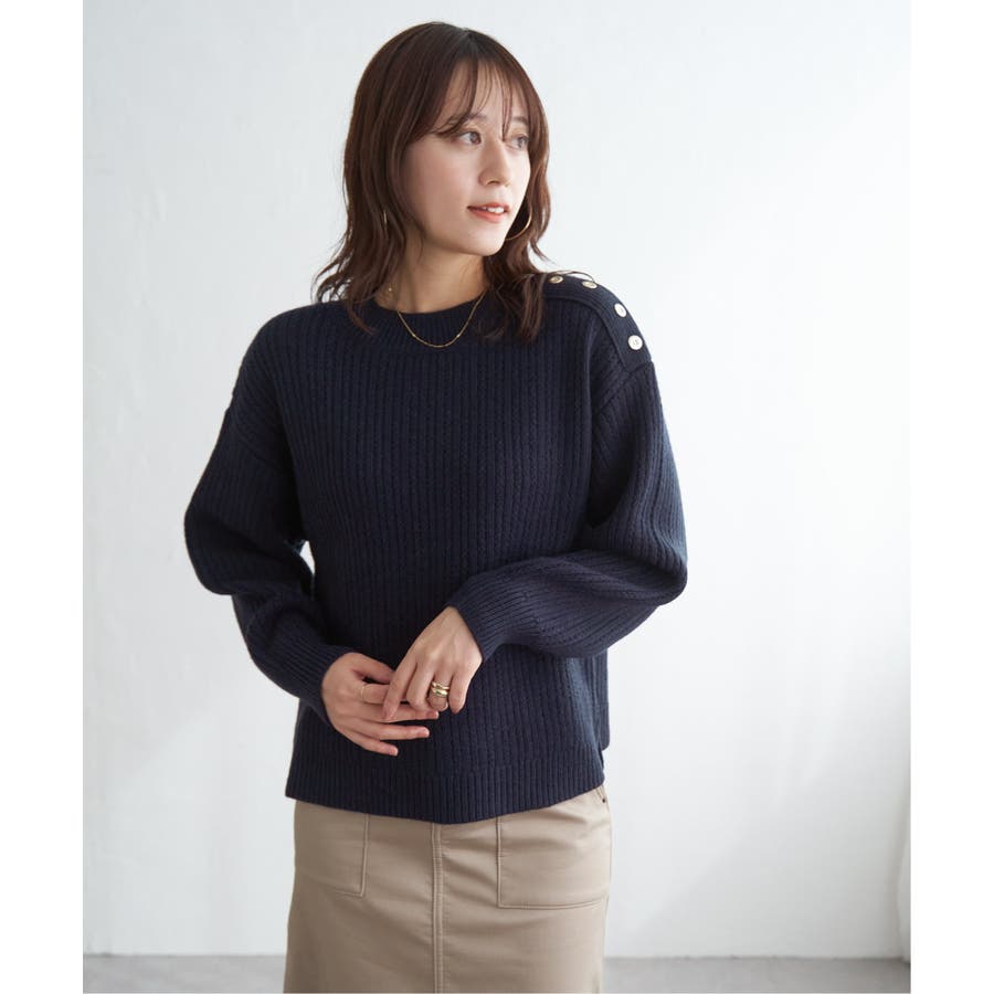 左肩に配したゴールドカラーボタンが目を引く、クラシックな雰囲気の変形リブニットプルオーバー。