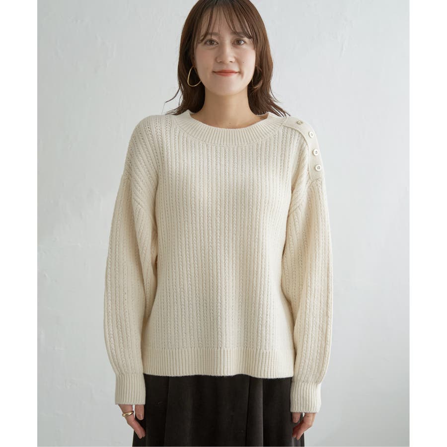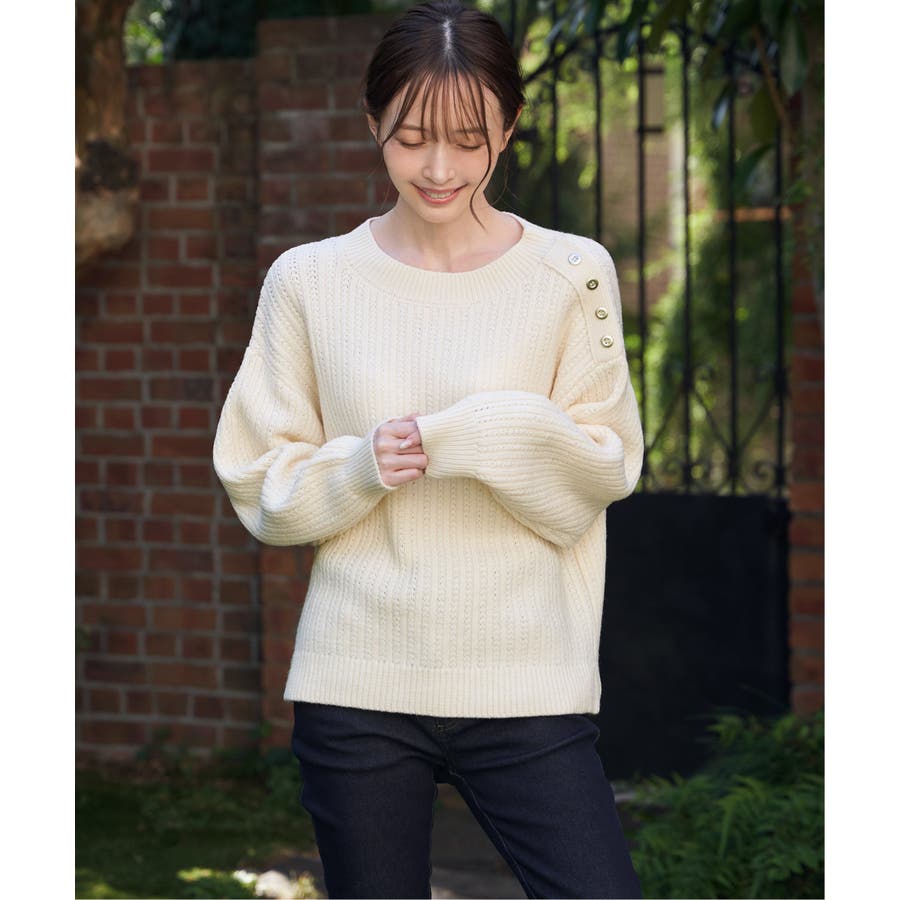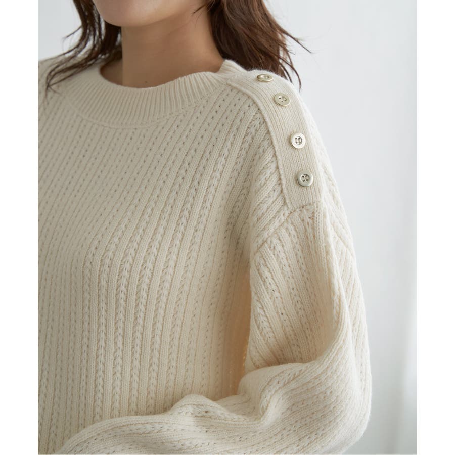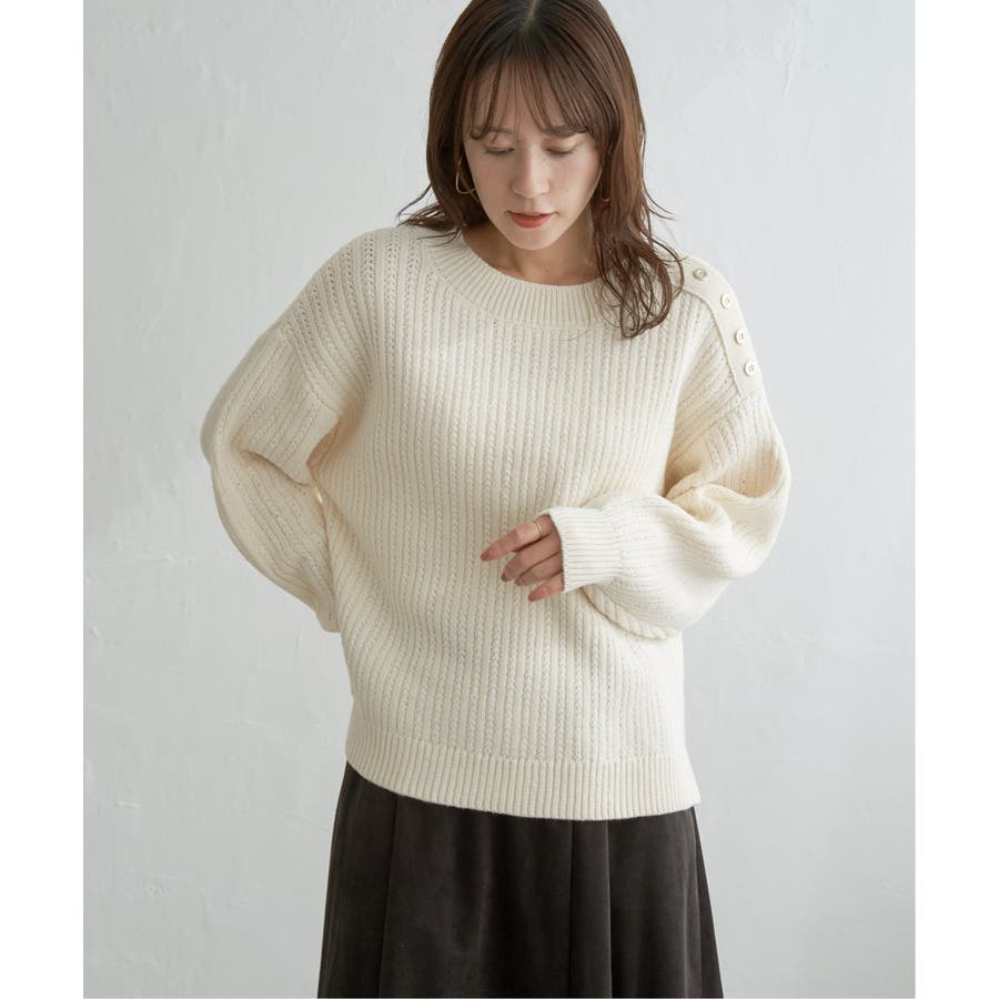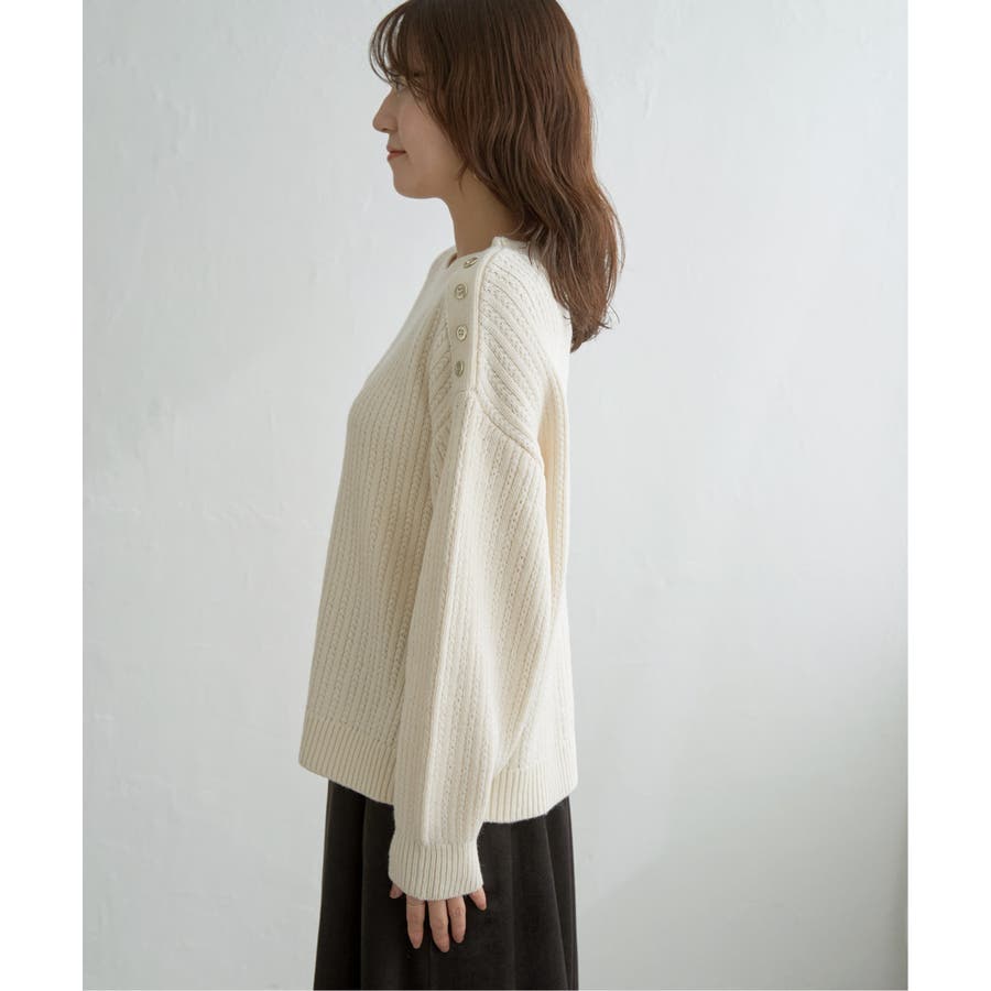 左肩に配したゴールドカラーボタンが目を引く、クラシックな雰囲気の変形リブニットプルオーバー。