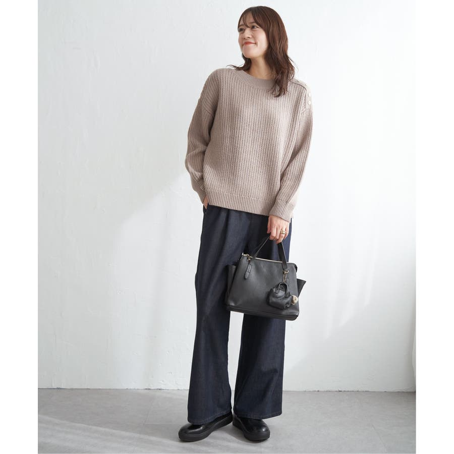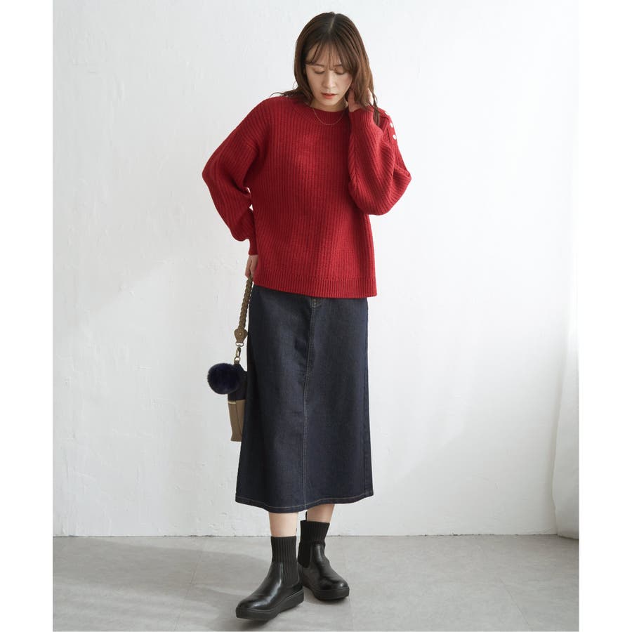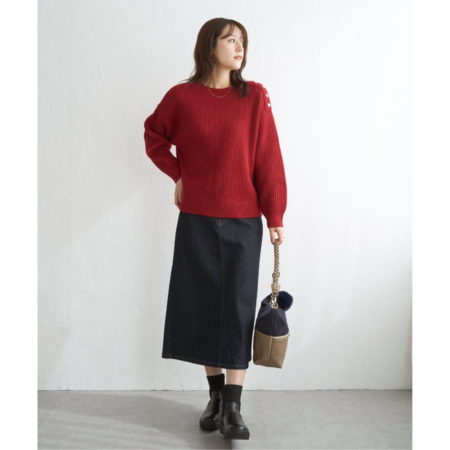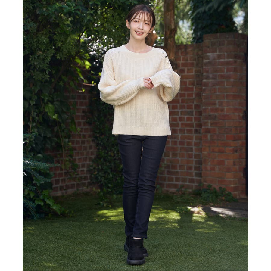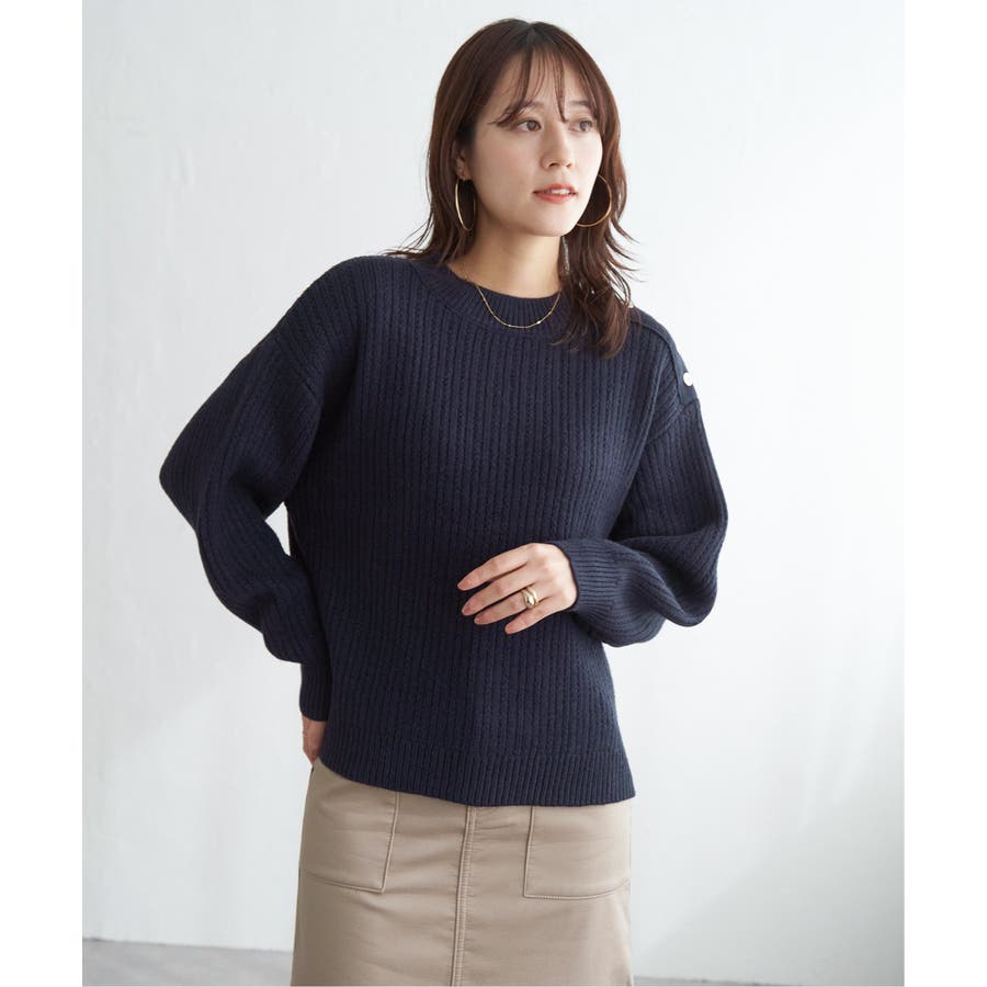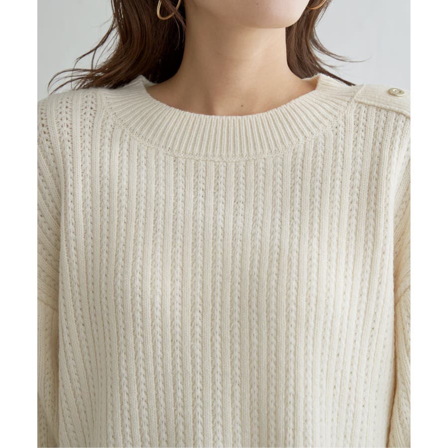 左肩に配したゴールドカラーボタンが目を引く、クラシックな雰囲気の変形リブニットプルオーバー。