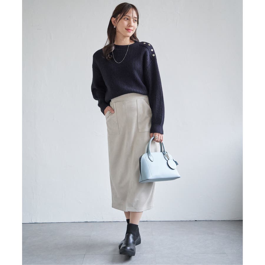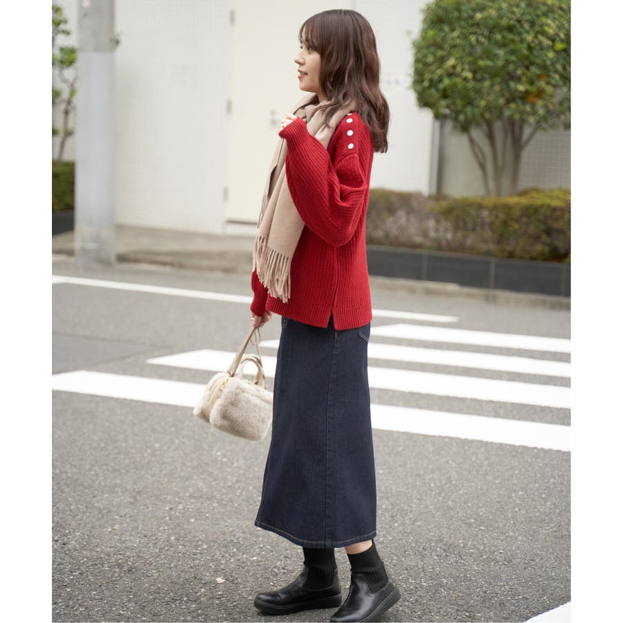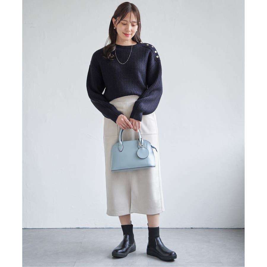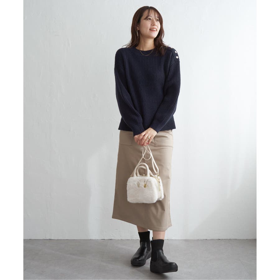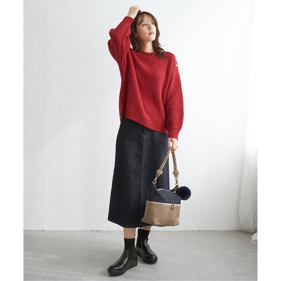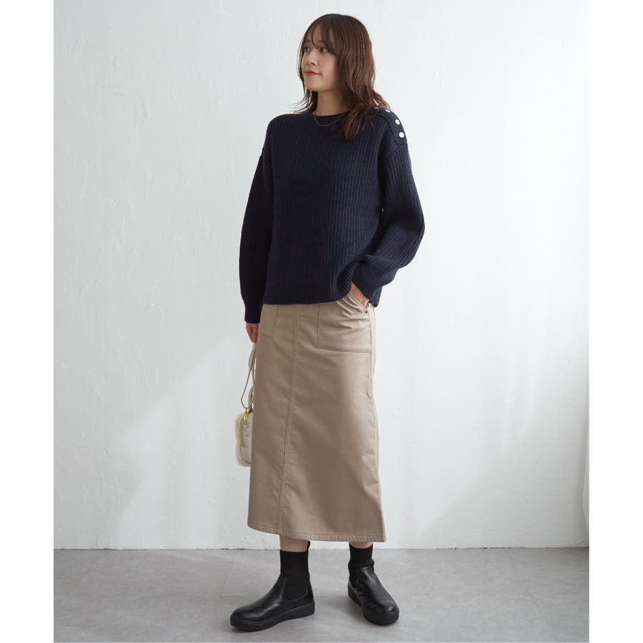 左肩に配したゴールドカラーボタンが目を引く、クラシックな雰囲気の変形リブニットプルオーバー。