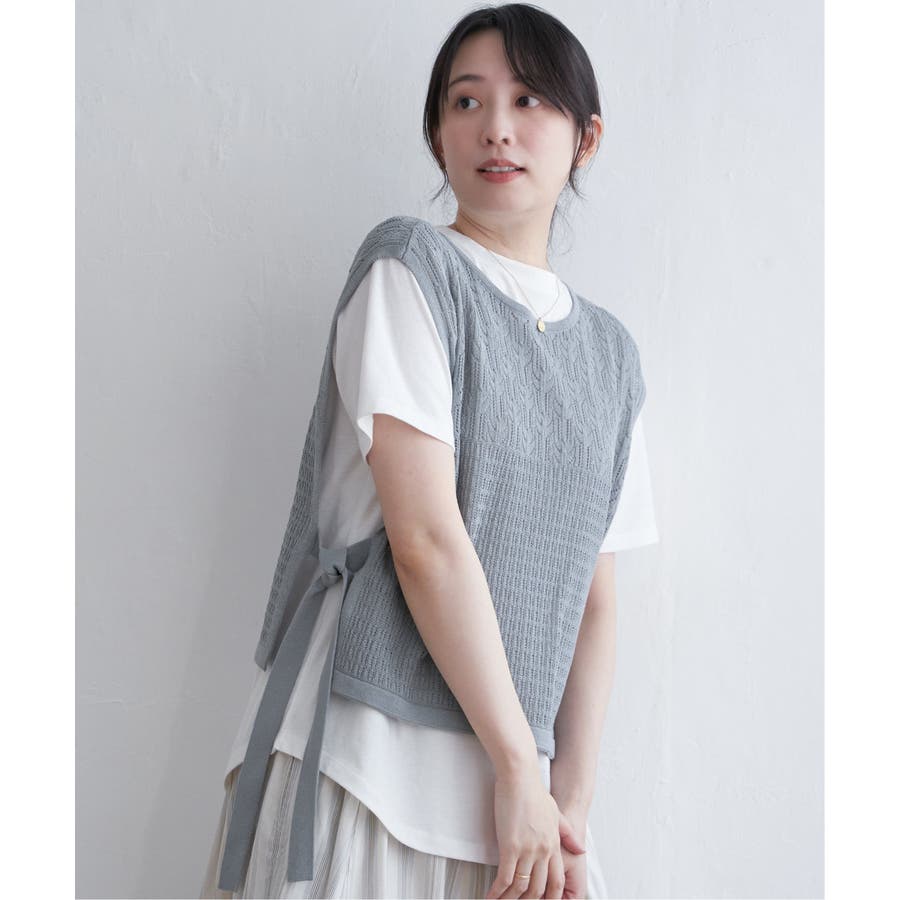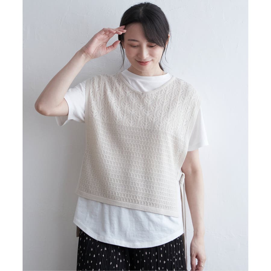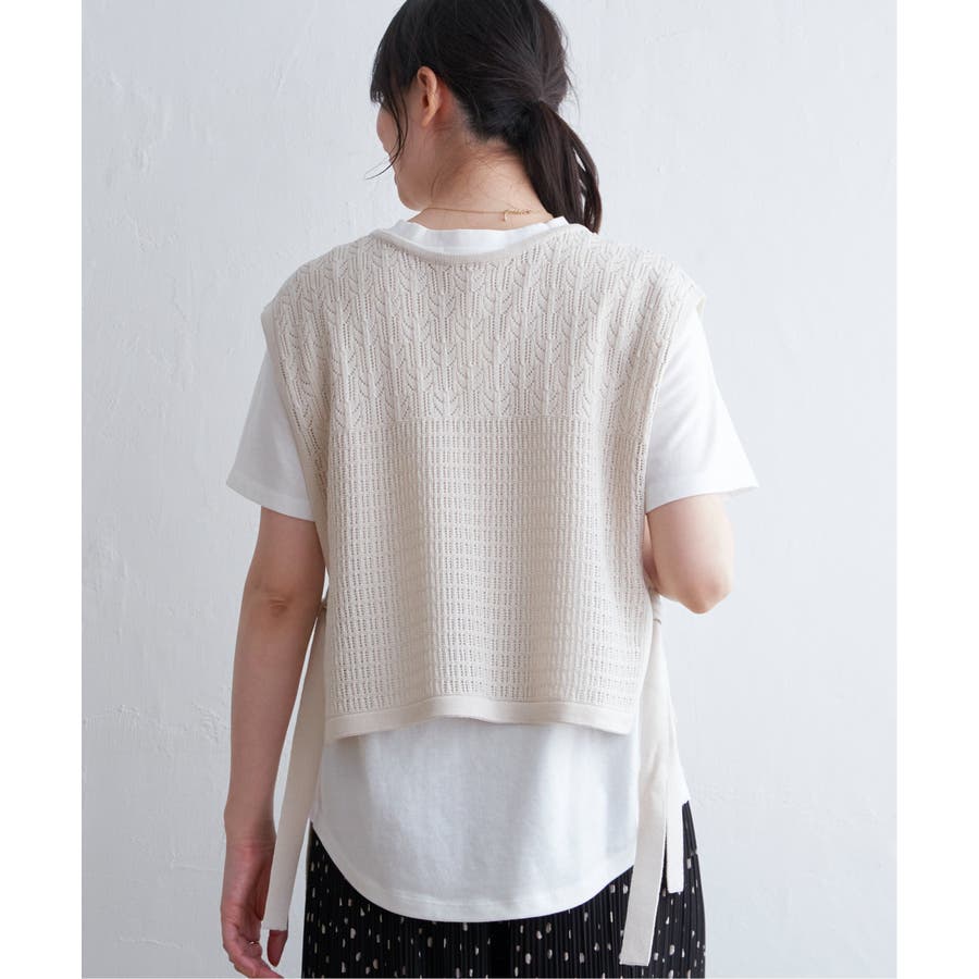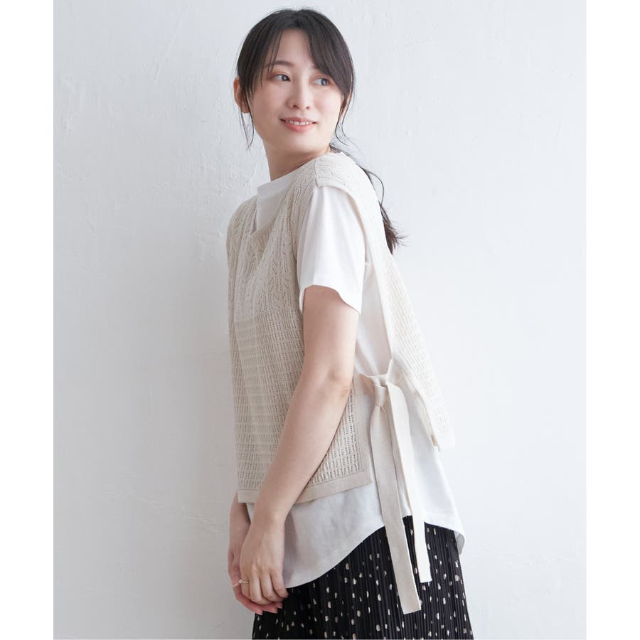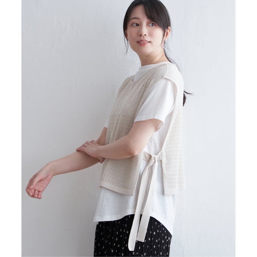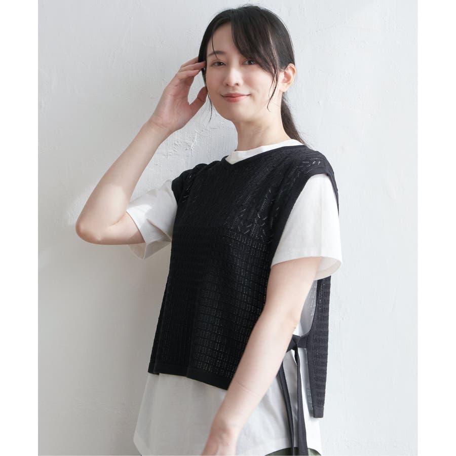ニットベストは、バストから上が透かし編みになっているので、ほどよいシアー感があり大人でも着やすいニットベストです。