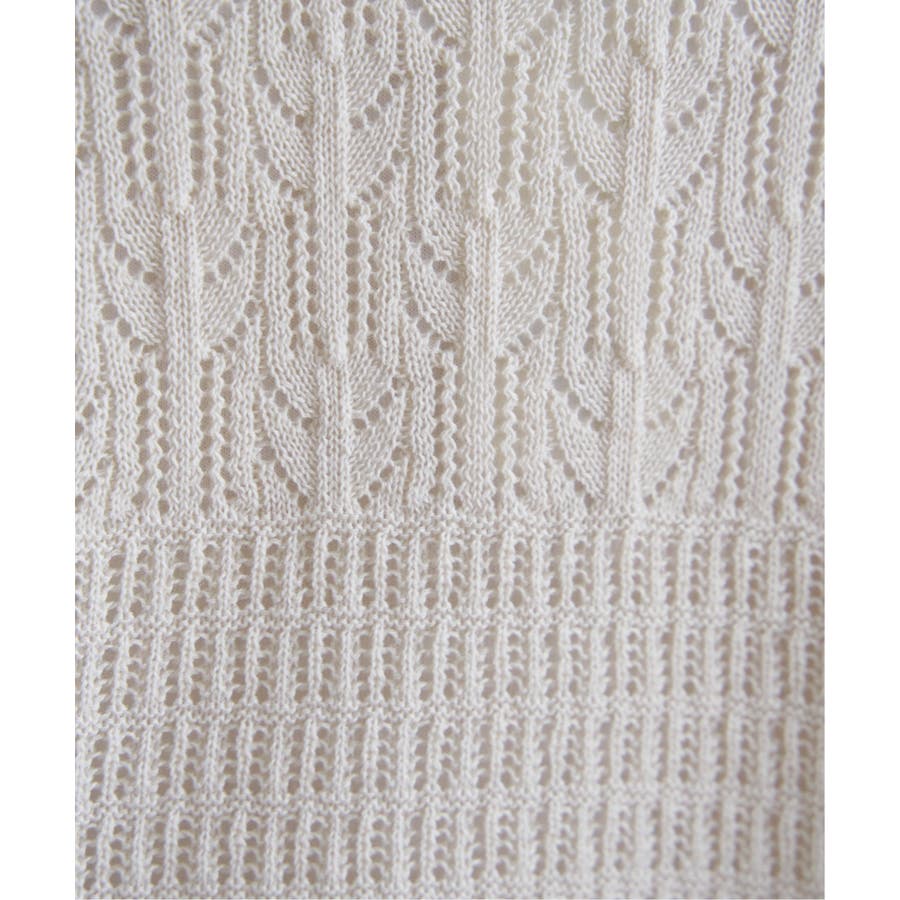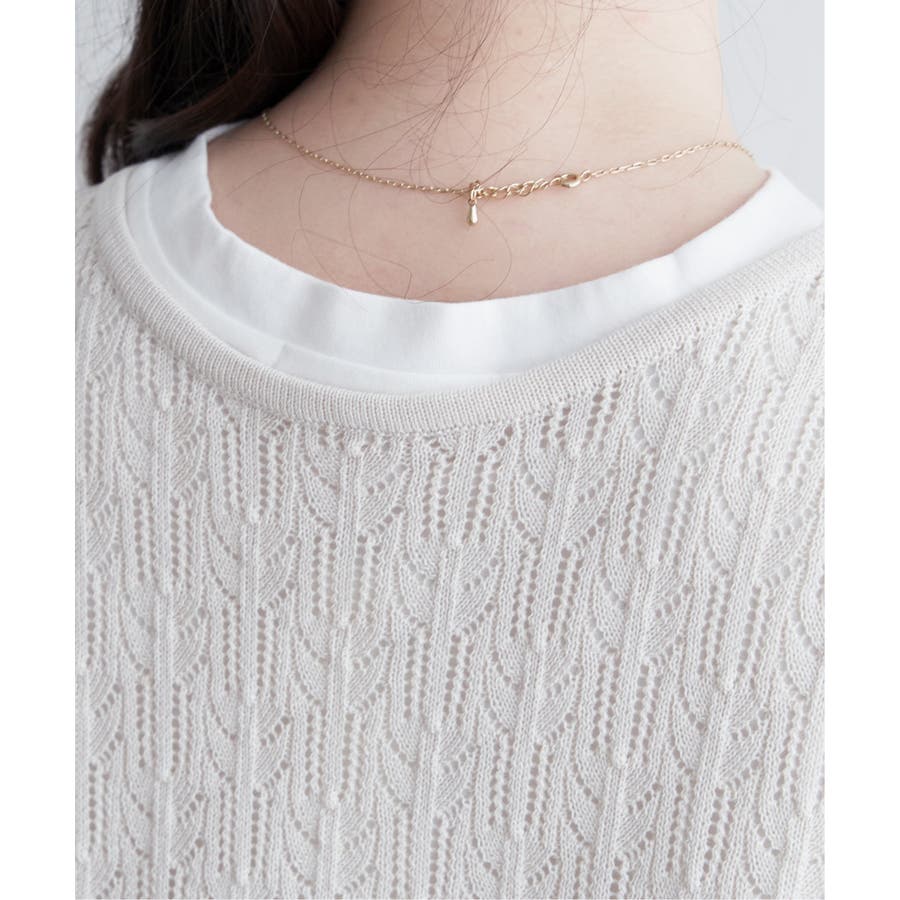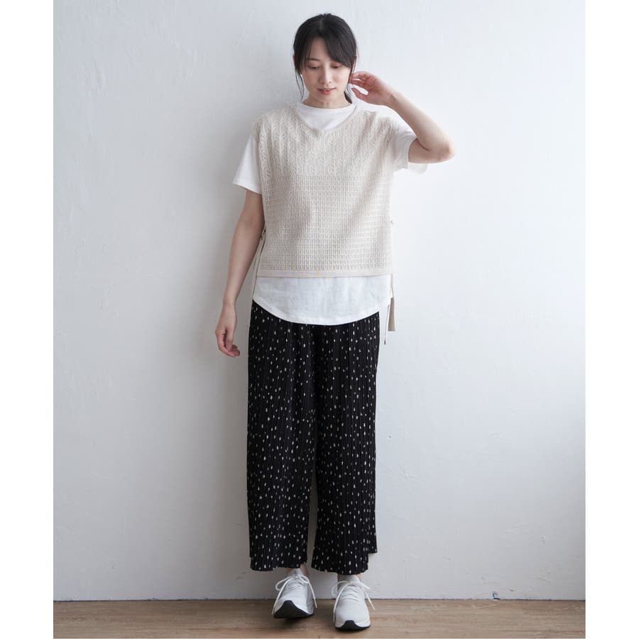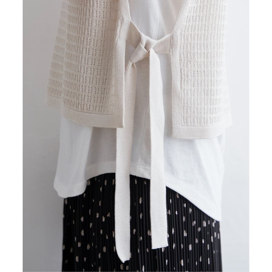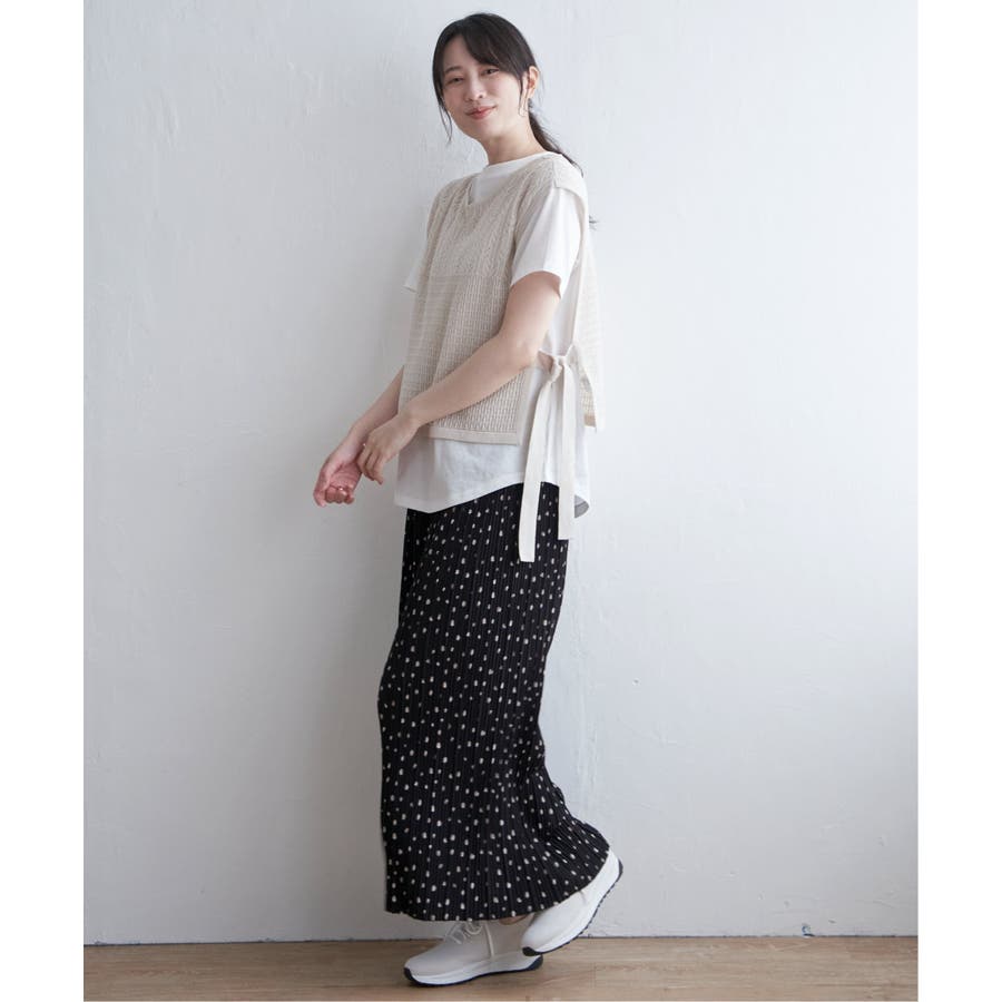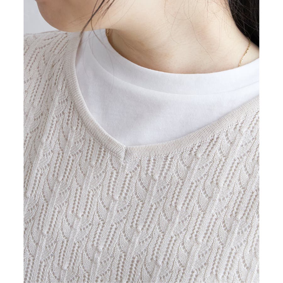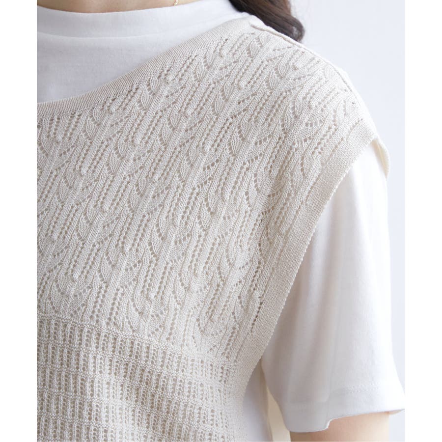 ニットベストは、バストから上が透かし編みになっているので、ほどよいシアー感があり大人でも着やすいニットベストです。