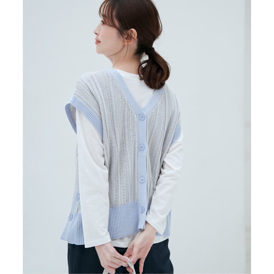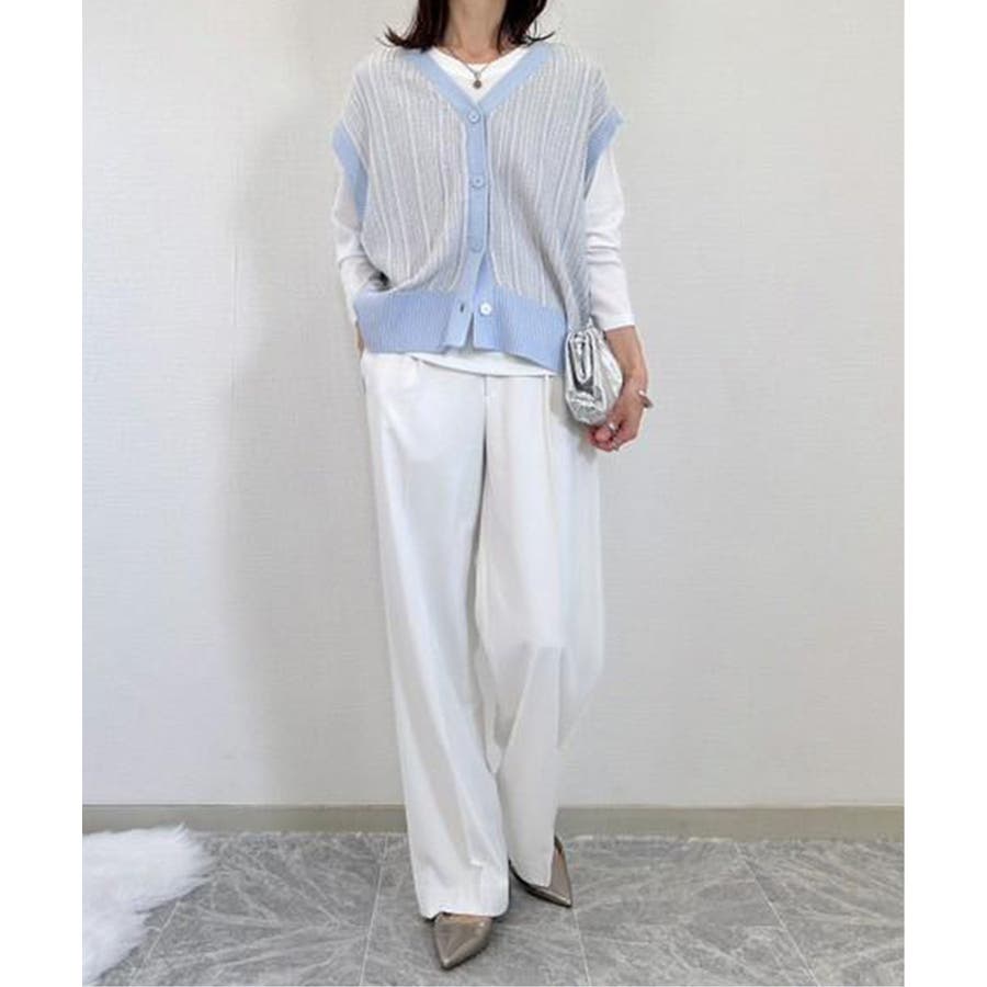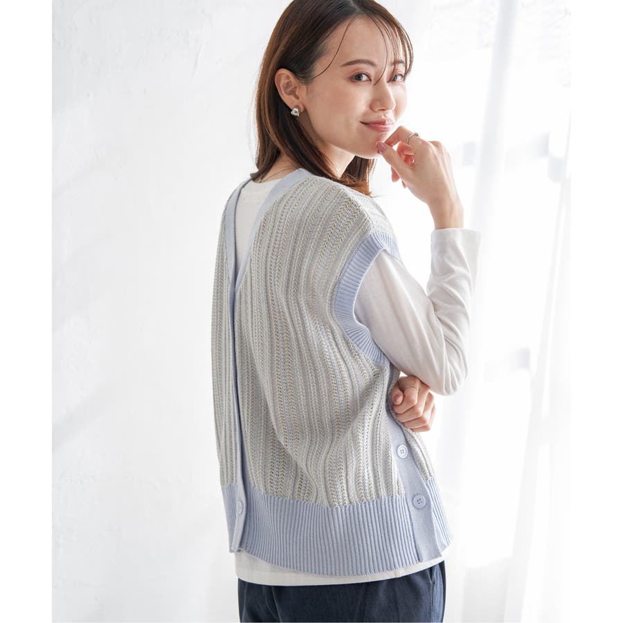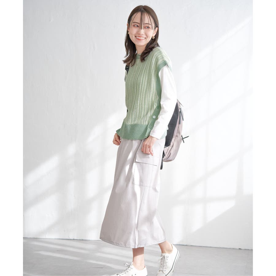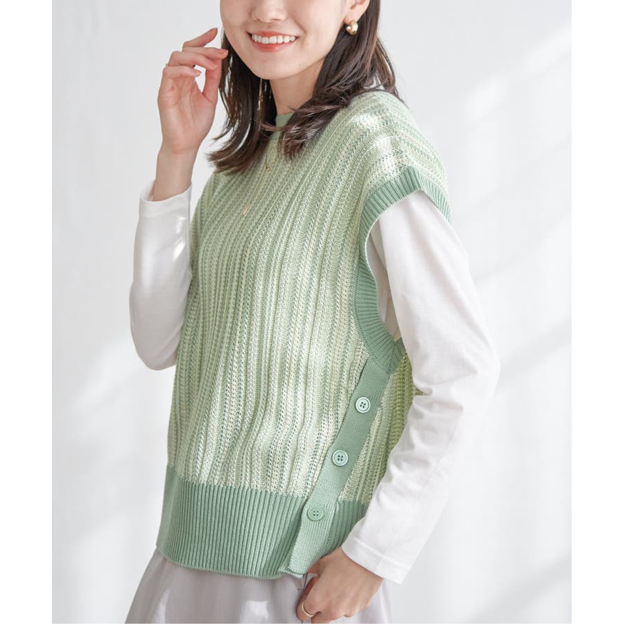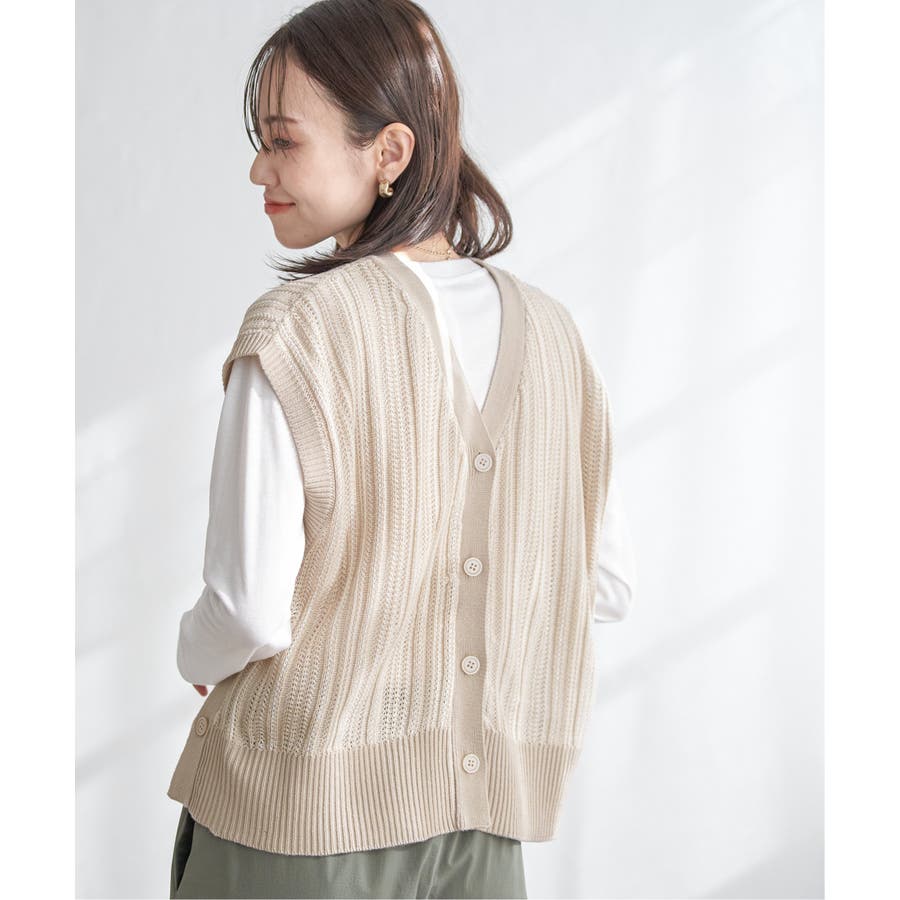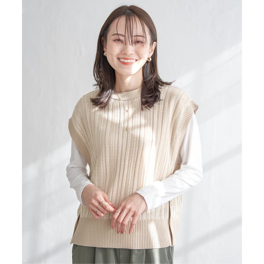 ニットベストは前後どちらでも着られる2WAYデザインで、ボタンをサイドに見せるとこなれ感のあるスタイルが完成します。