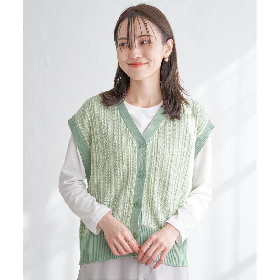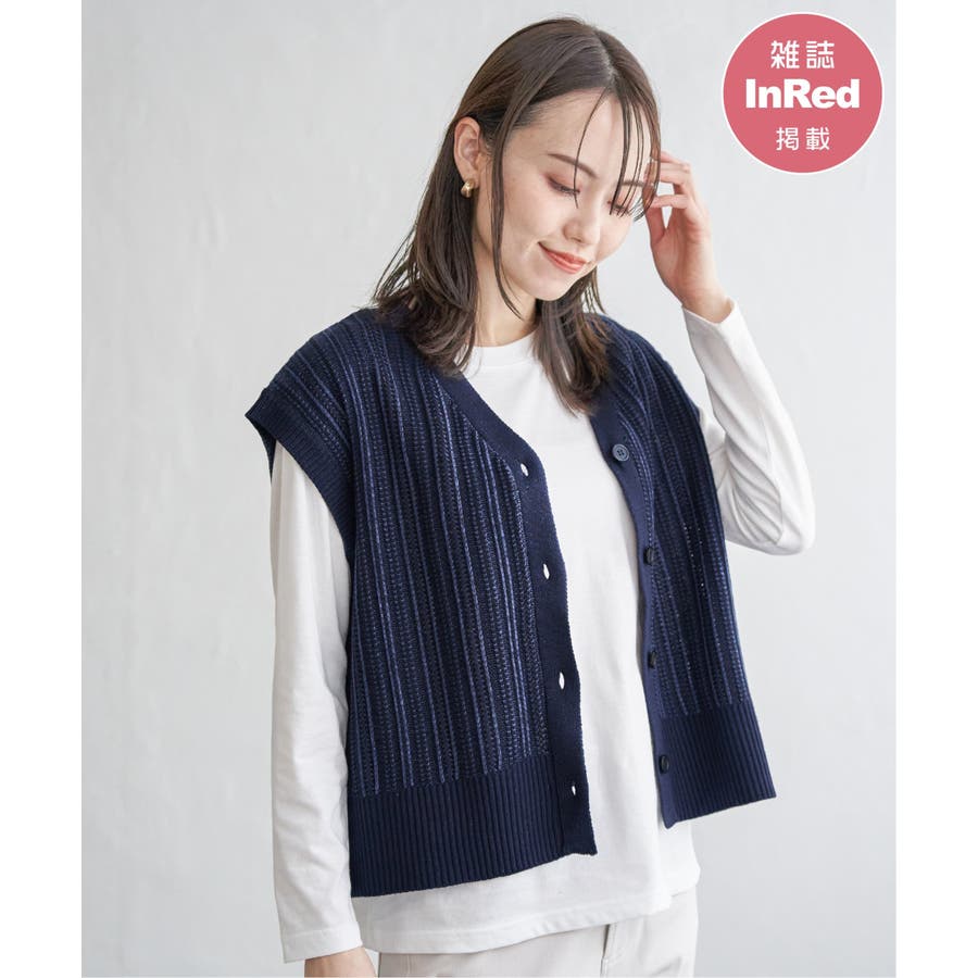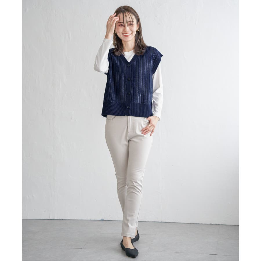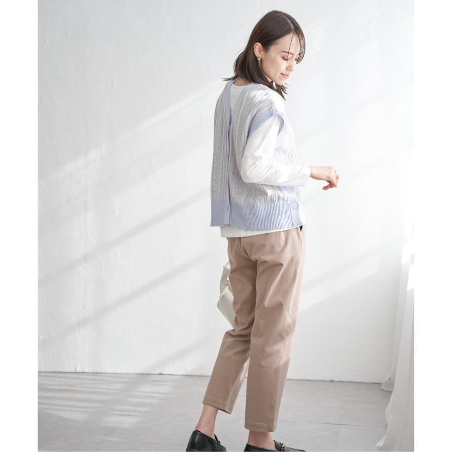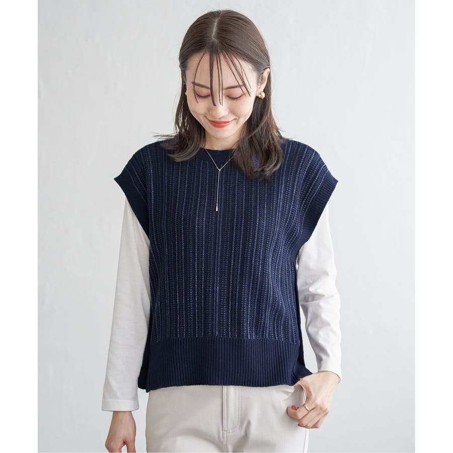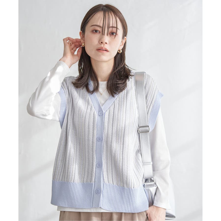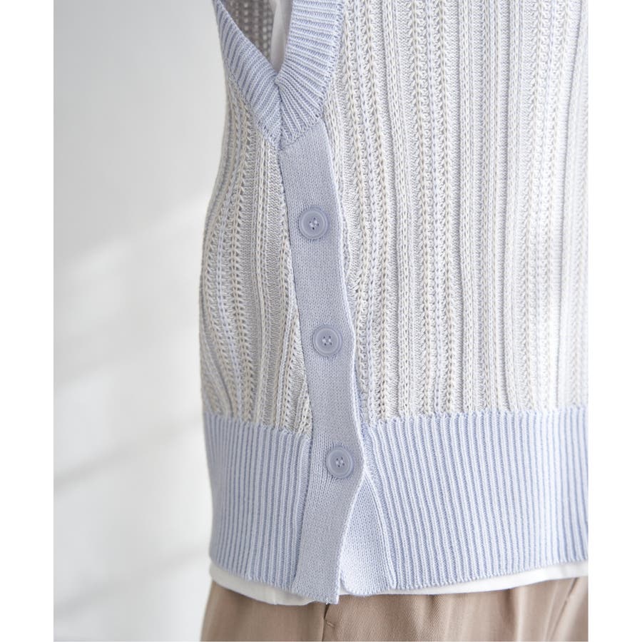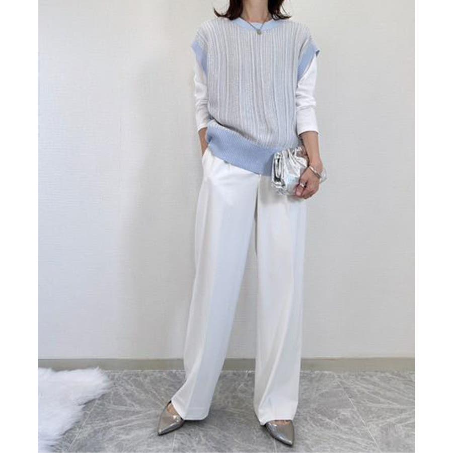 ニットベストは前後どちらでも着られる2WAYデザインで、ボタンをサイドに見せるとこなれ感のあるスタイルが完成します。