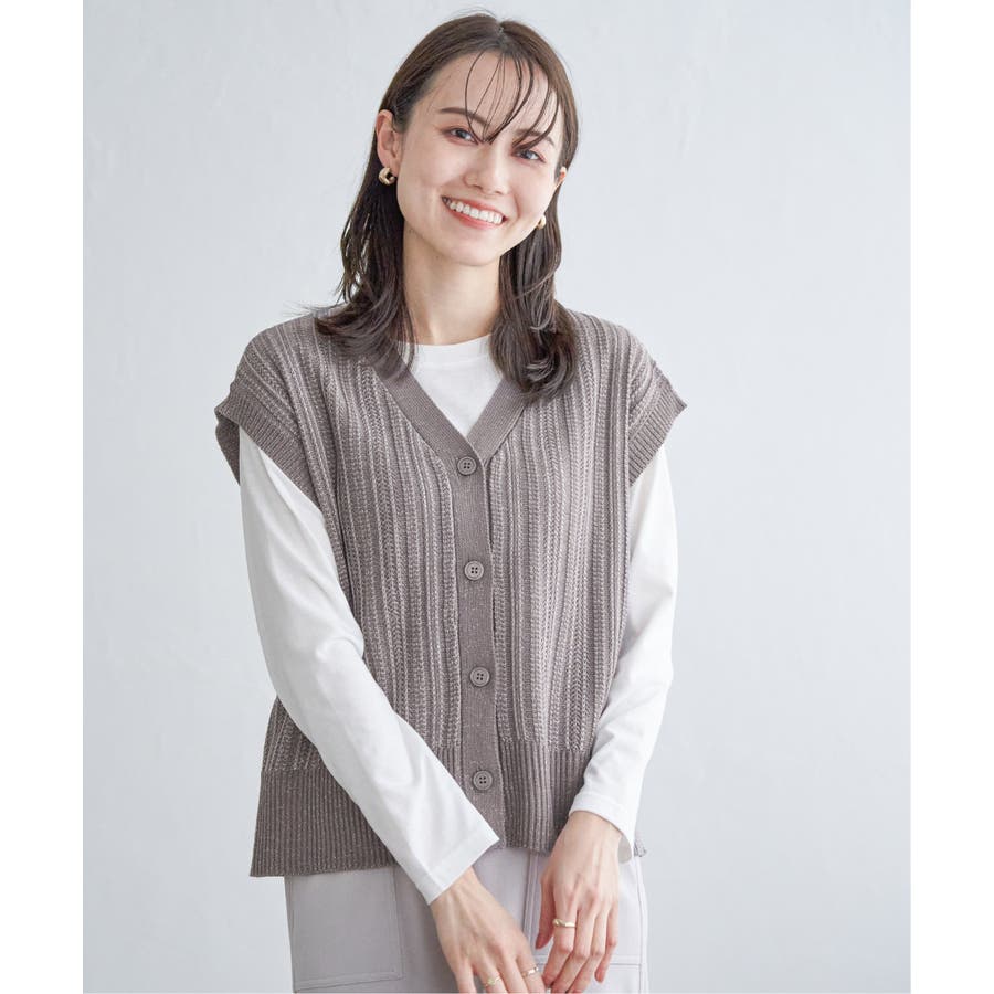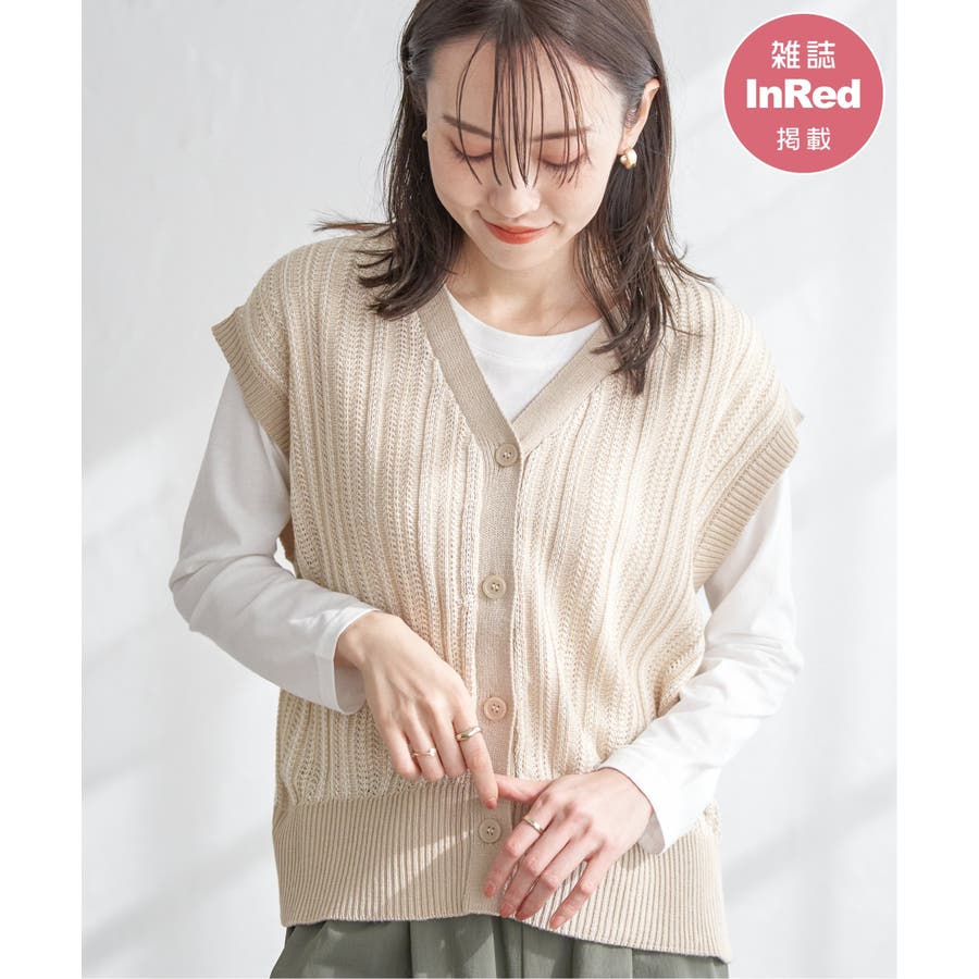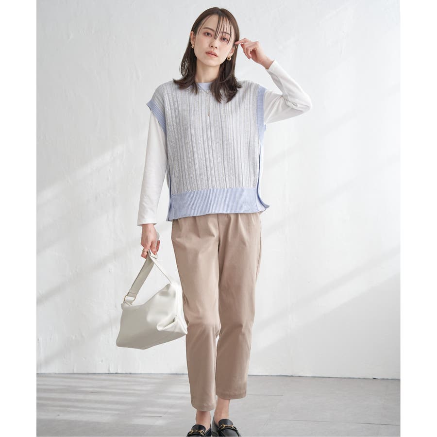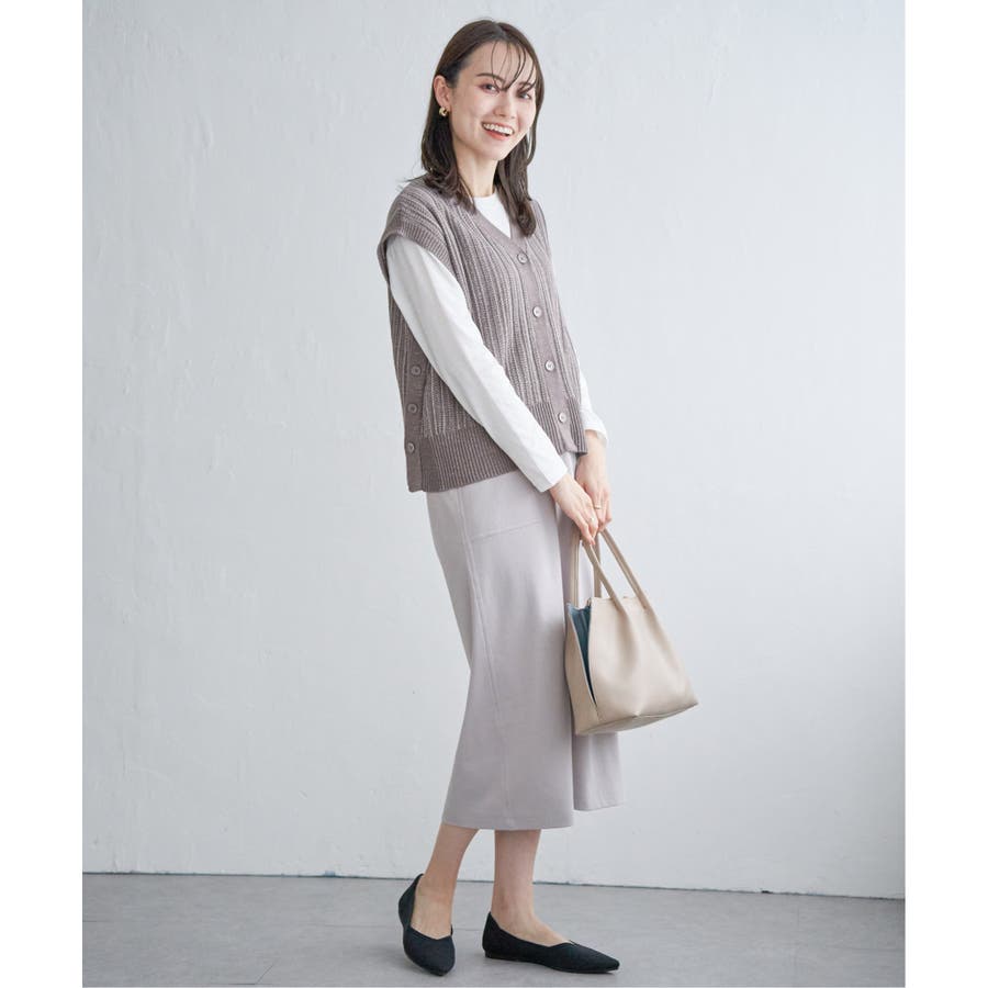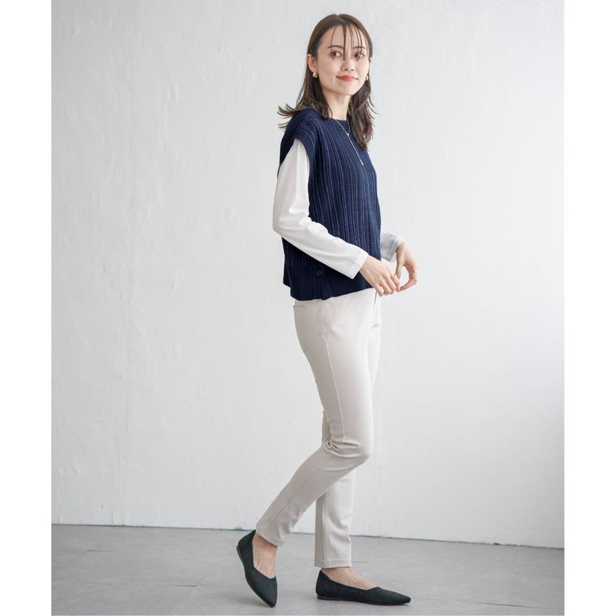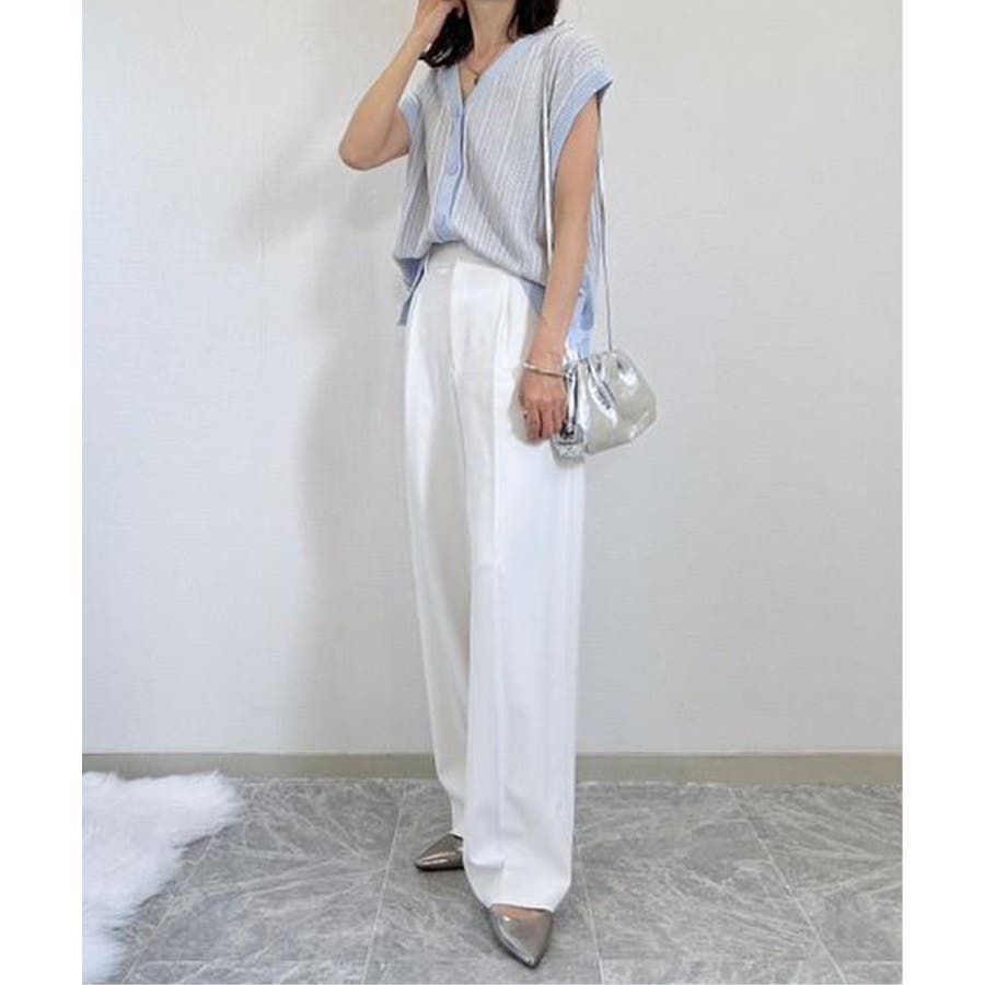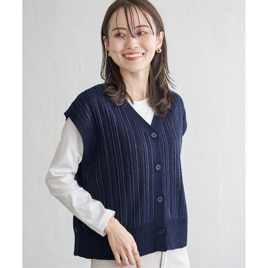 ニットベストは前後どちらでも着られる2WAYデザインで、ボタンをサイドに見せるとこなれ感のあるスタイルが完成します。