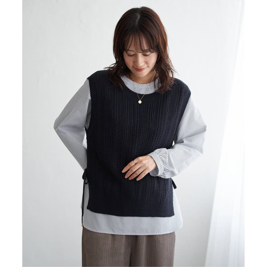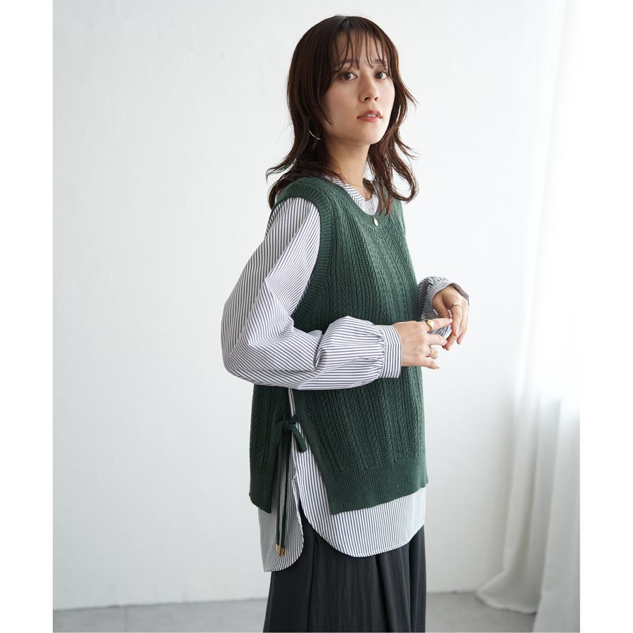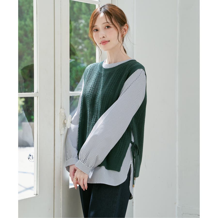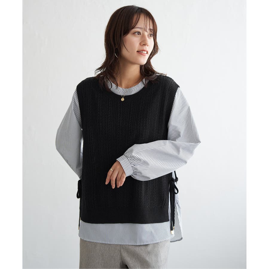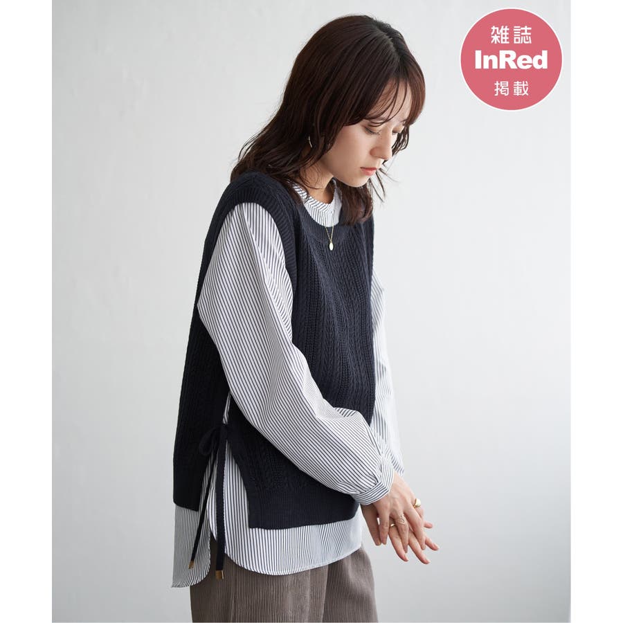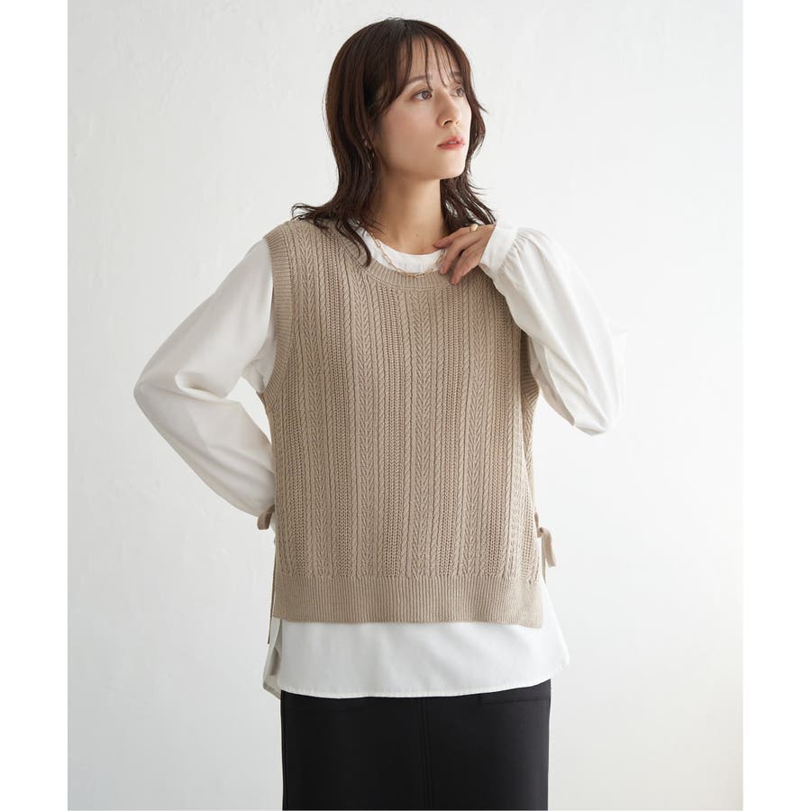 サイドにリボンディテールをあしらったニットベストと、シャツブラウスがセットになったアイテムです。