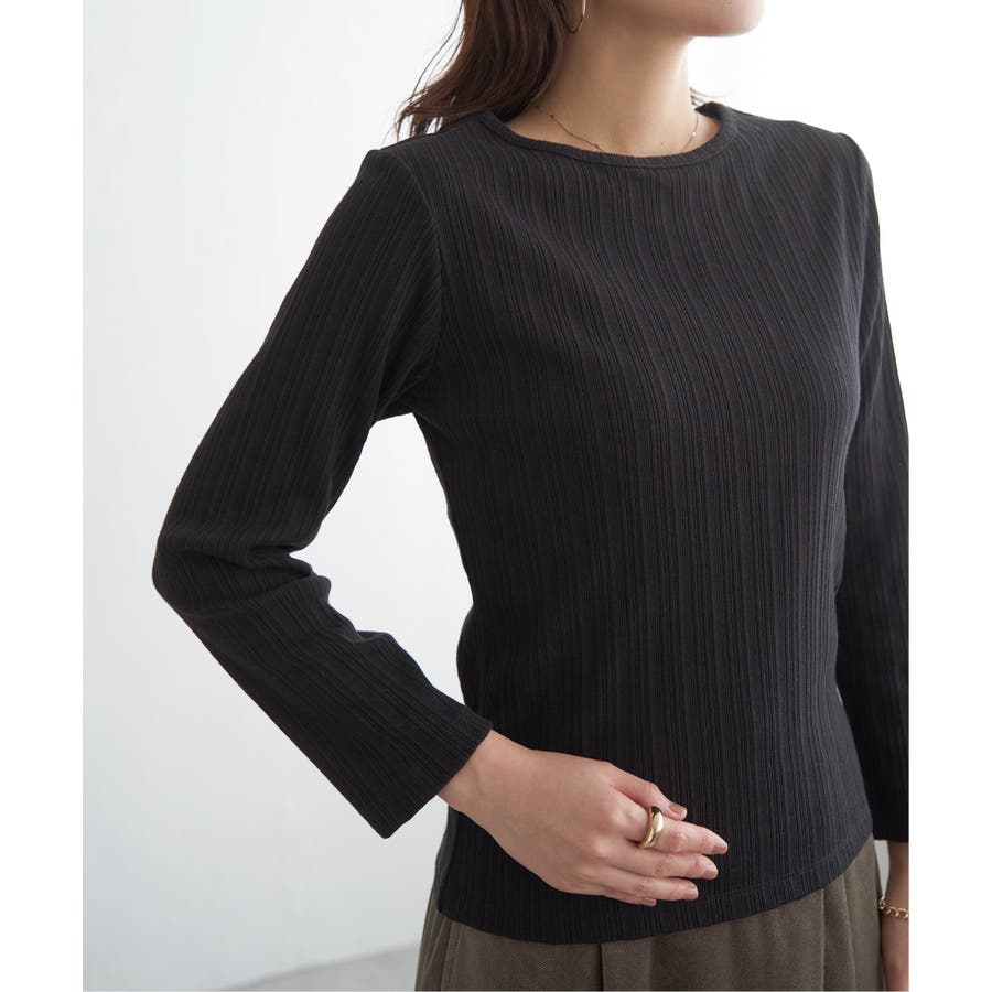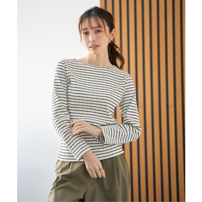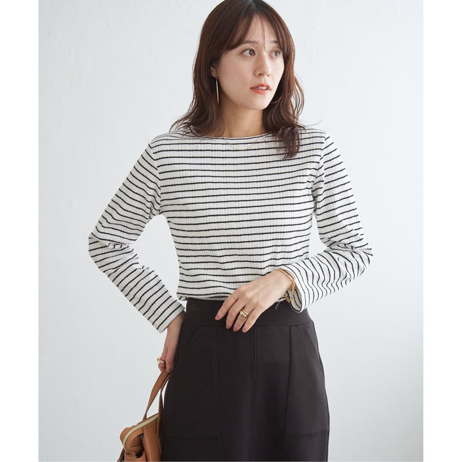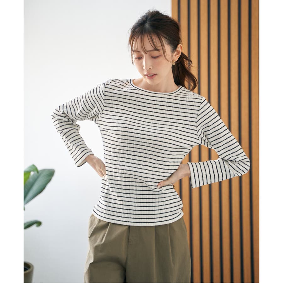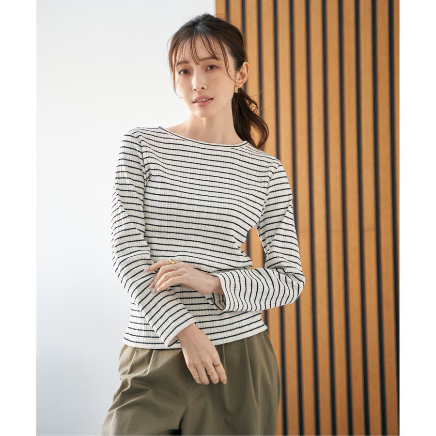ストライプのジャガード生地でスッキリ見えするプルオーバー。