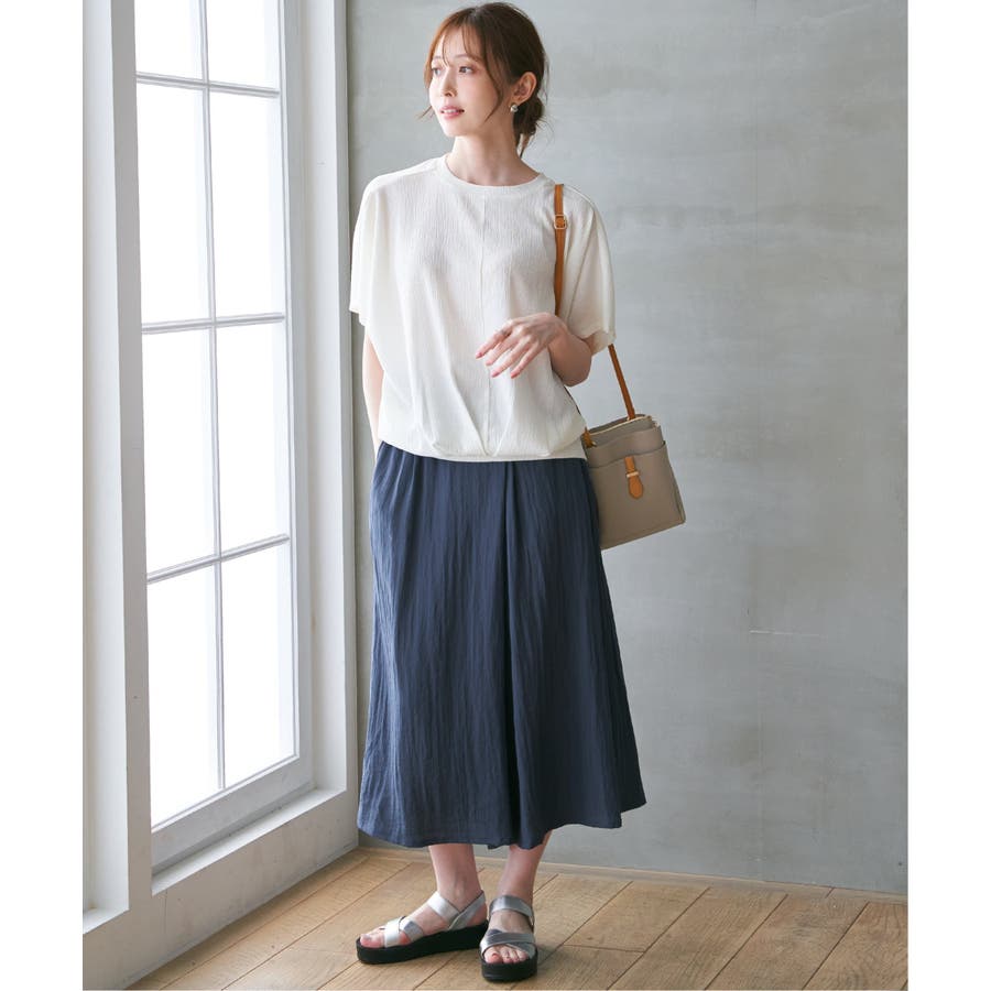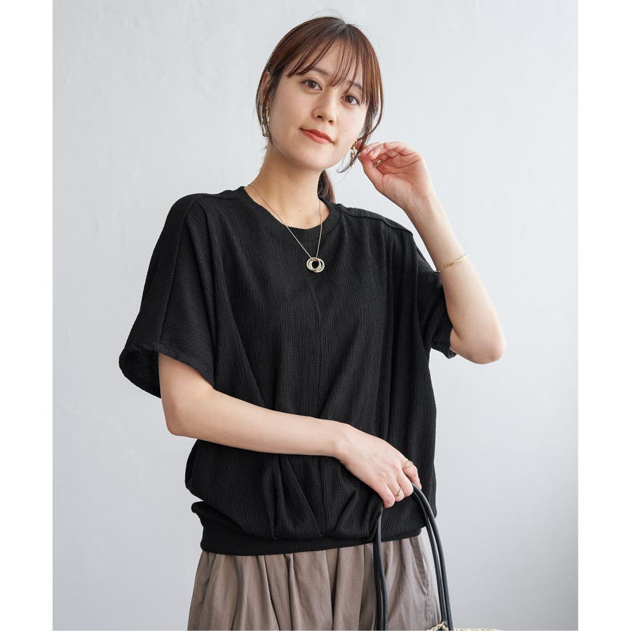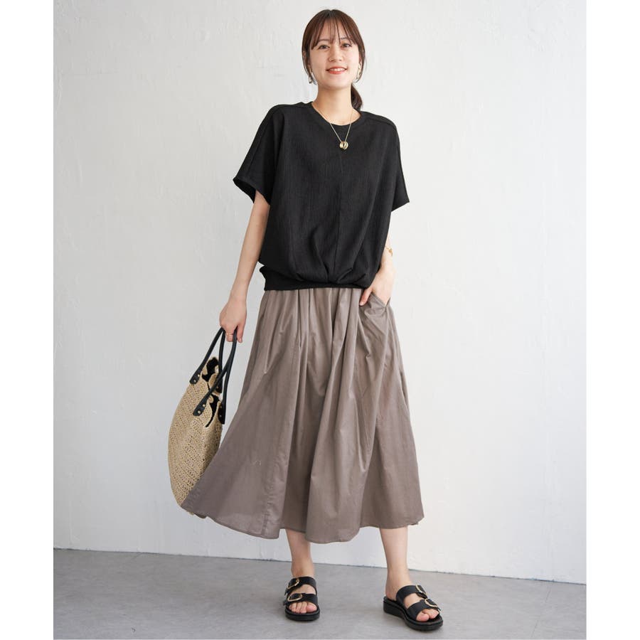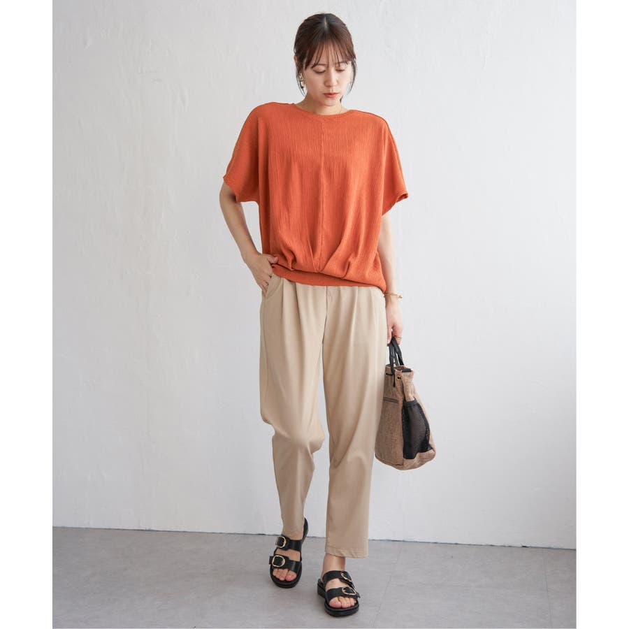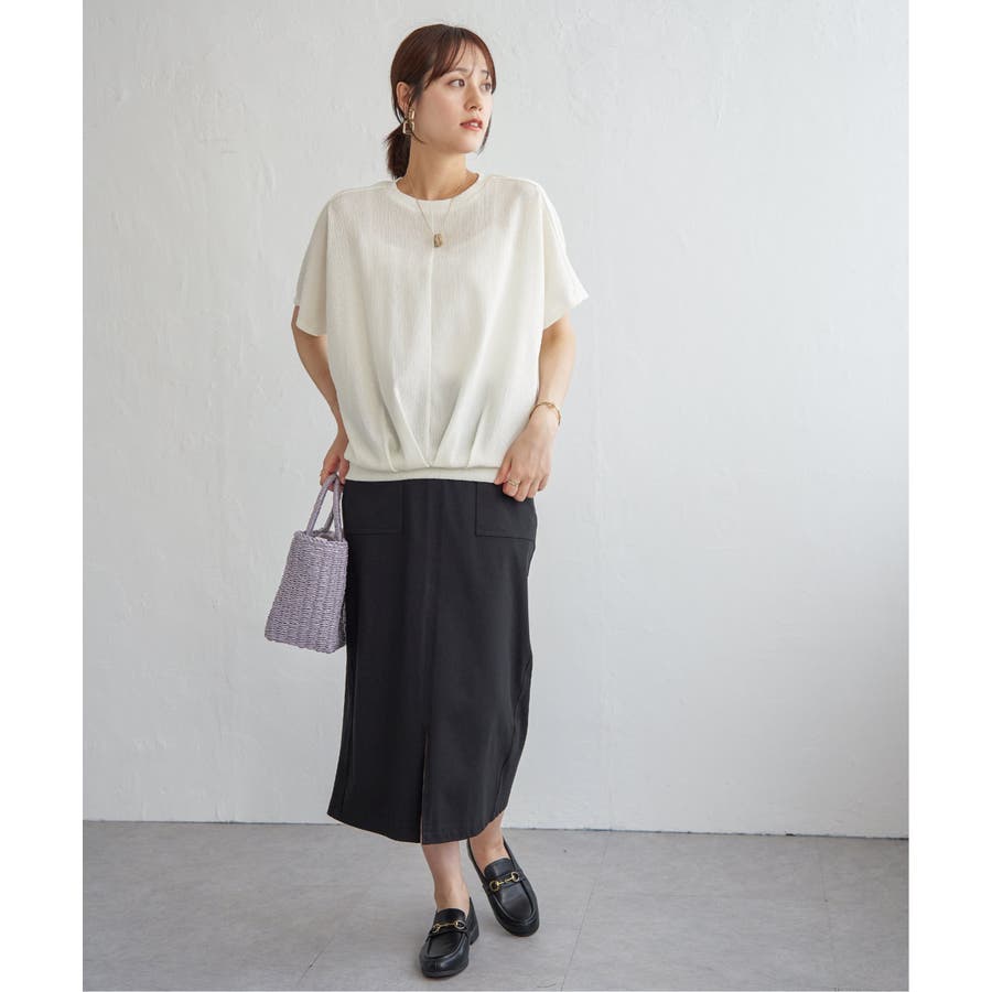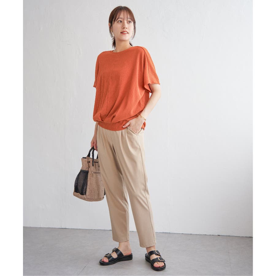裾に大きめのタックを入れることでタックイン風に見え、二の腕カバーできるドルマン袖のトップス。