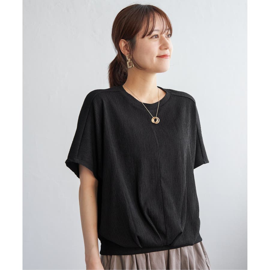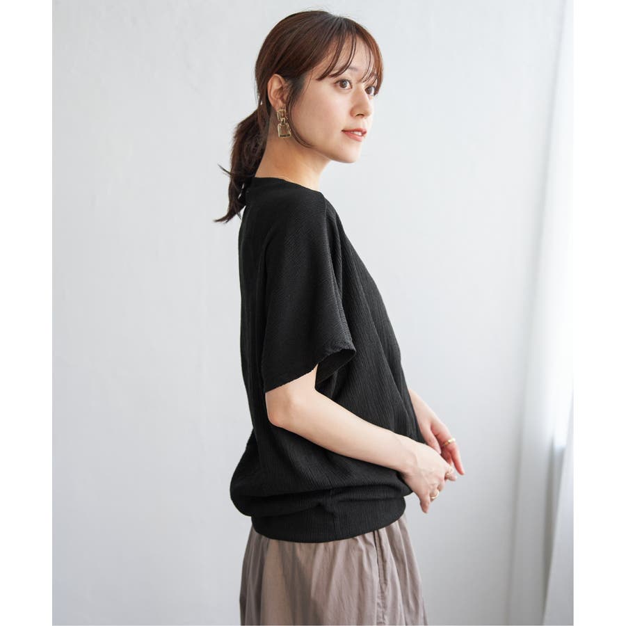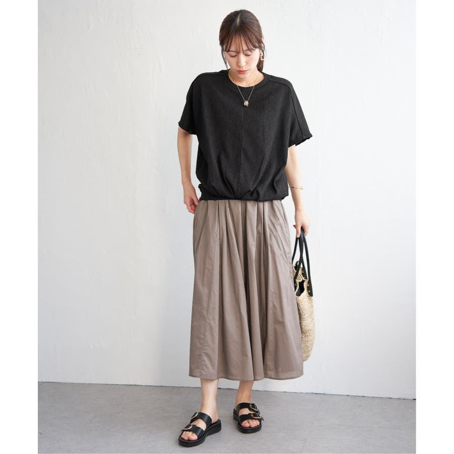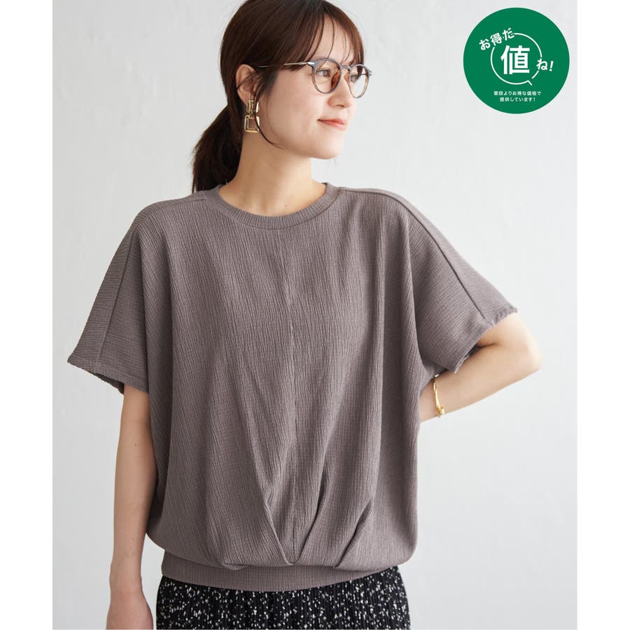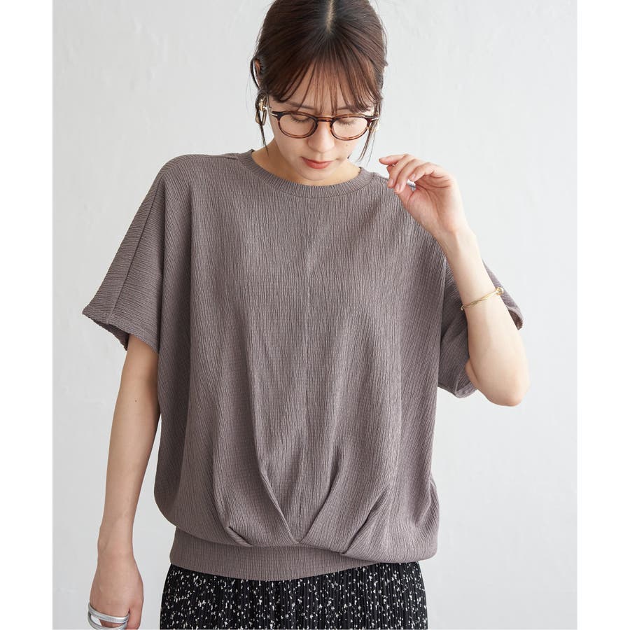 裾に大きめのタックを入れることでタックイン風に見え、二の腕カバーできるドルマン袖のトップス。