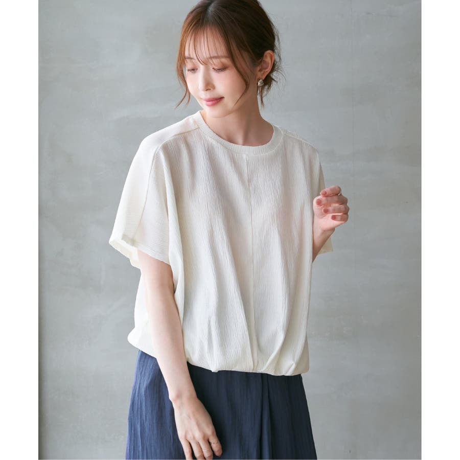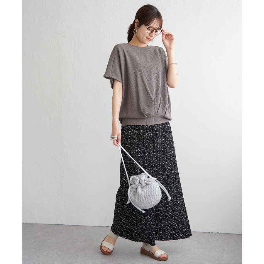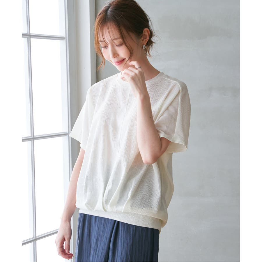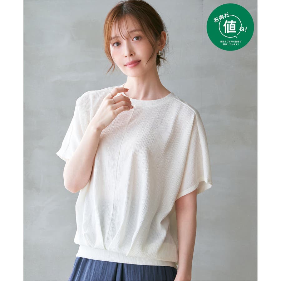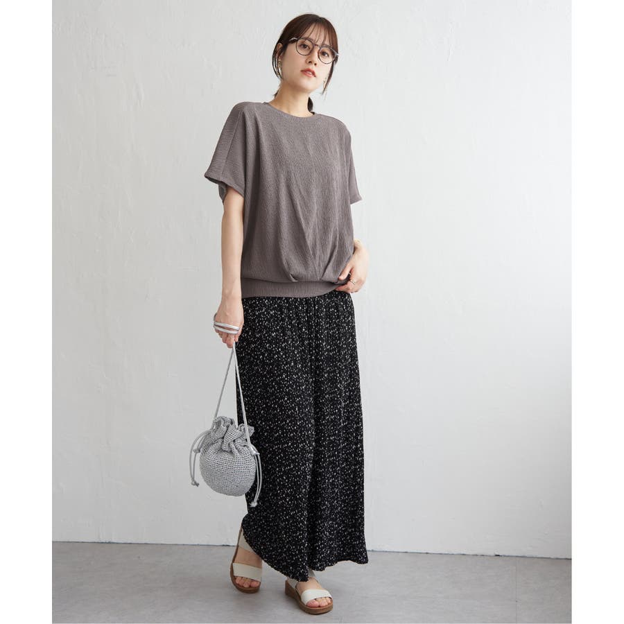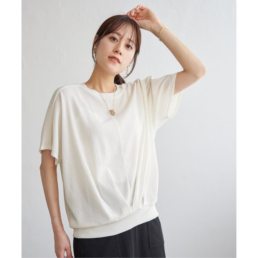 裾に大きめのタックを入れることでタックイン風に見え、二の腕カバーできるドルマン袖のトップス。