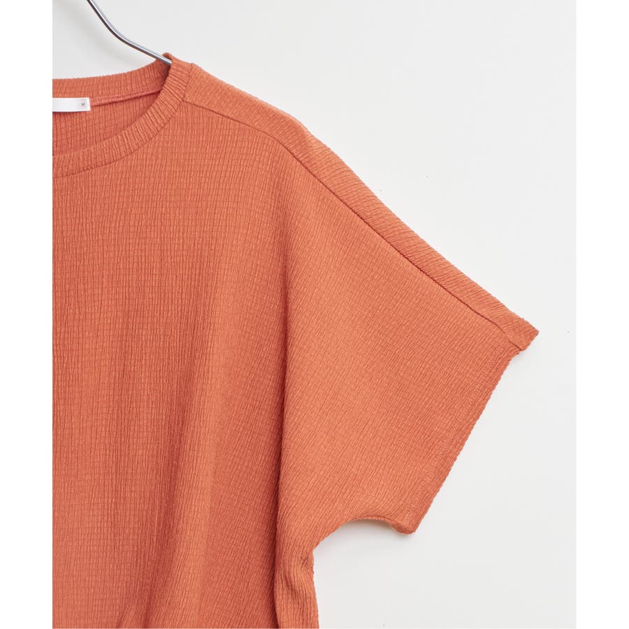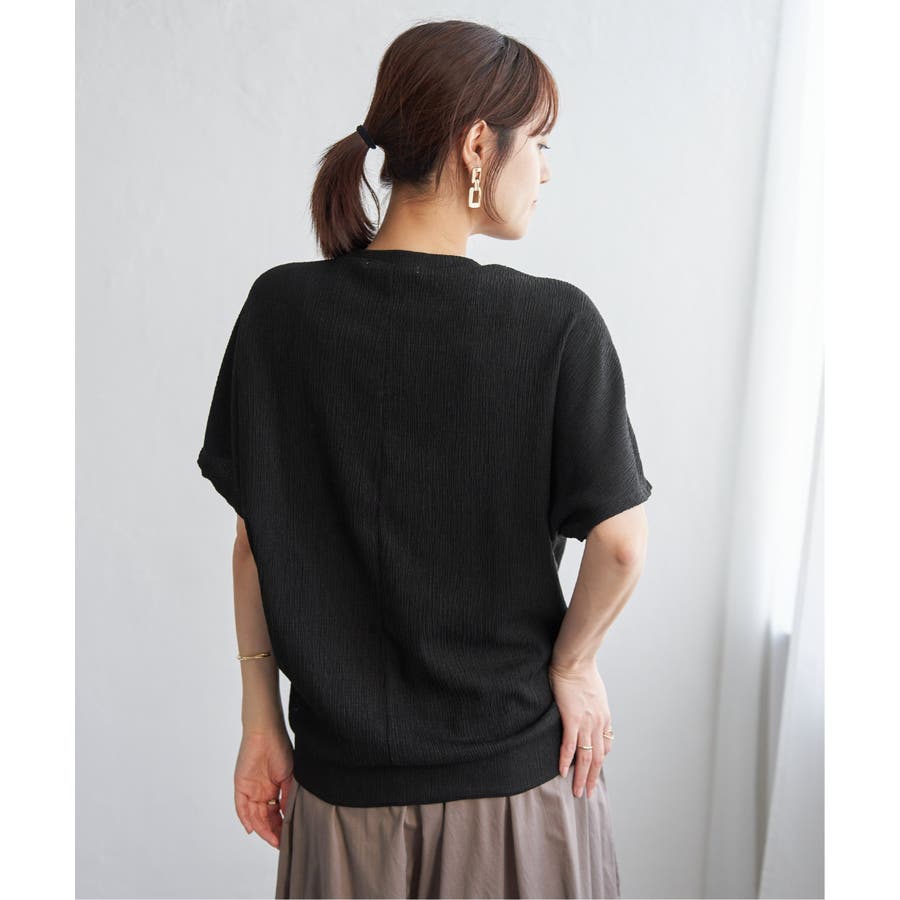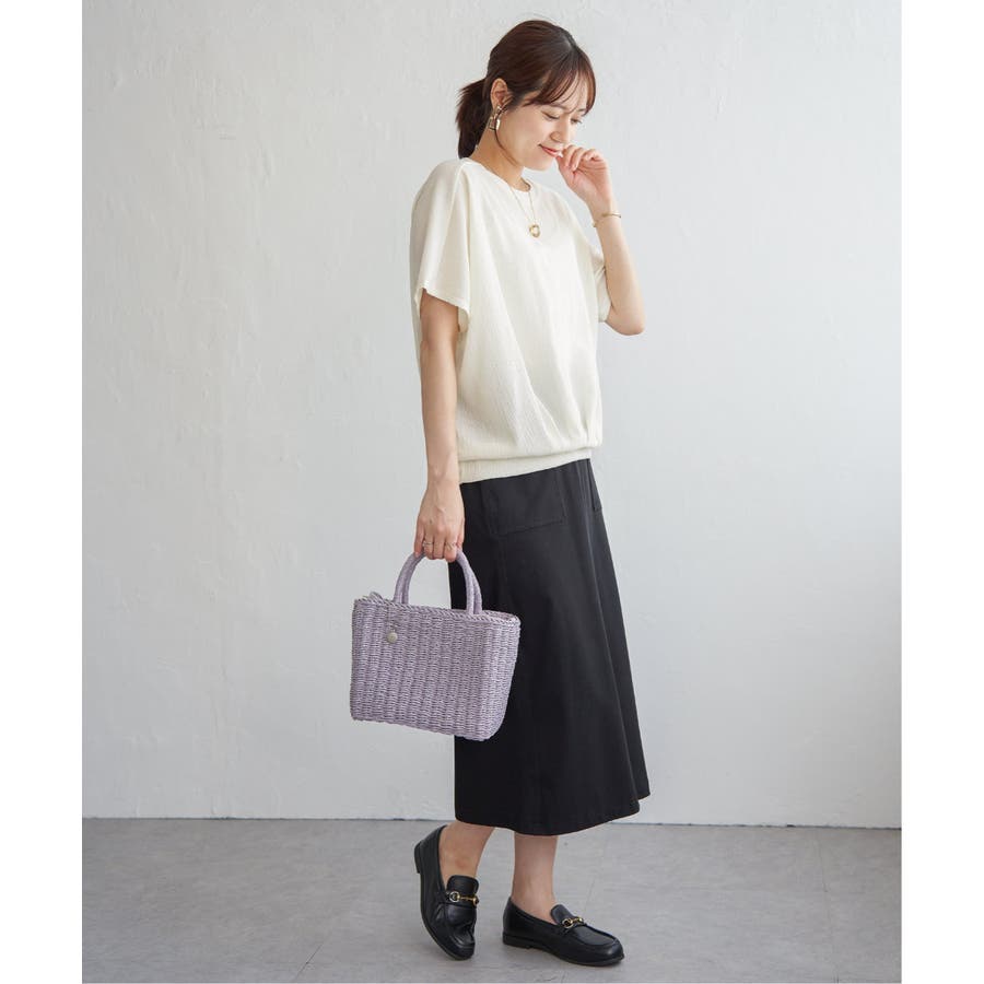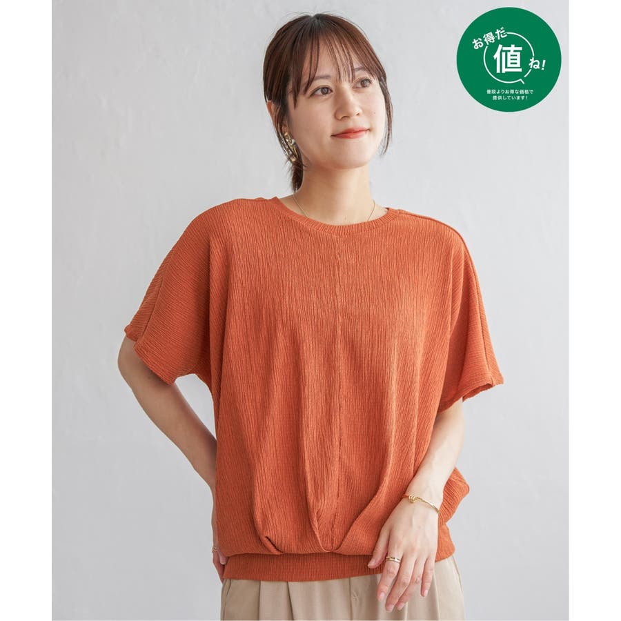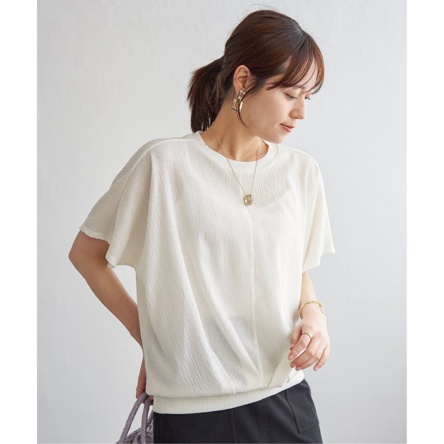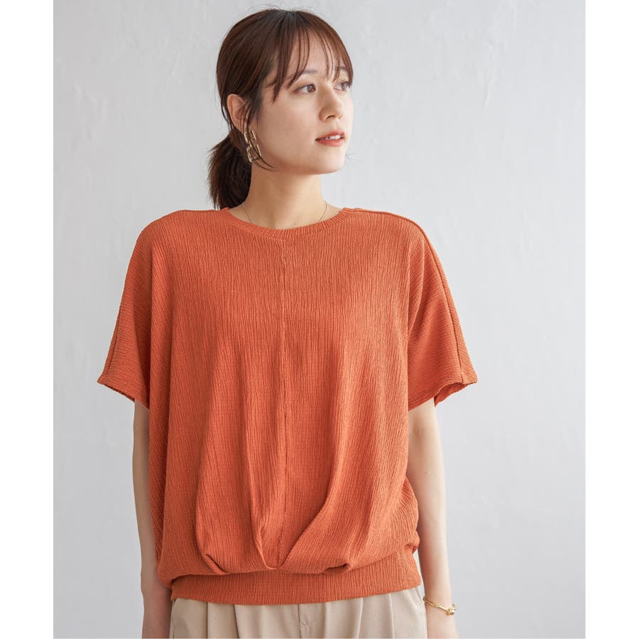 裾に大きめのタックを入れることでタックイン風に見え、二の腕カバーできるドルマン袖のトップス。