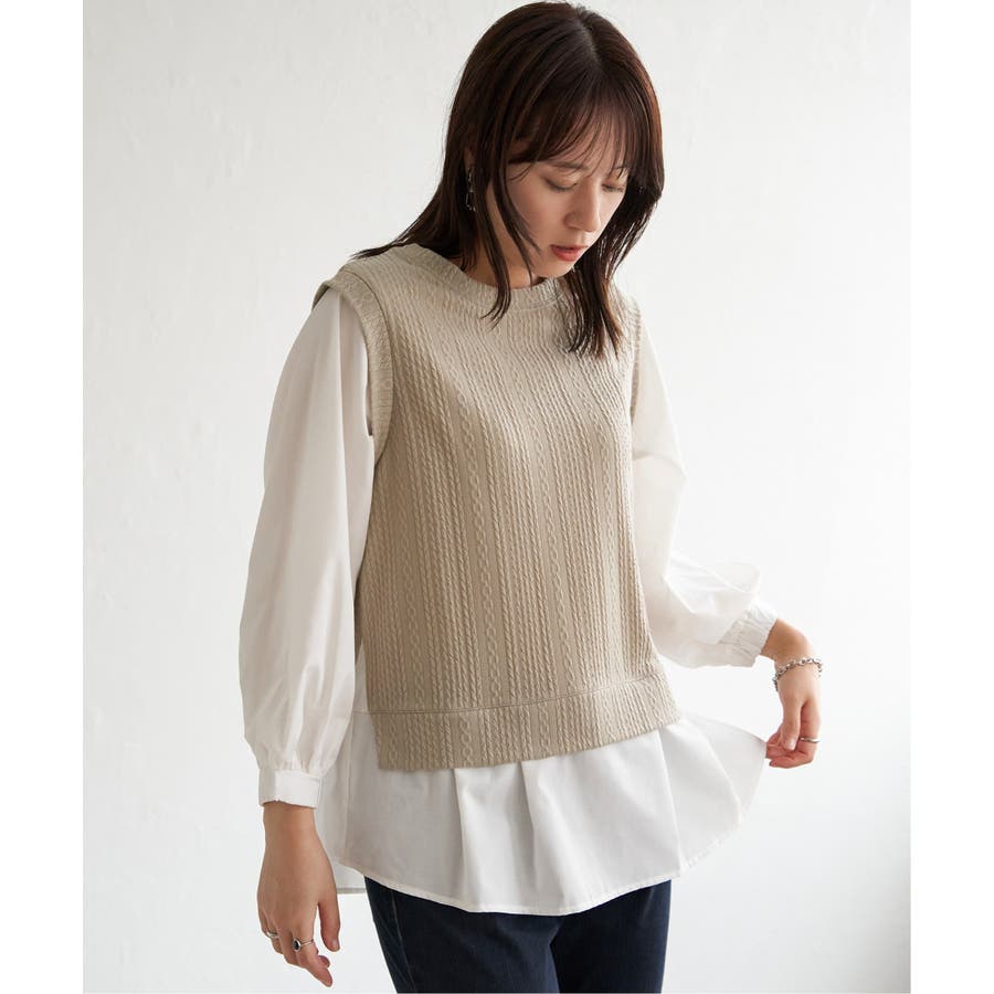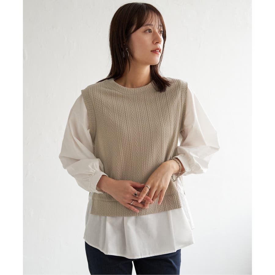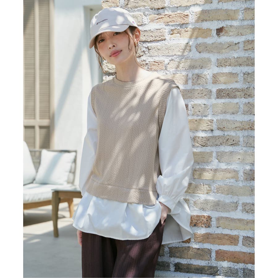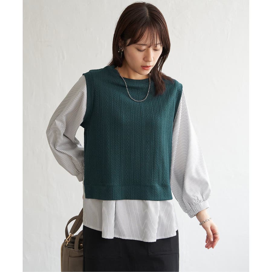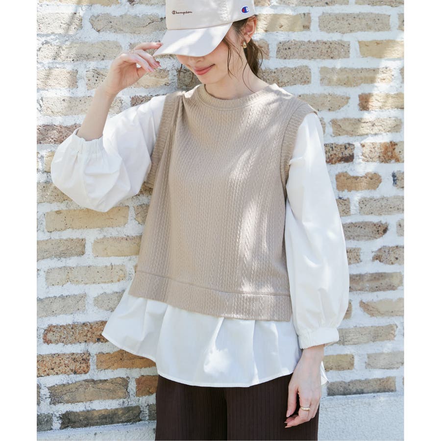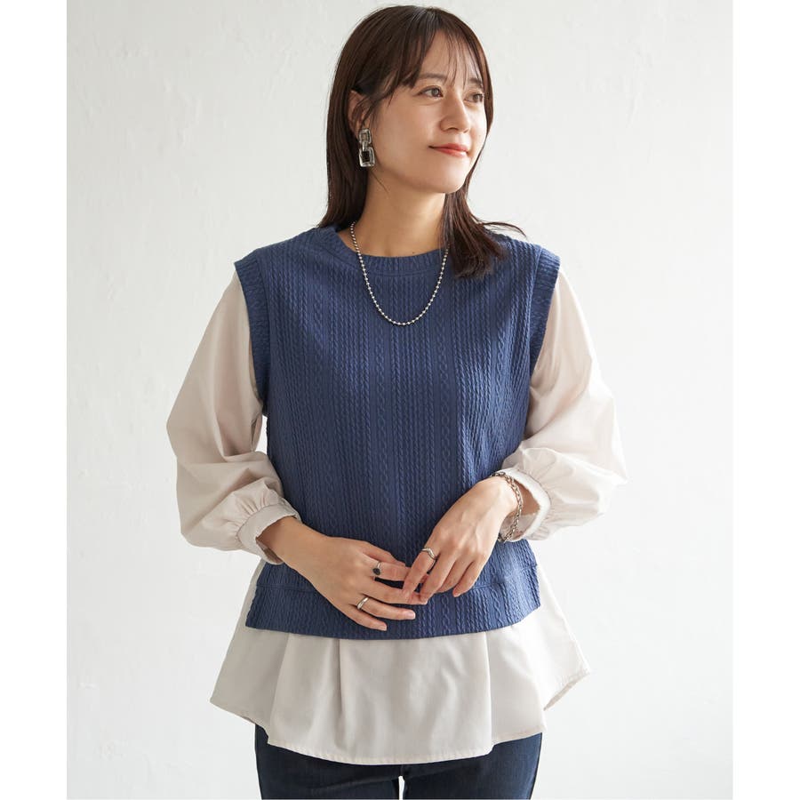 ケーブル柄のベストとシャツを重ね着したようなプルオーバーは、着るだけでレイヤードスタイルが完成する“ひとワザ”アイテム。