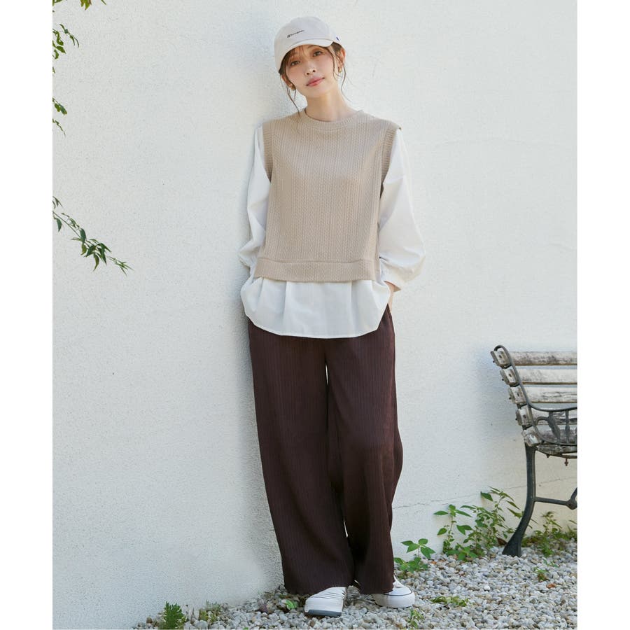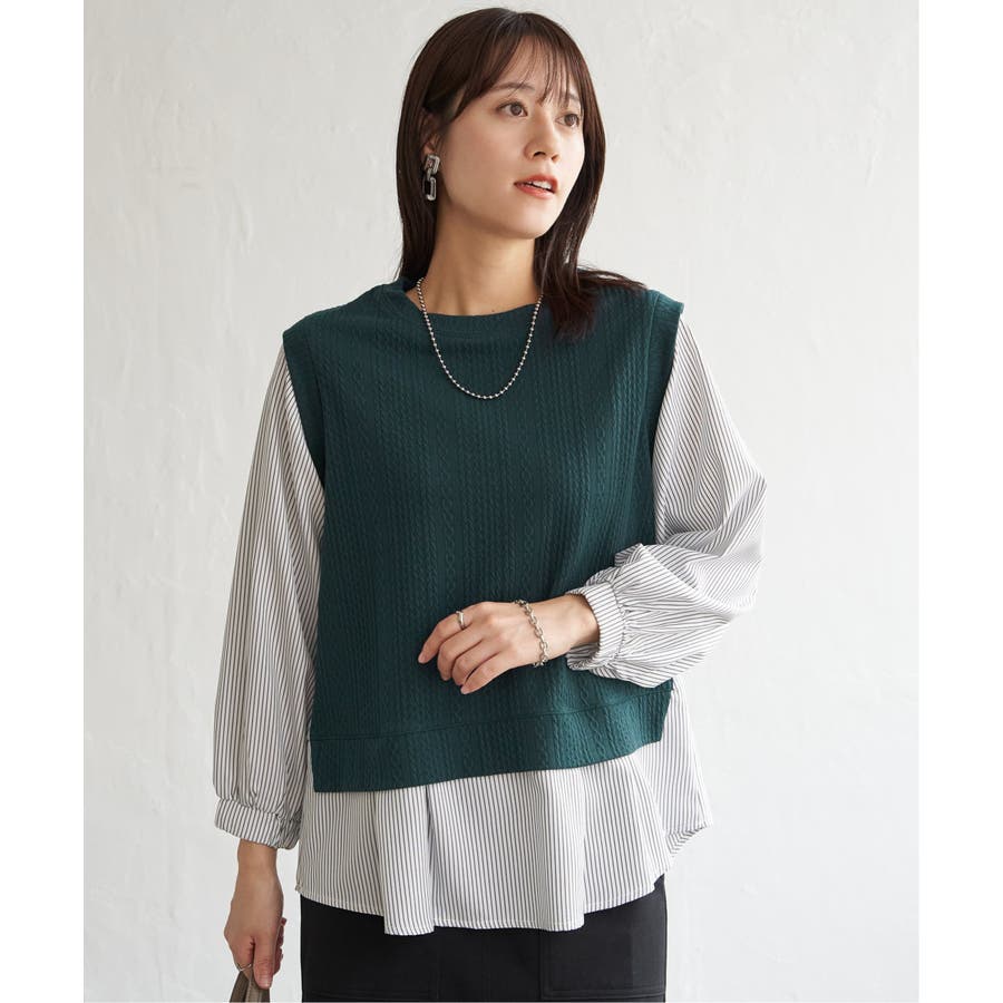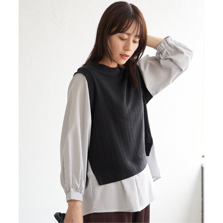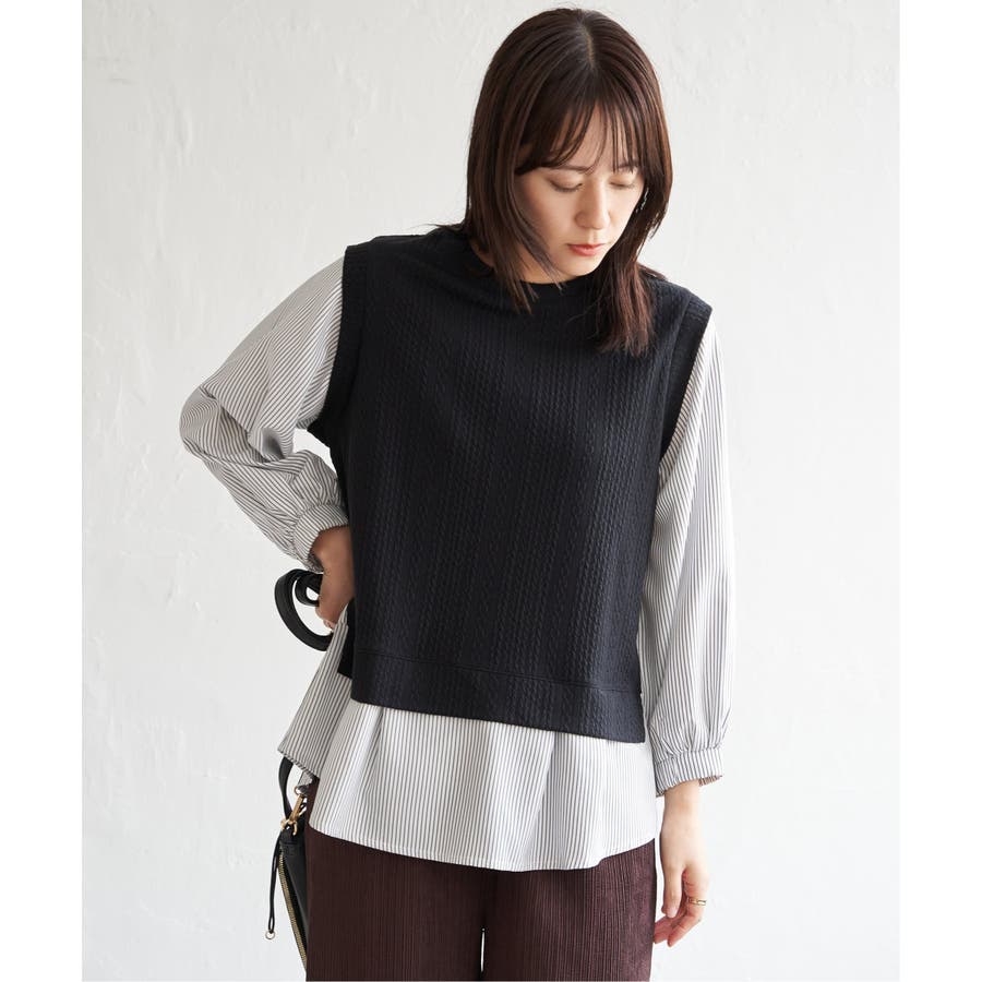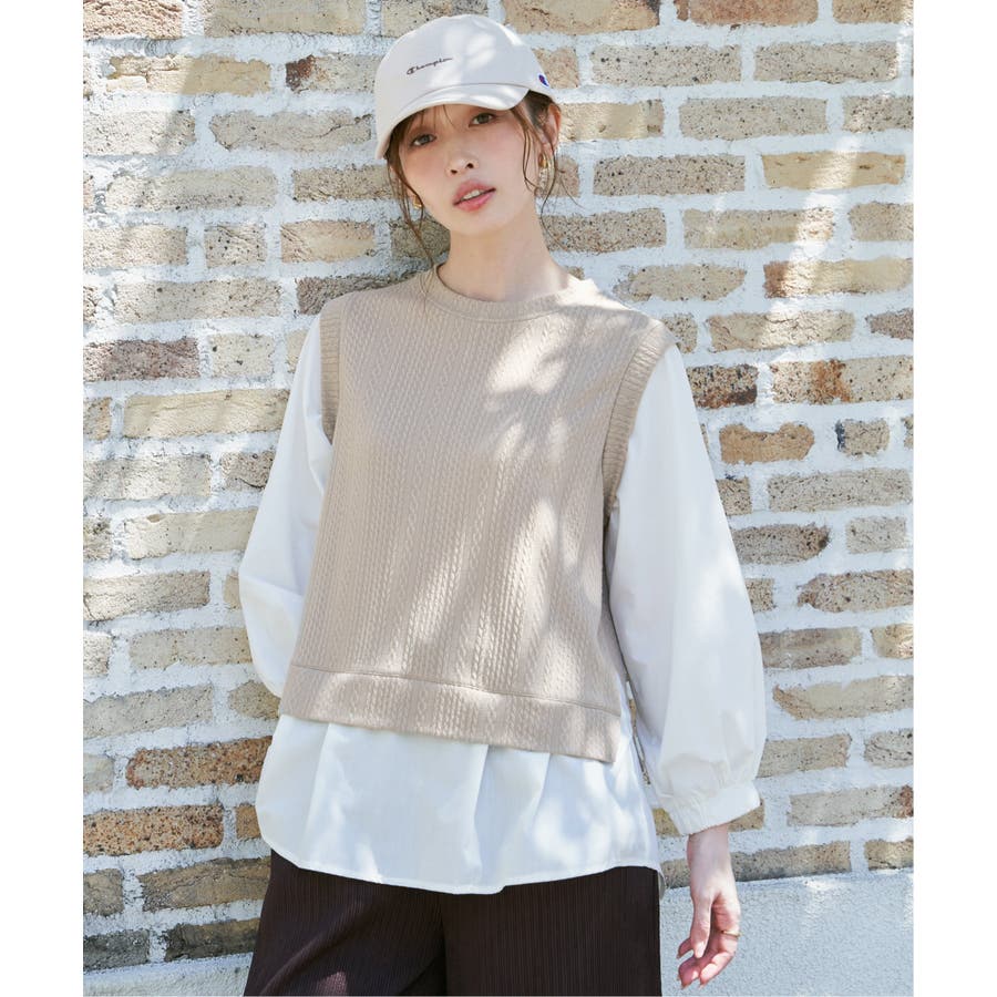 ケーブル柄のベストとシャツを重ね着したようなプルオーバーは、着るだけでレイヤードスタイルが完成する“ひとワザ”アイテム。