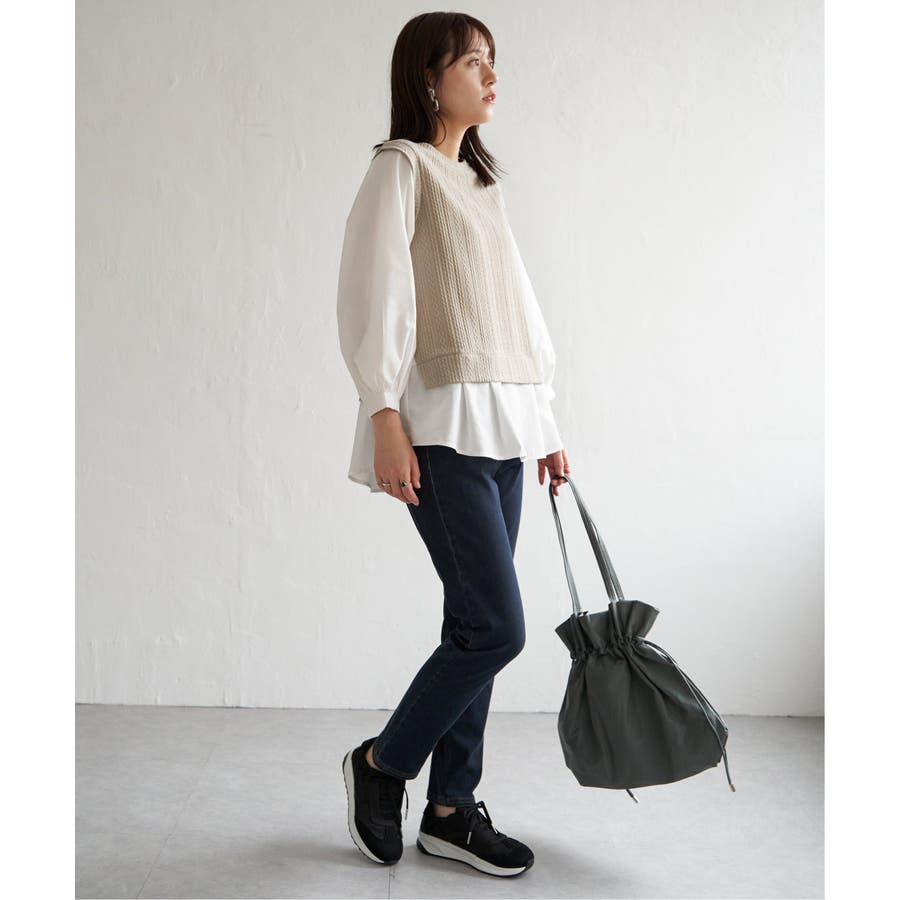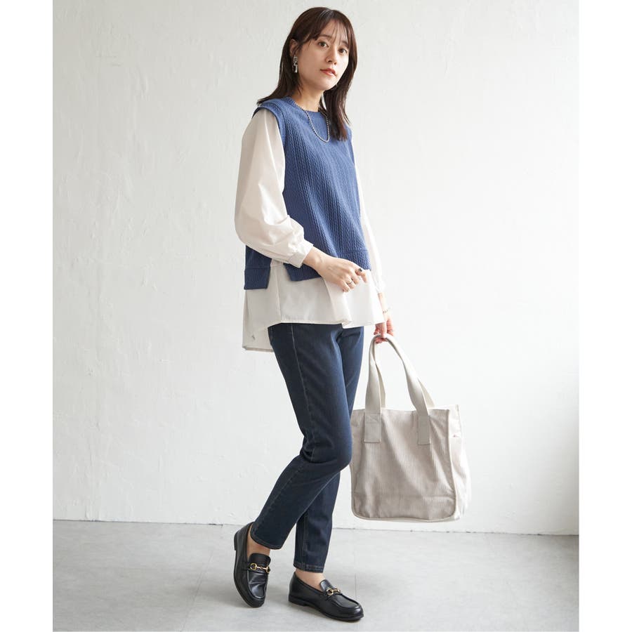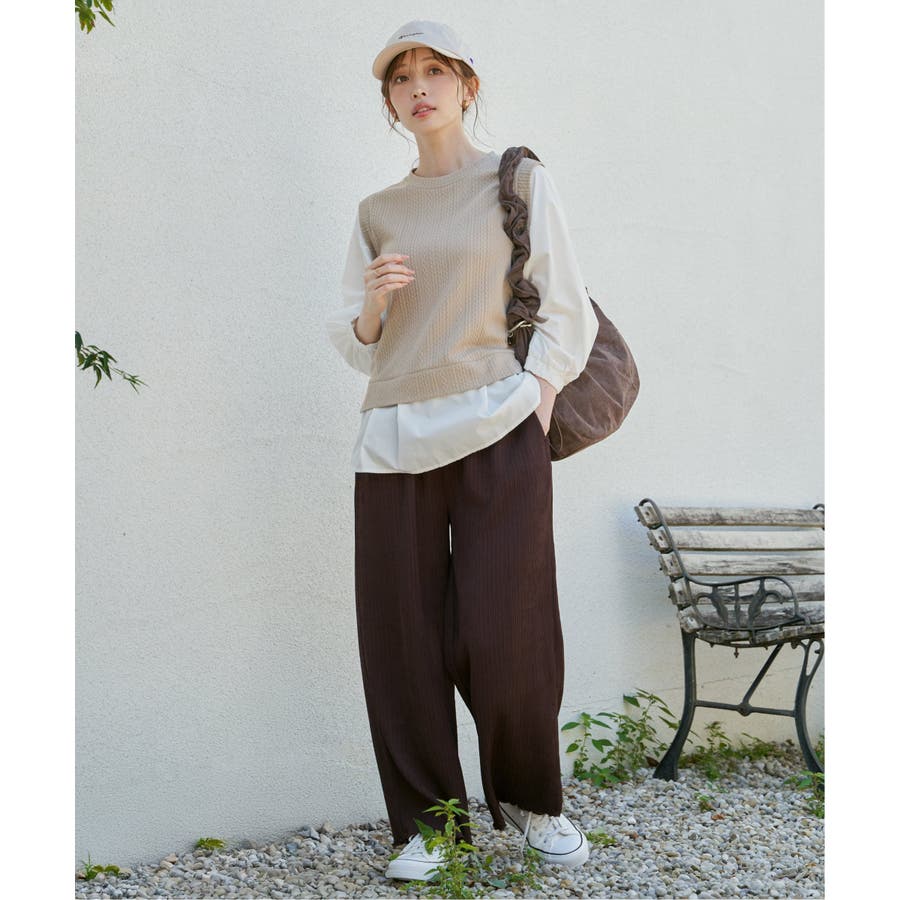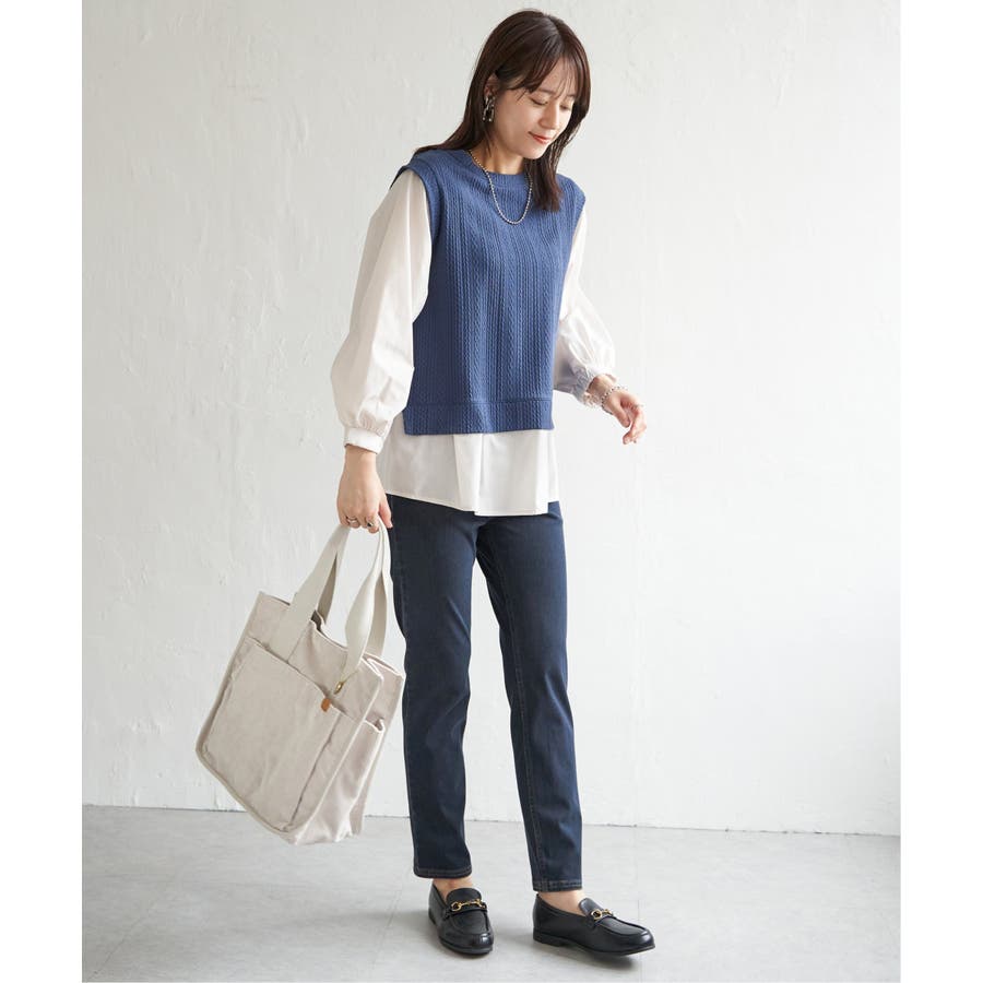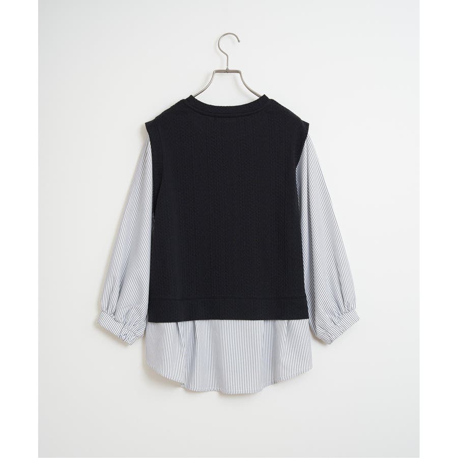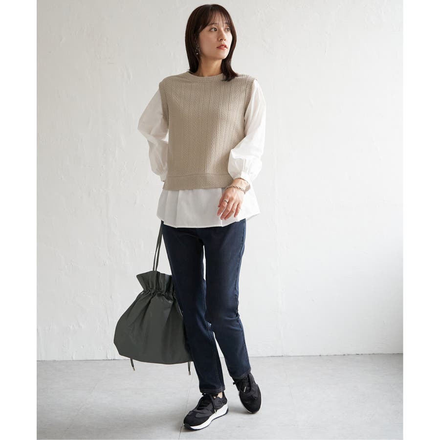 ケーブル柄のベストとシャツを重ね着したようなプルオーバーは、着るだけでレイヤードスタイルが完成する“ひとワザ”アイテム。