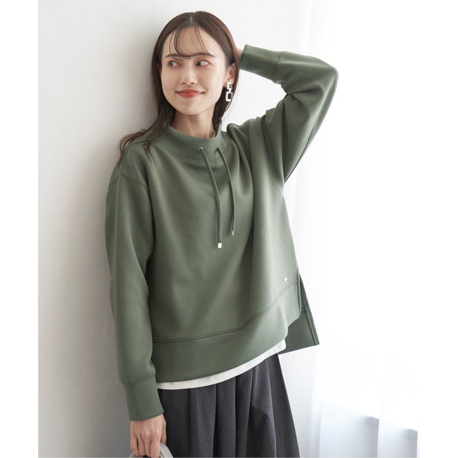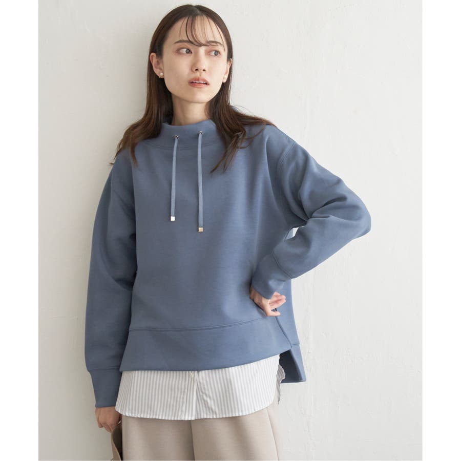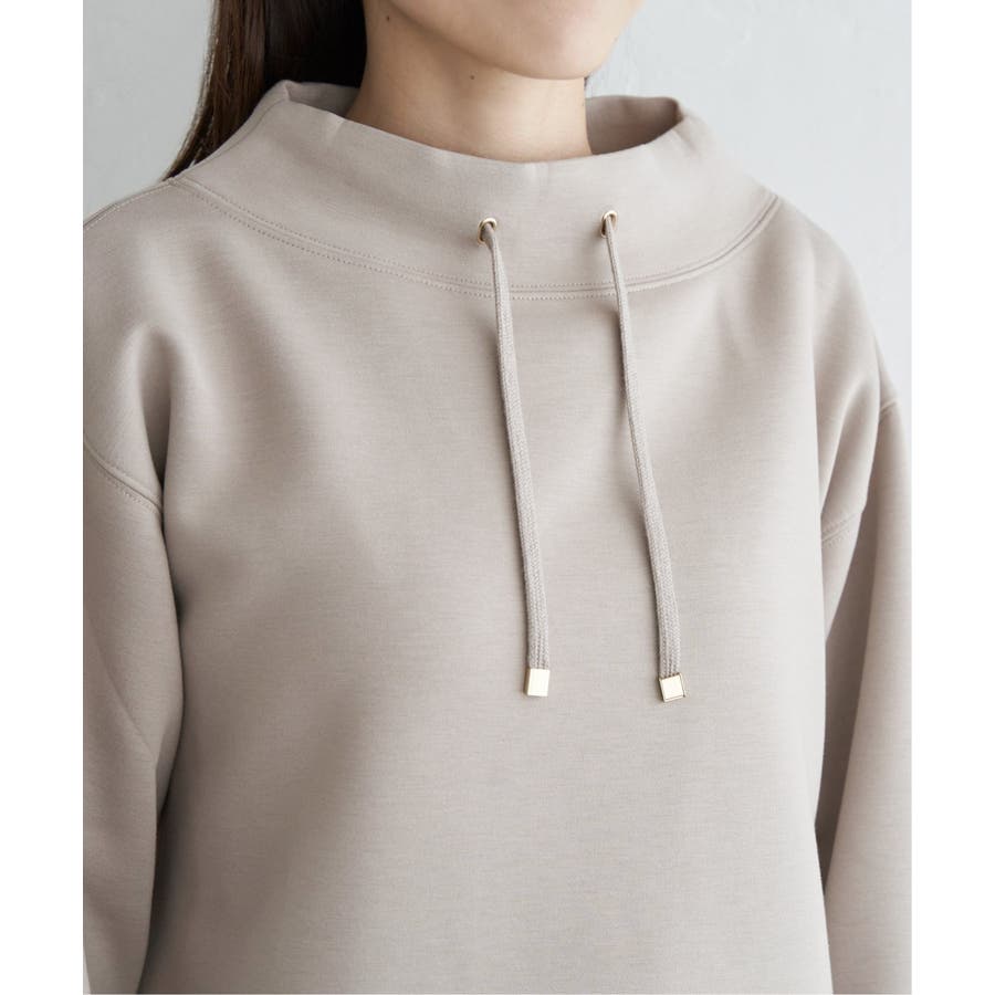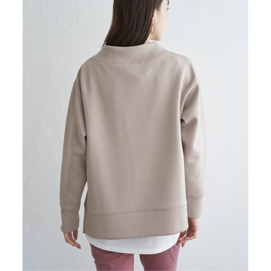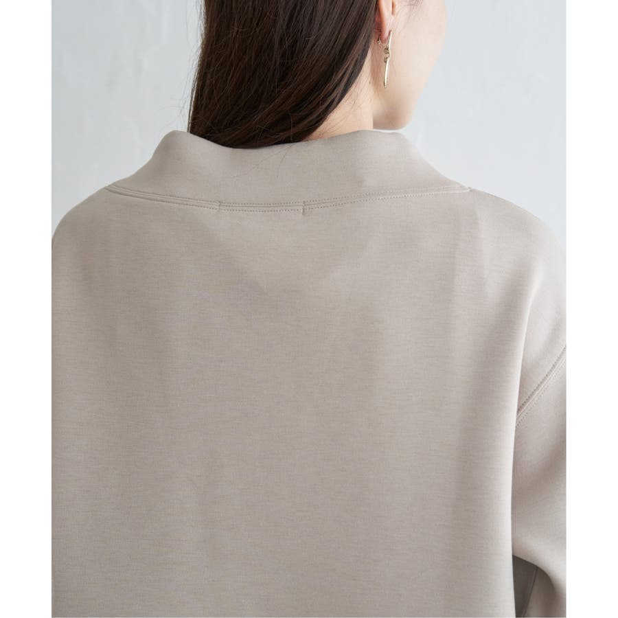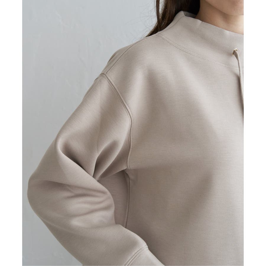 モックネック型の襟にスピンドルを通したクリーンな印象のスウェット。
