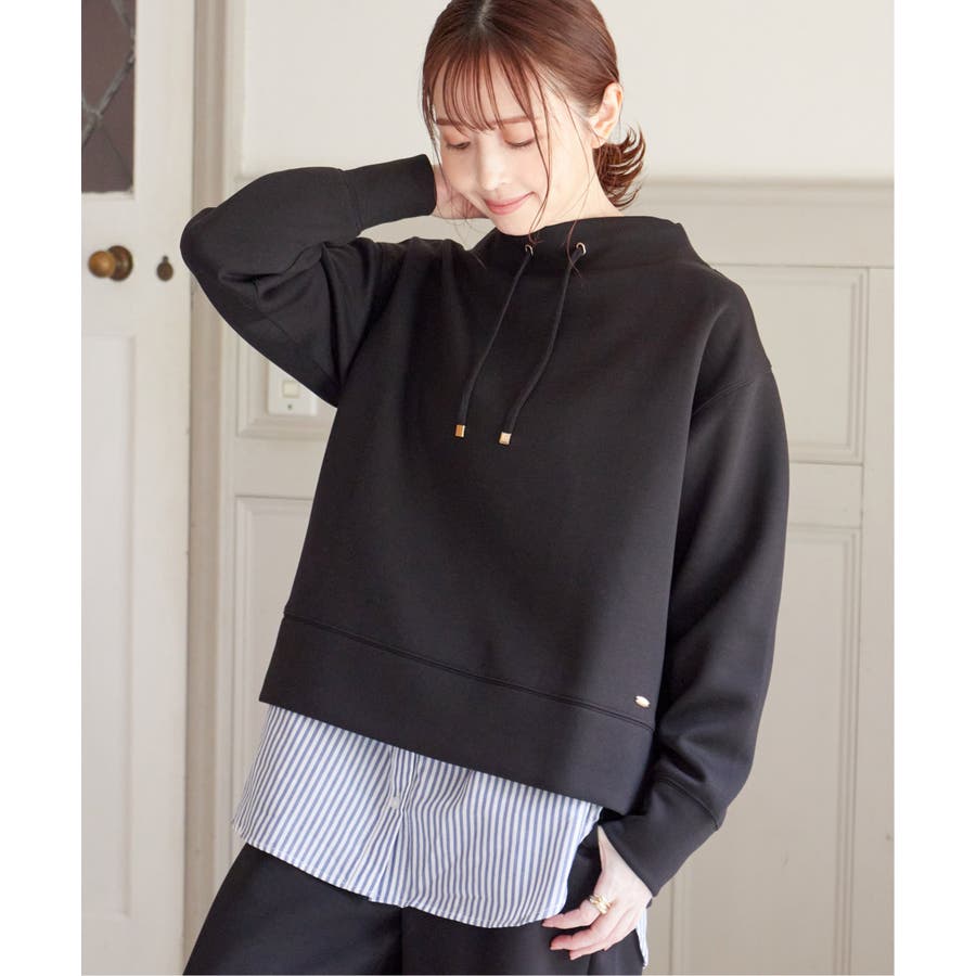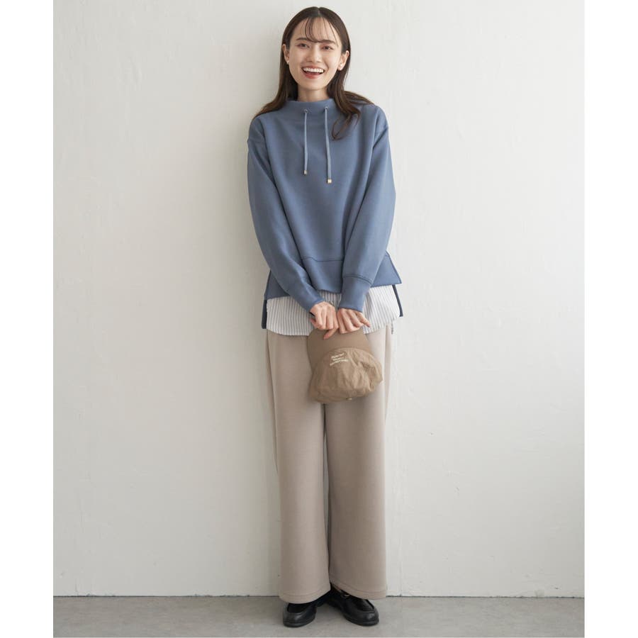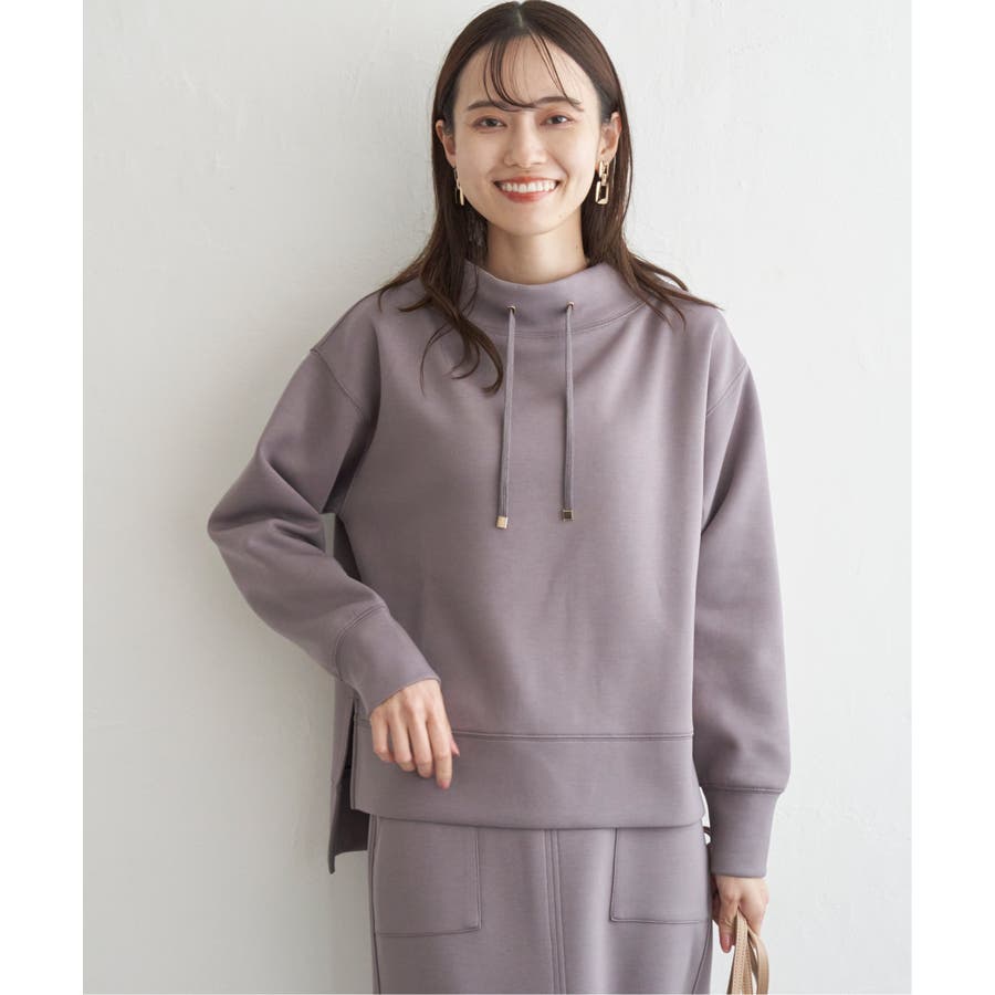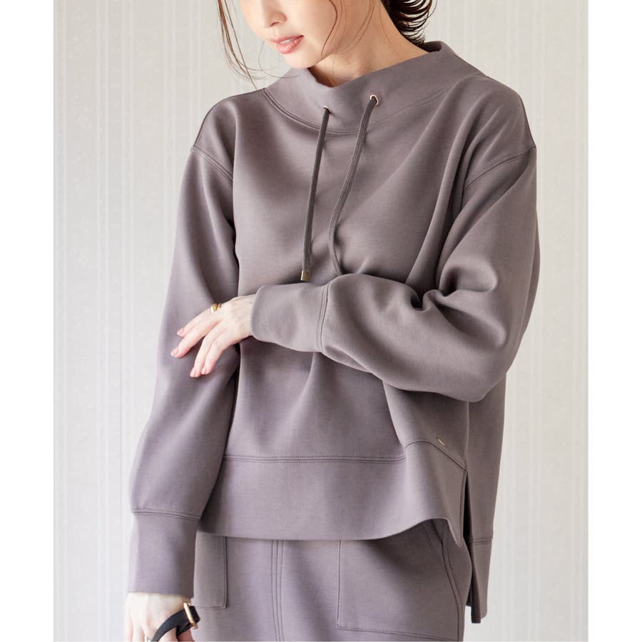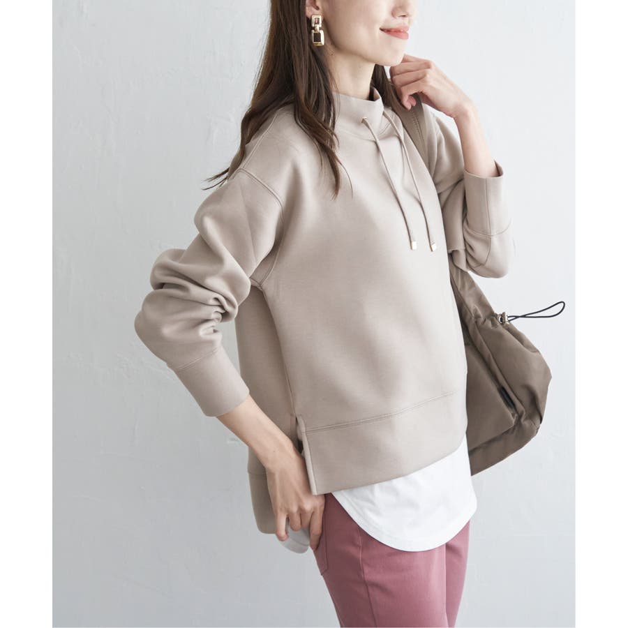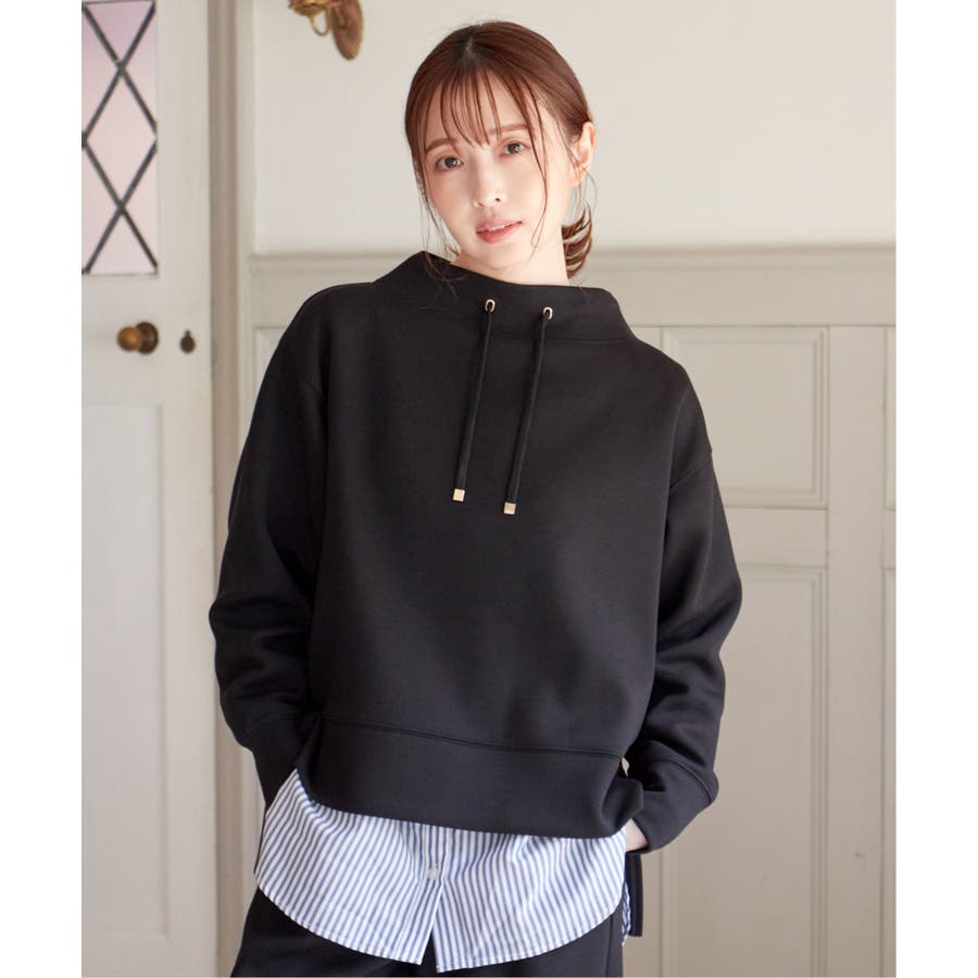 モックネック型の襟にスピンドルを通したクリーンな印象のスウェット。