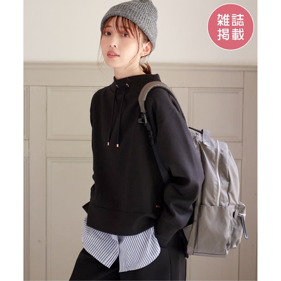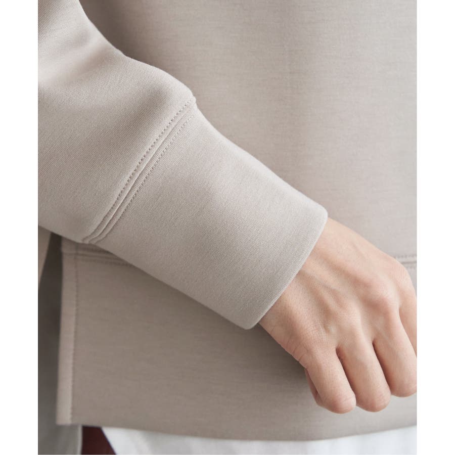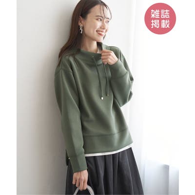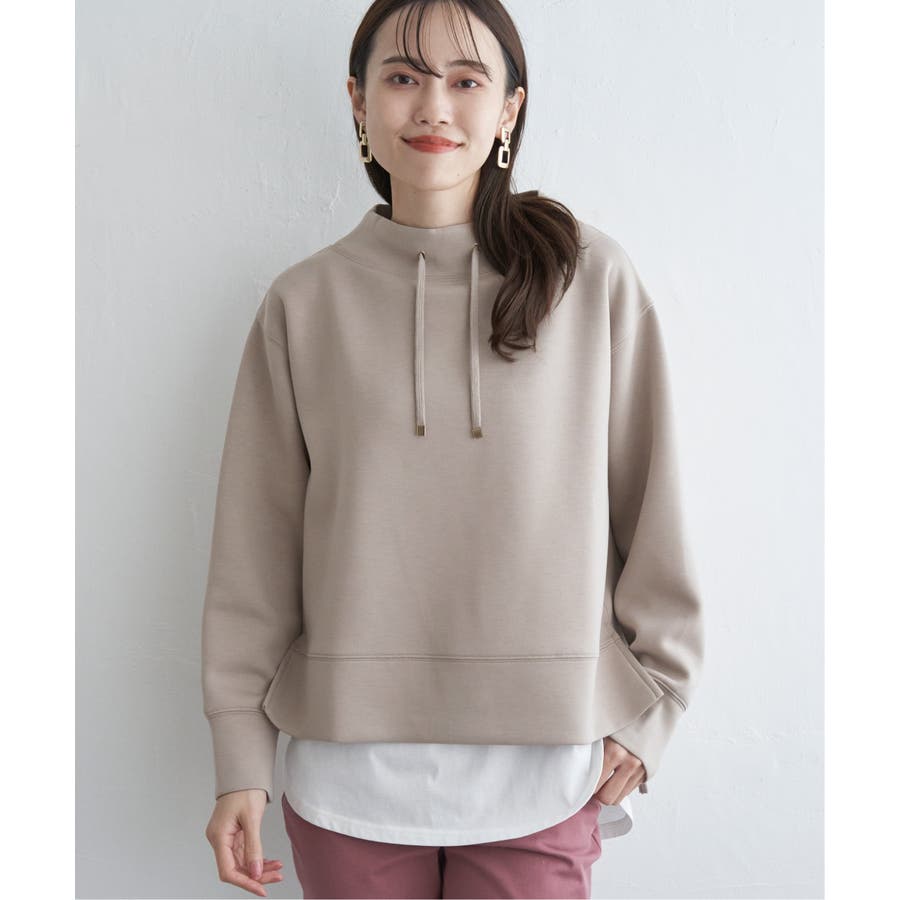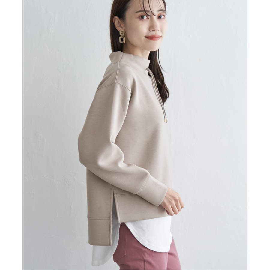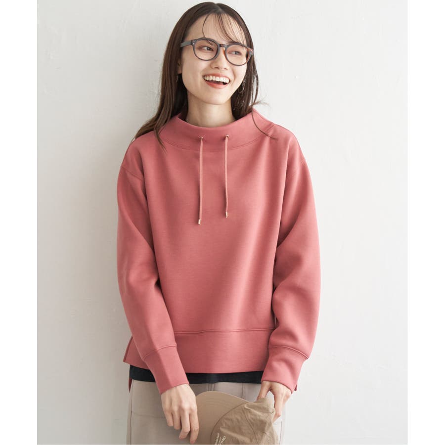 モックネック型の襟にスピンドルを通したクリーンな印象のスウェット。