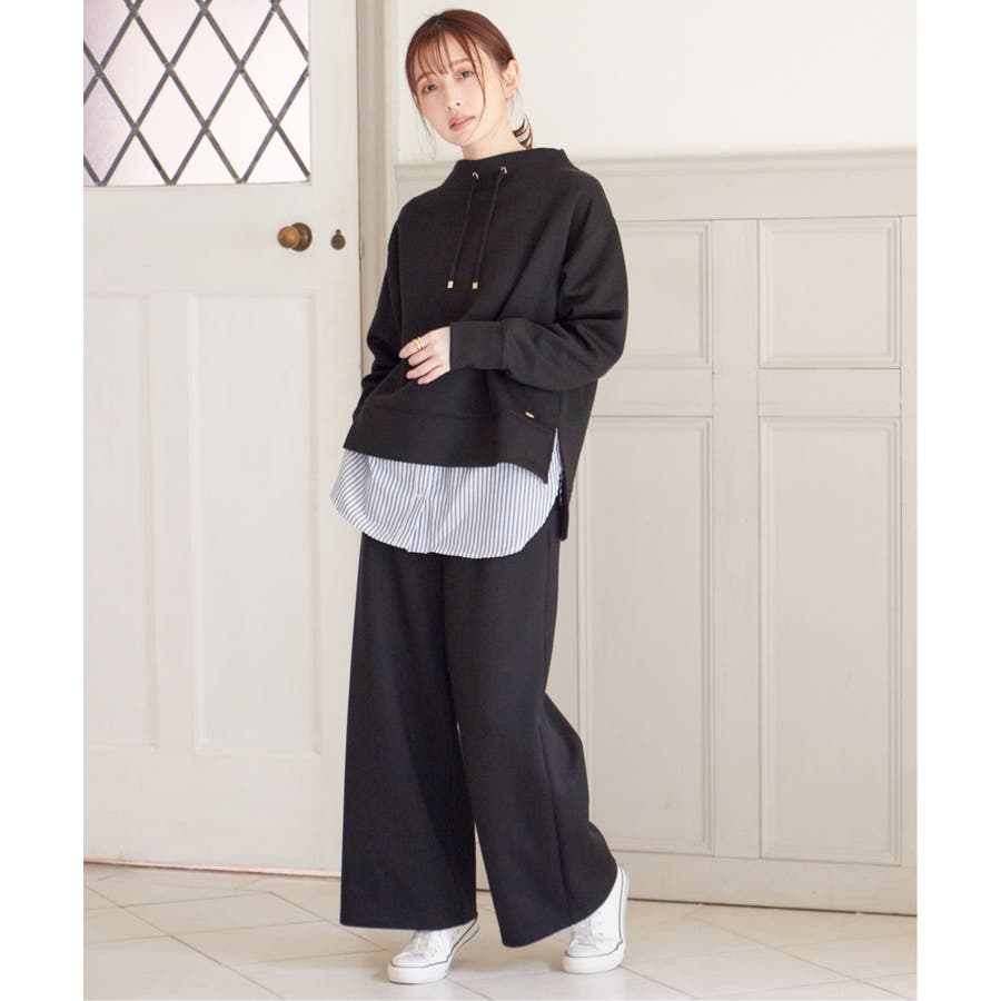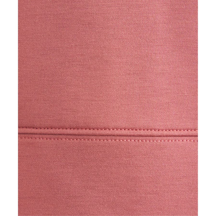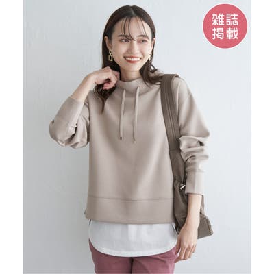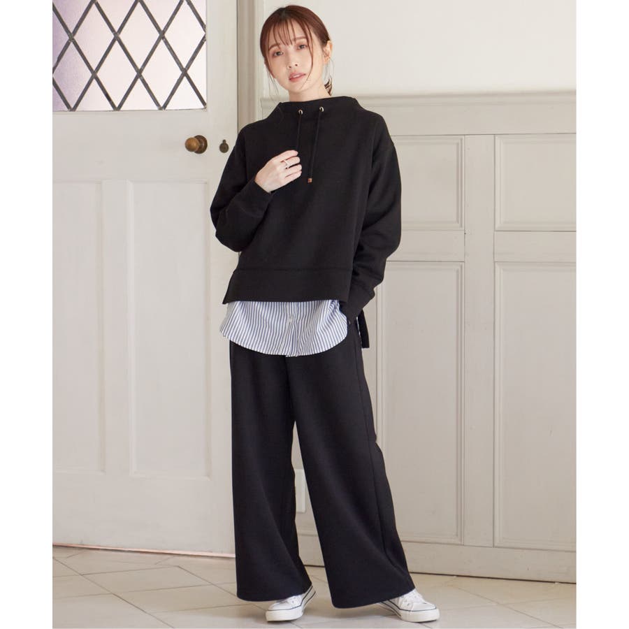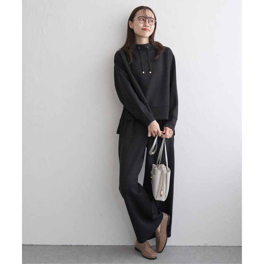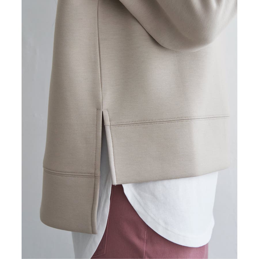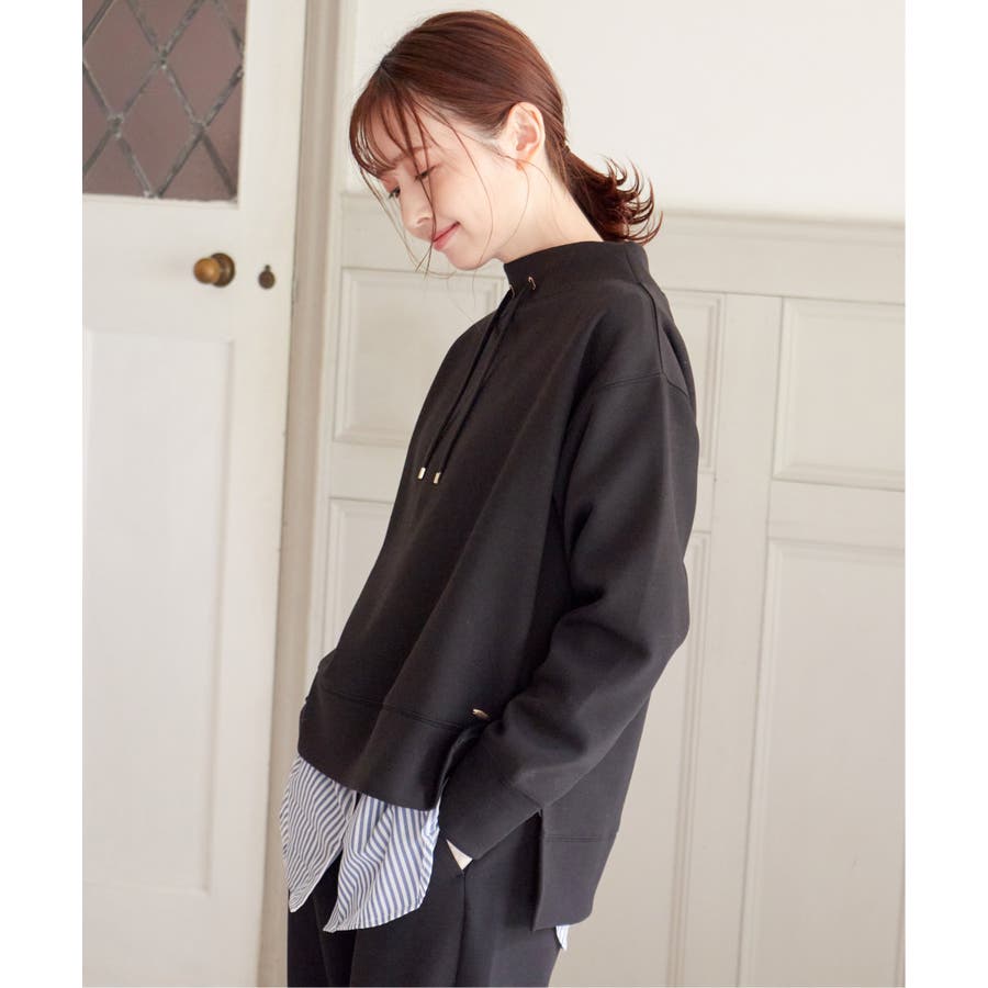 モックネック型の襟にスピンドルを通したクリーンな印象のスウェット。