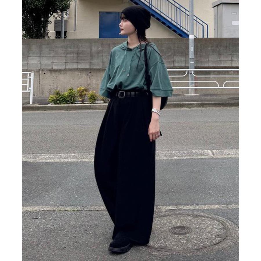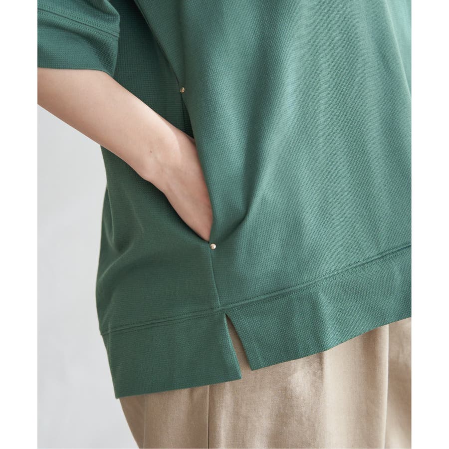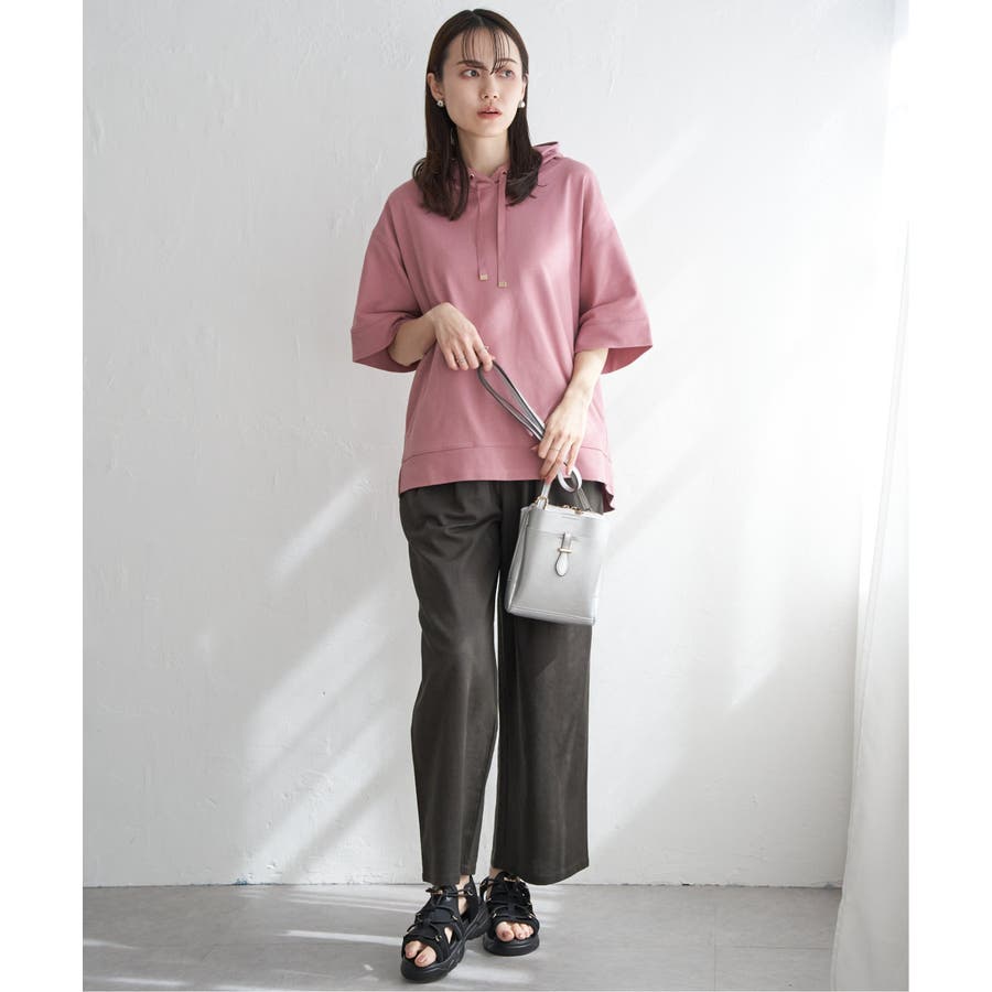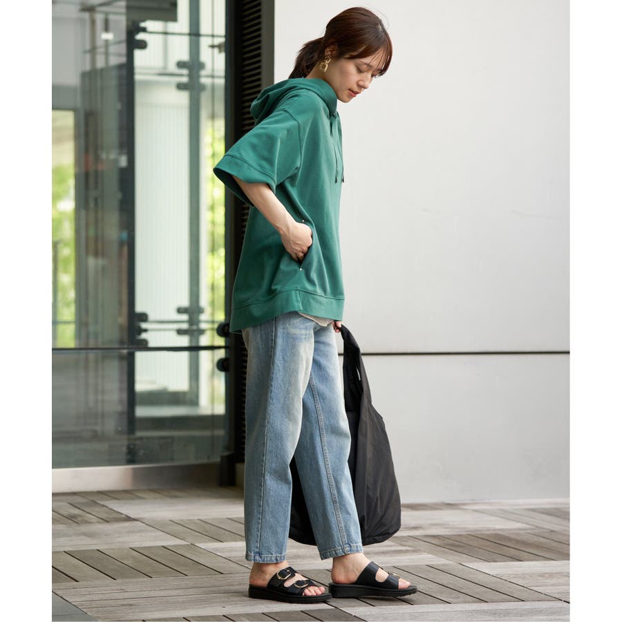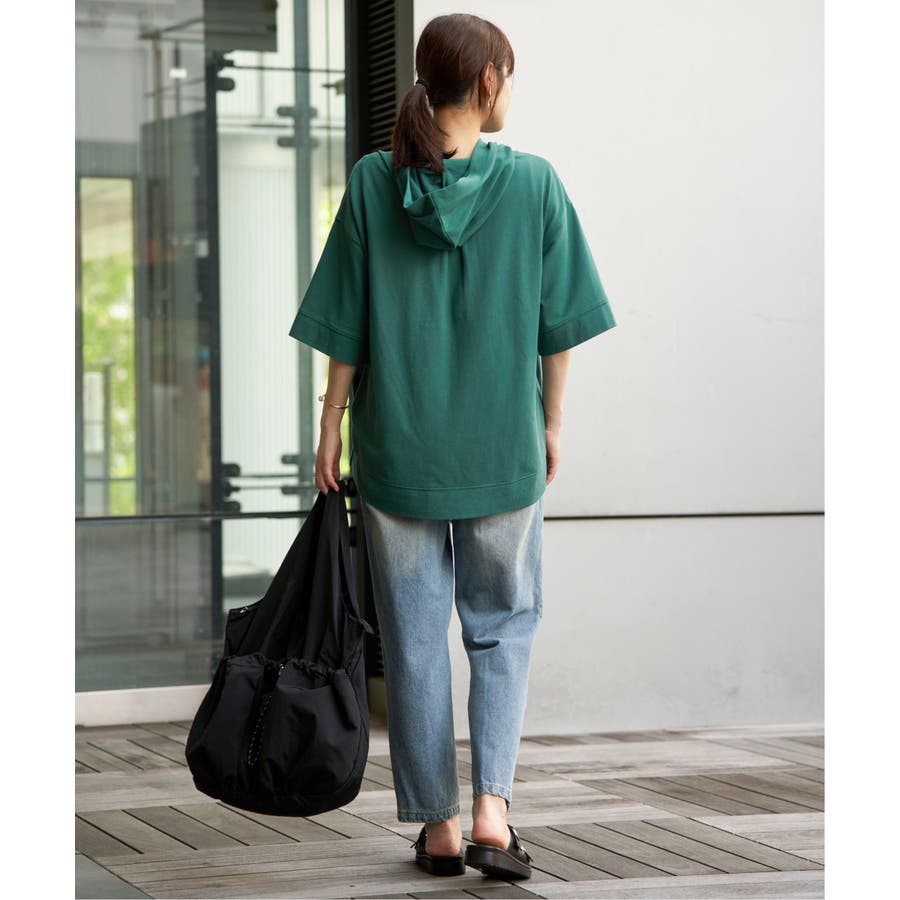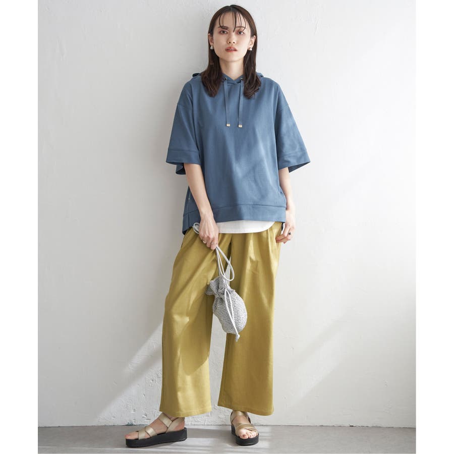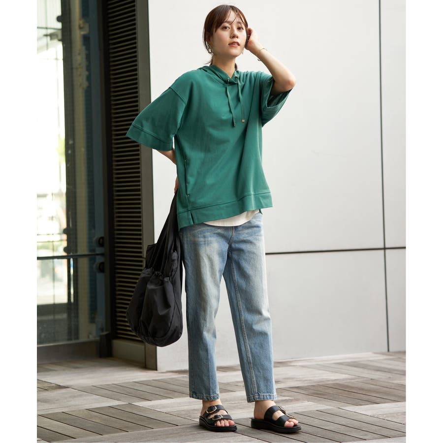 長めの半袖はひじ辺りまで隠れ、広めの袖口でリラックスしたスタイルに。