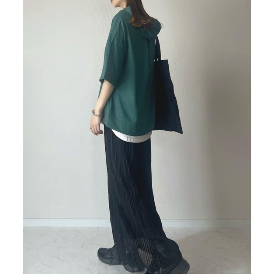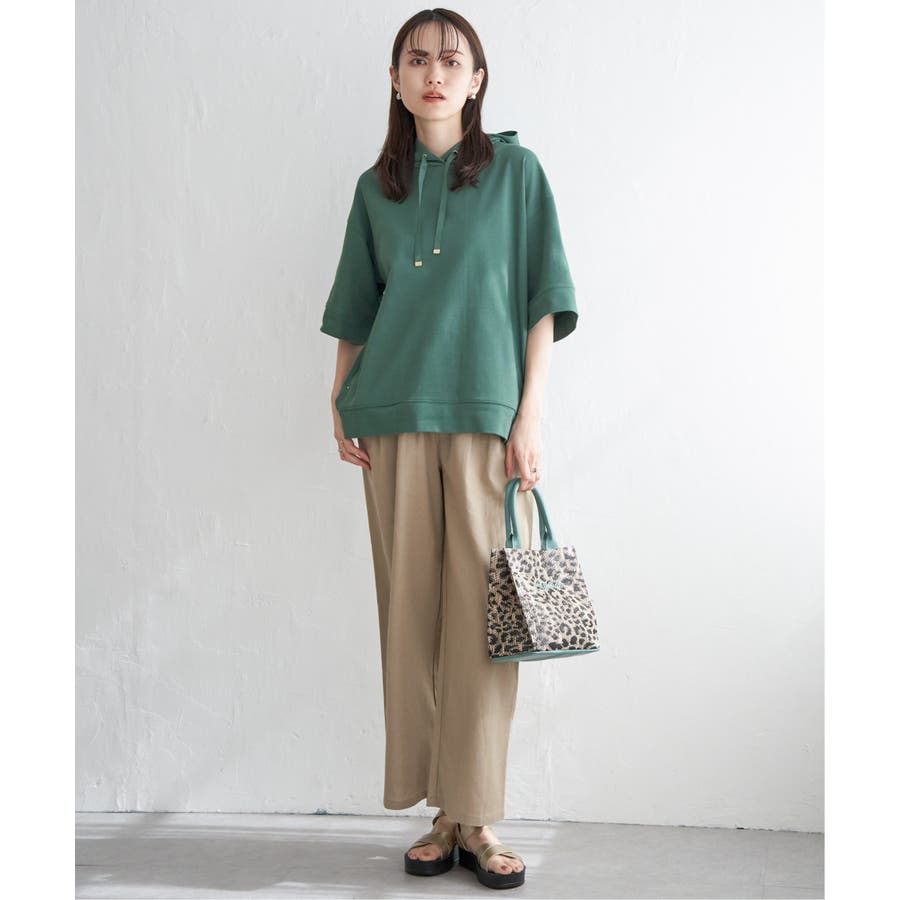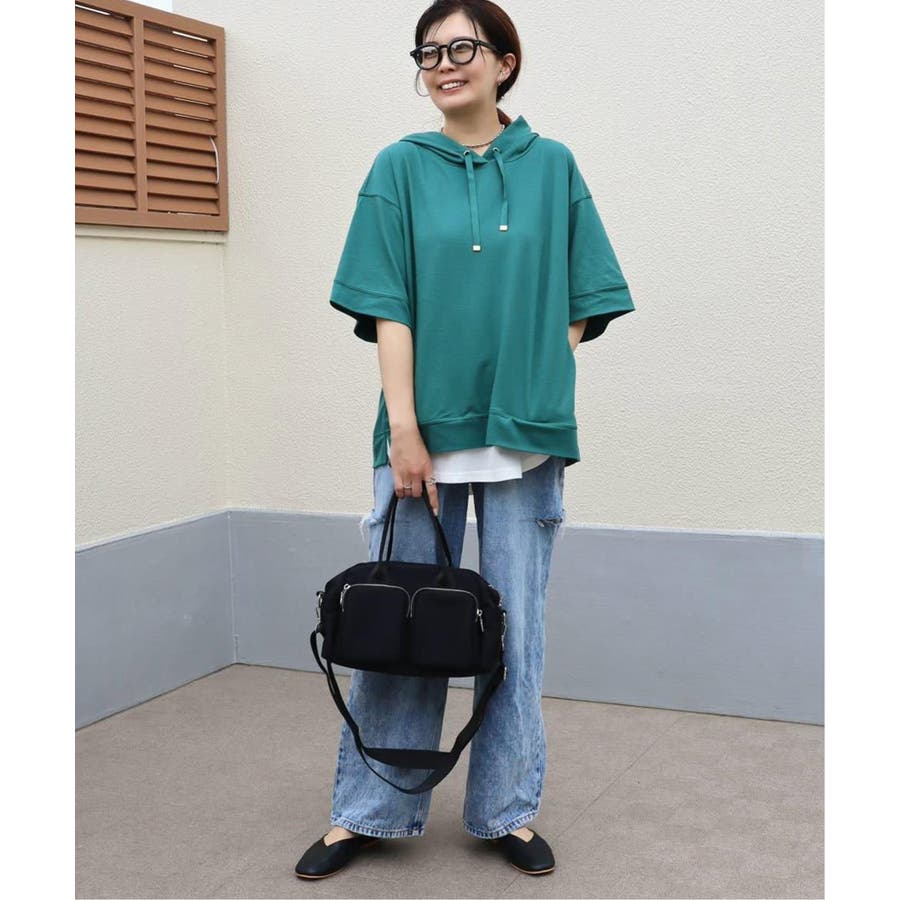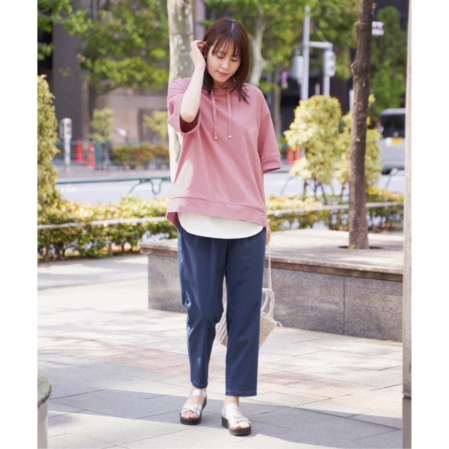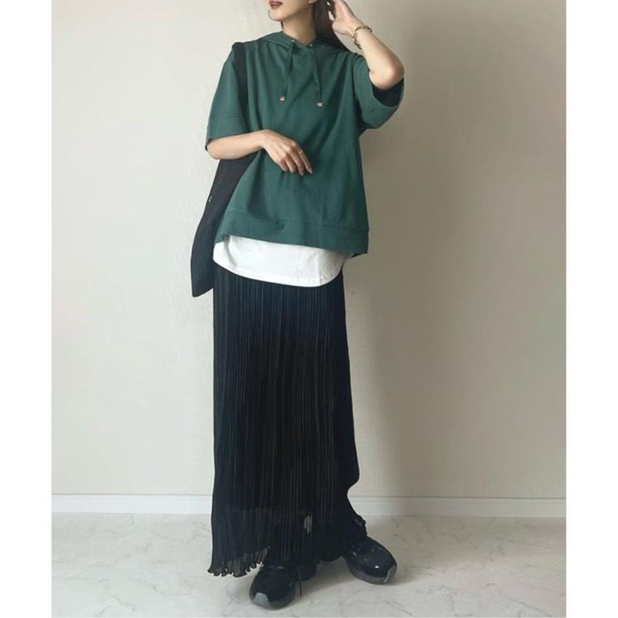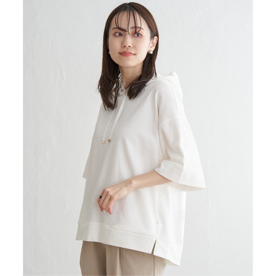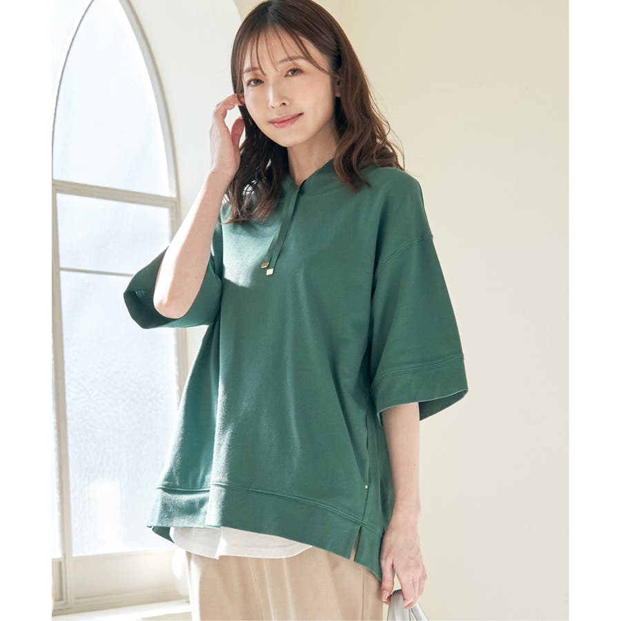 長めの半袖はひじ辺りまで隠れ、広めの袖口でリラックスしたスタイルに。