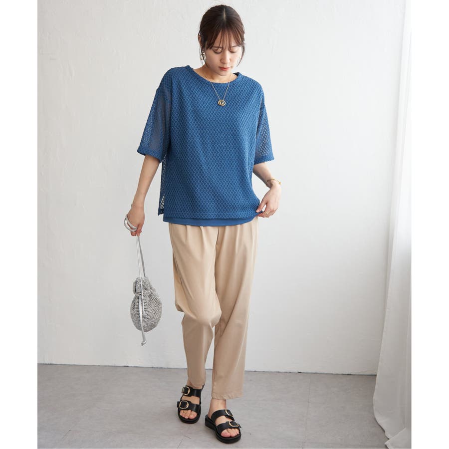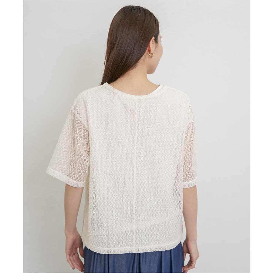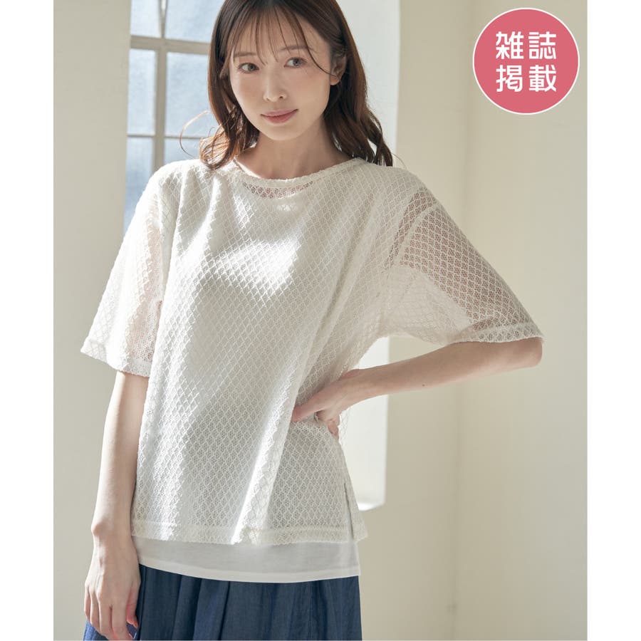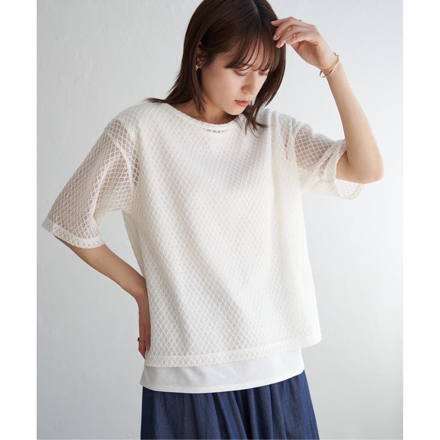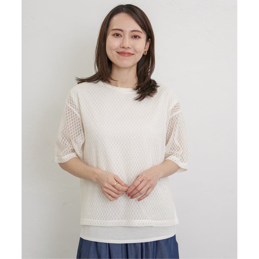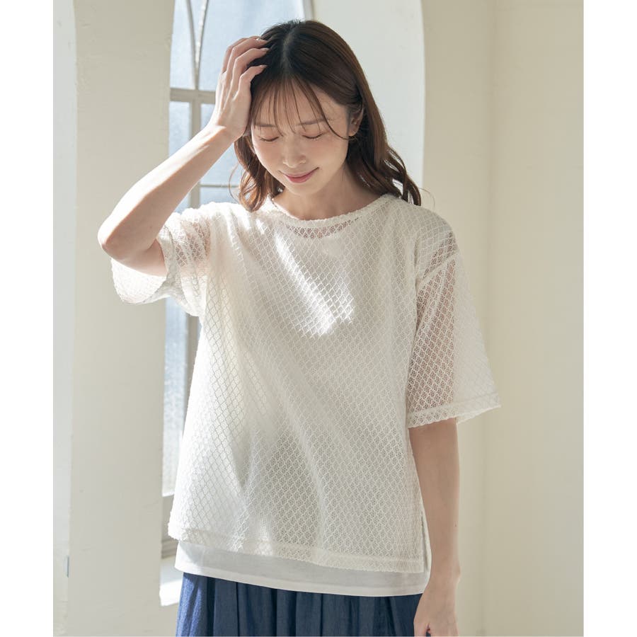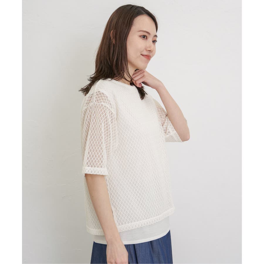 レースのTシャツ型トップスは、二の腕が気になりにくい丈感でおつくりしました。