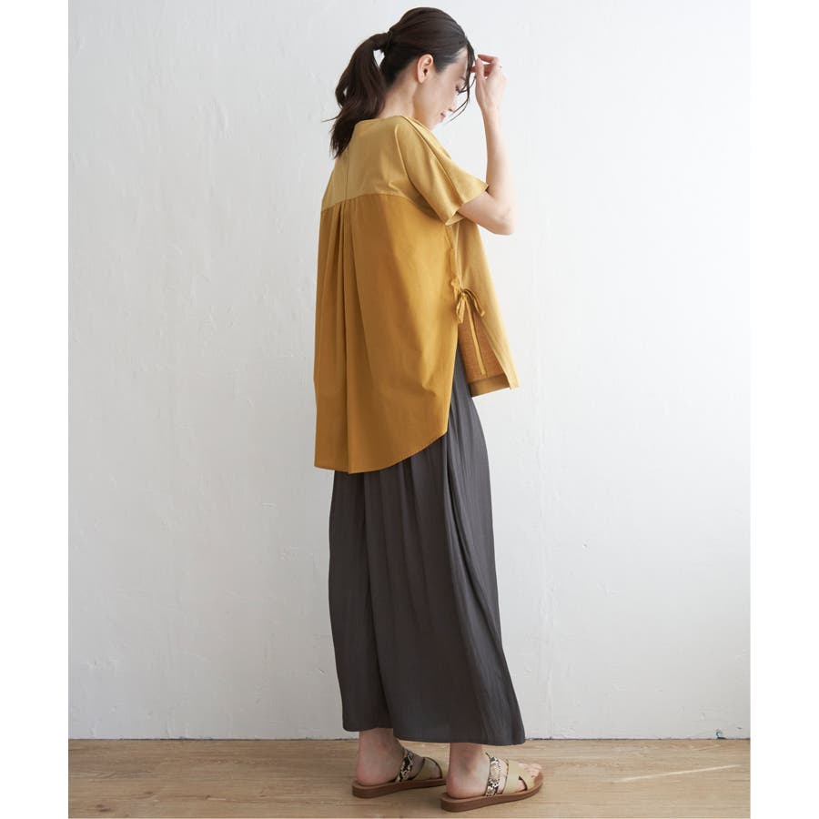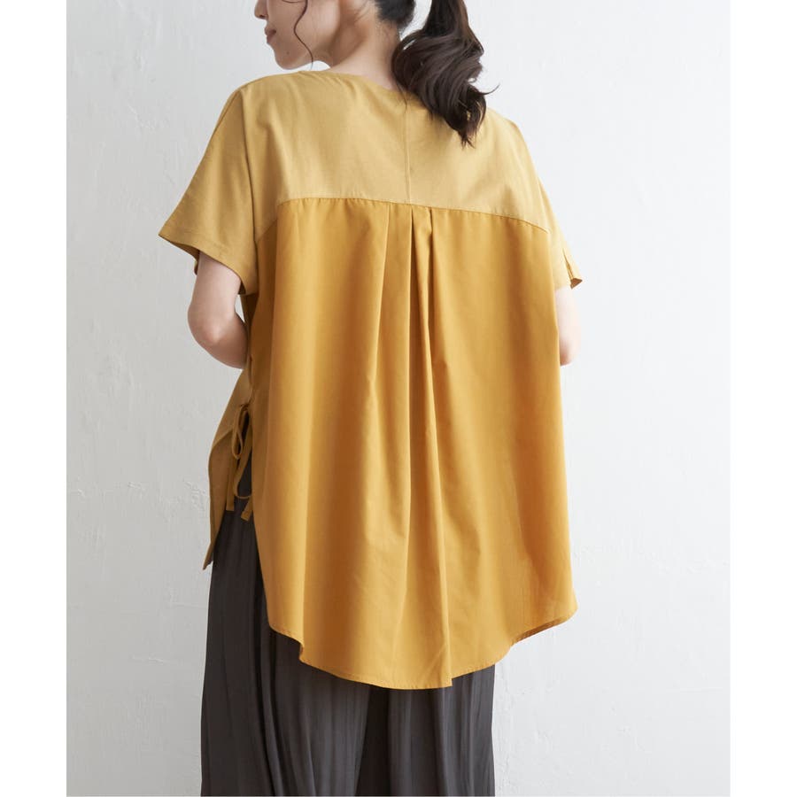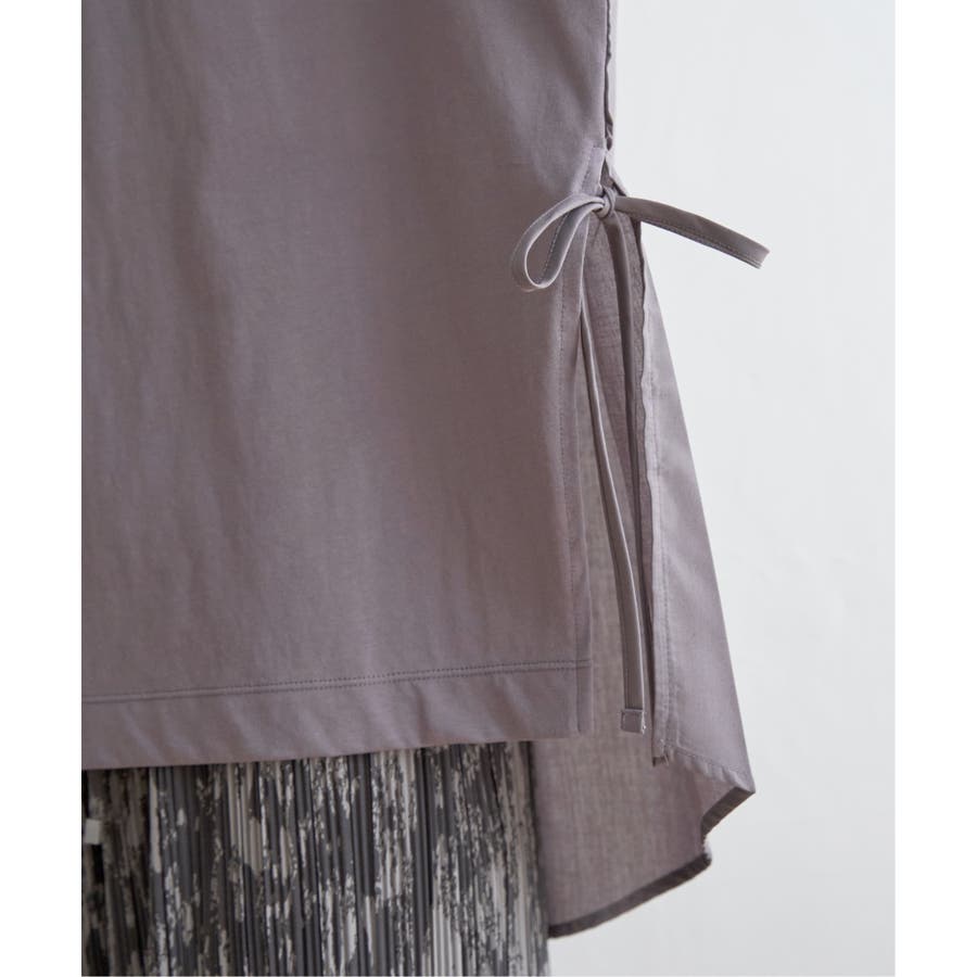 脇にスリットとリボンがついた、異素材使いのドッキングカットチュニックです。