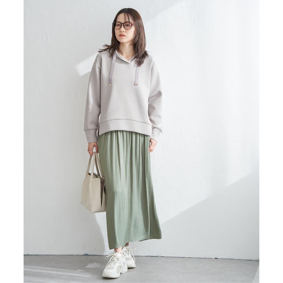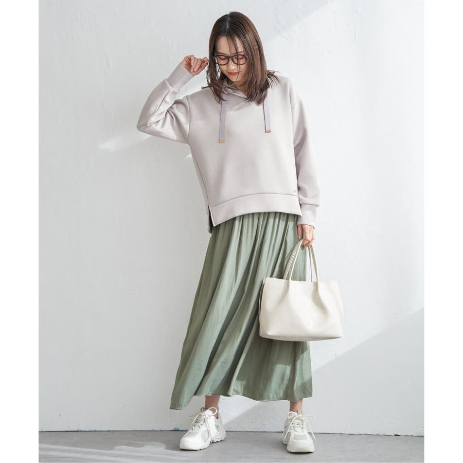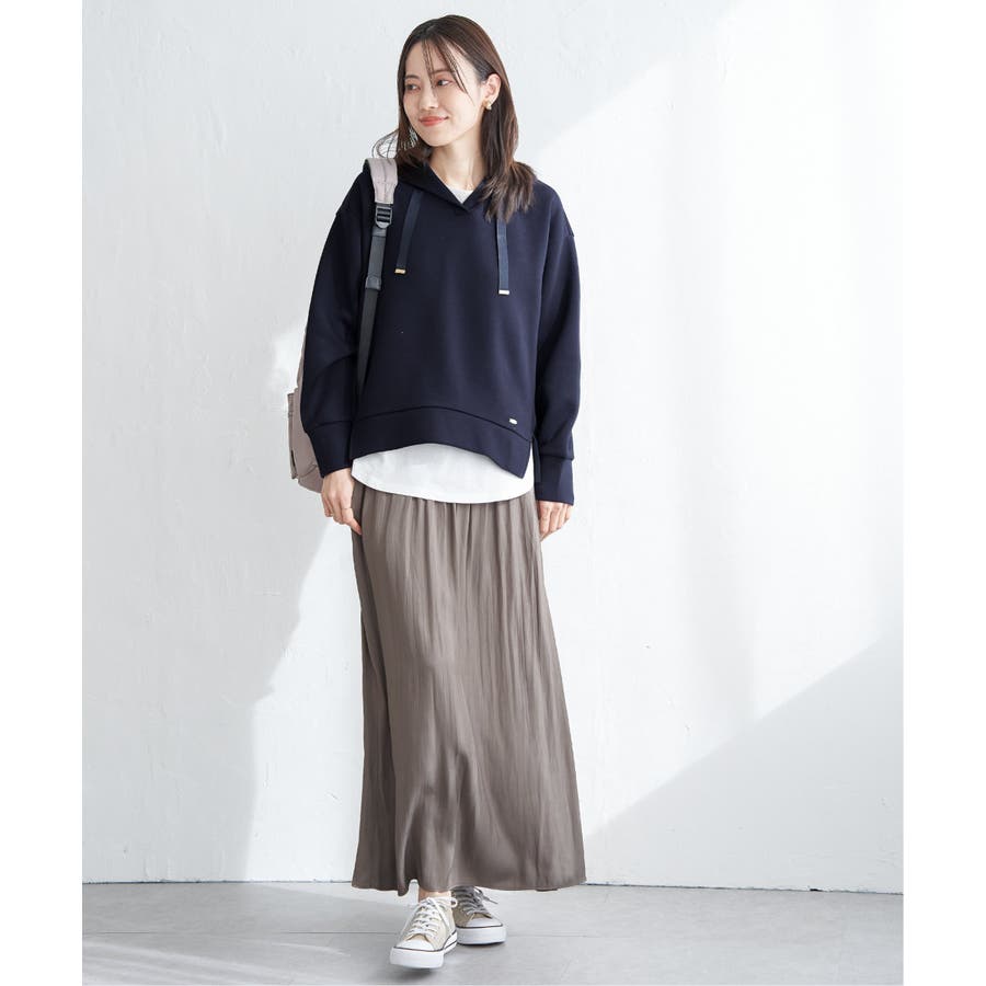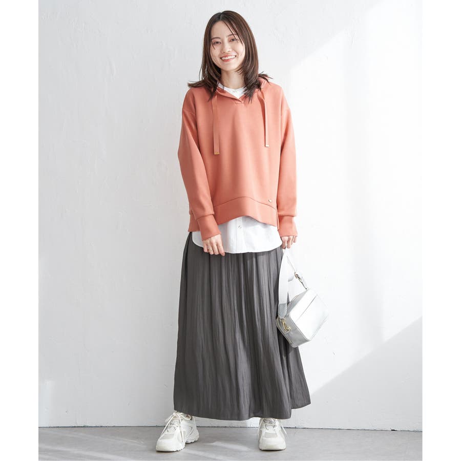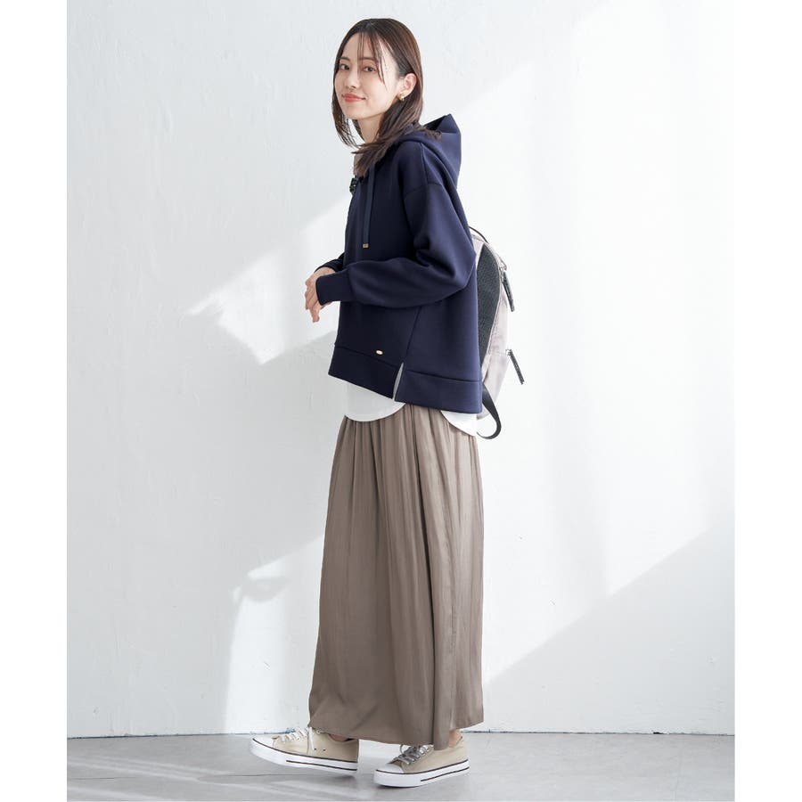 ・スカート見えと、きれいめな素材感が上品に演出