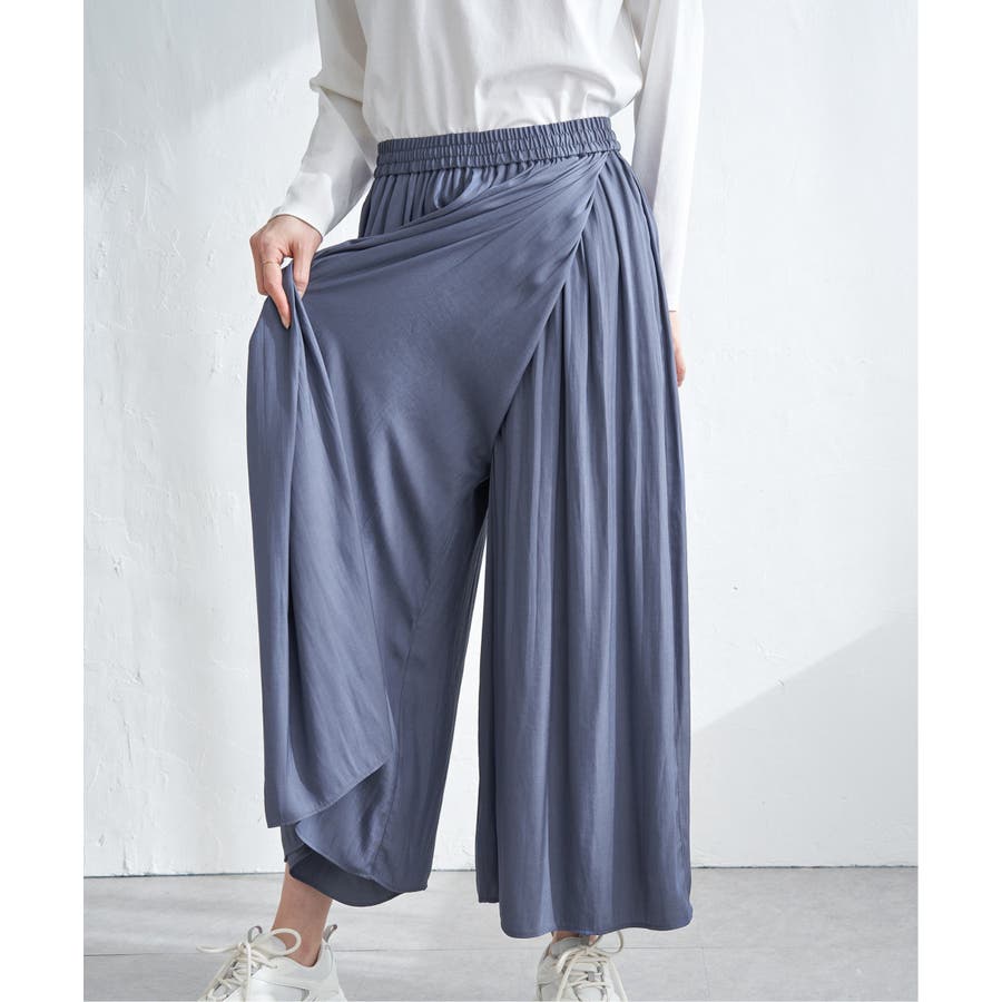 前身頃はラップ風スカートに見え、後ろはワイドパンツに見えるスカーチョタイプのボトム。