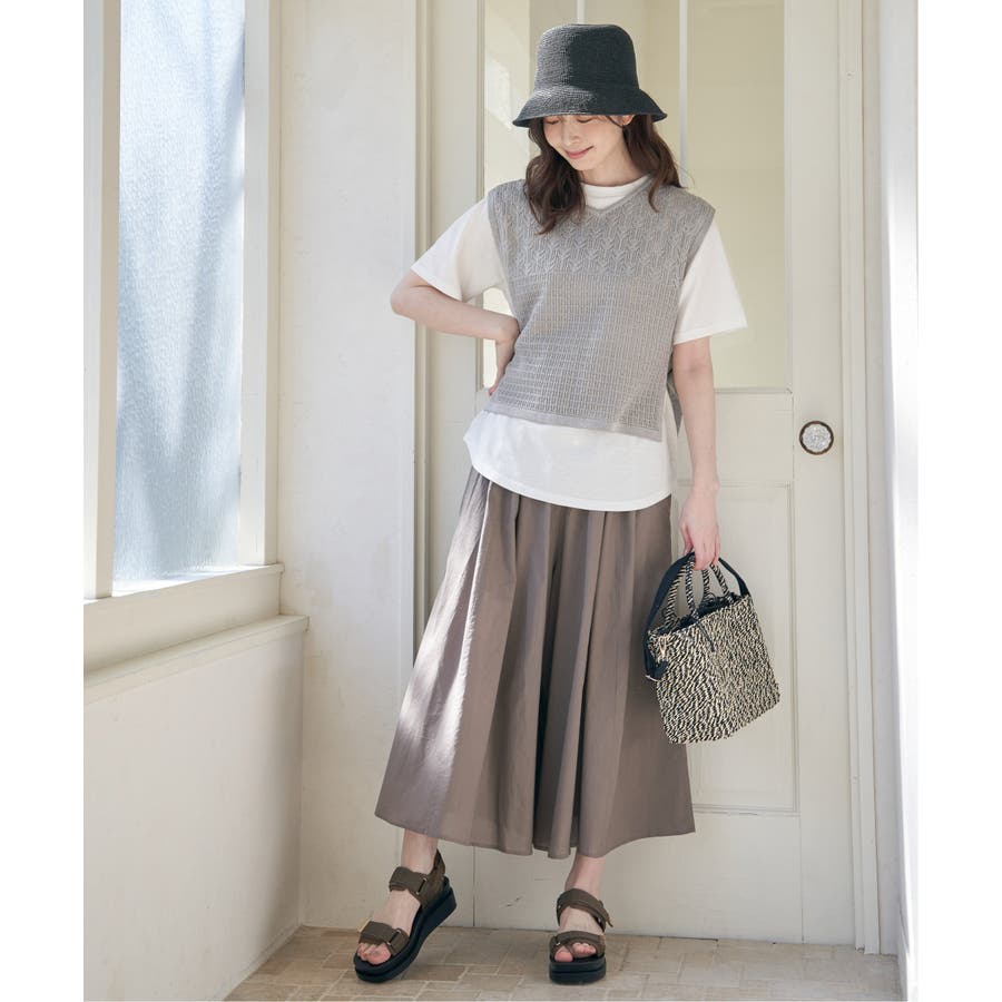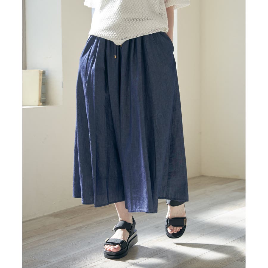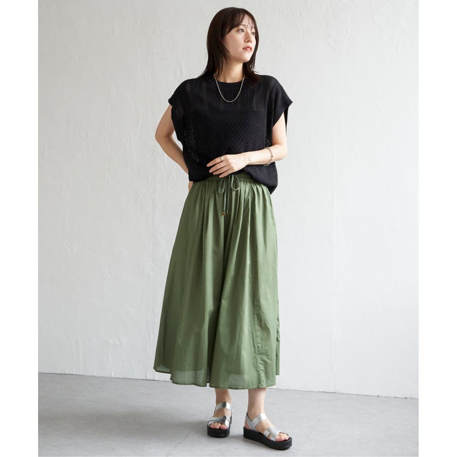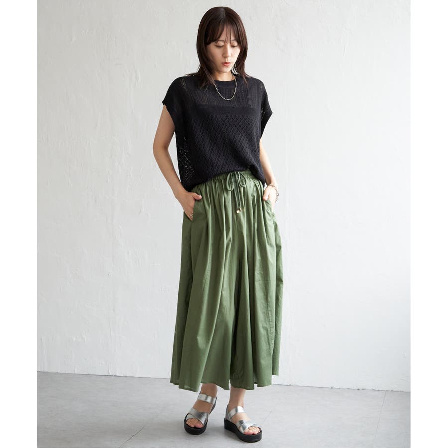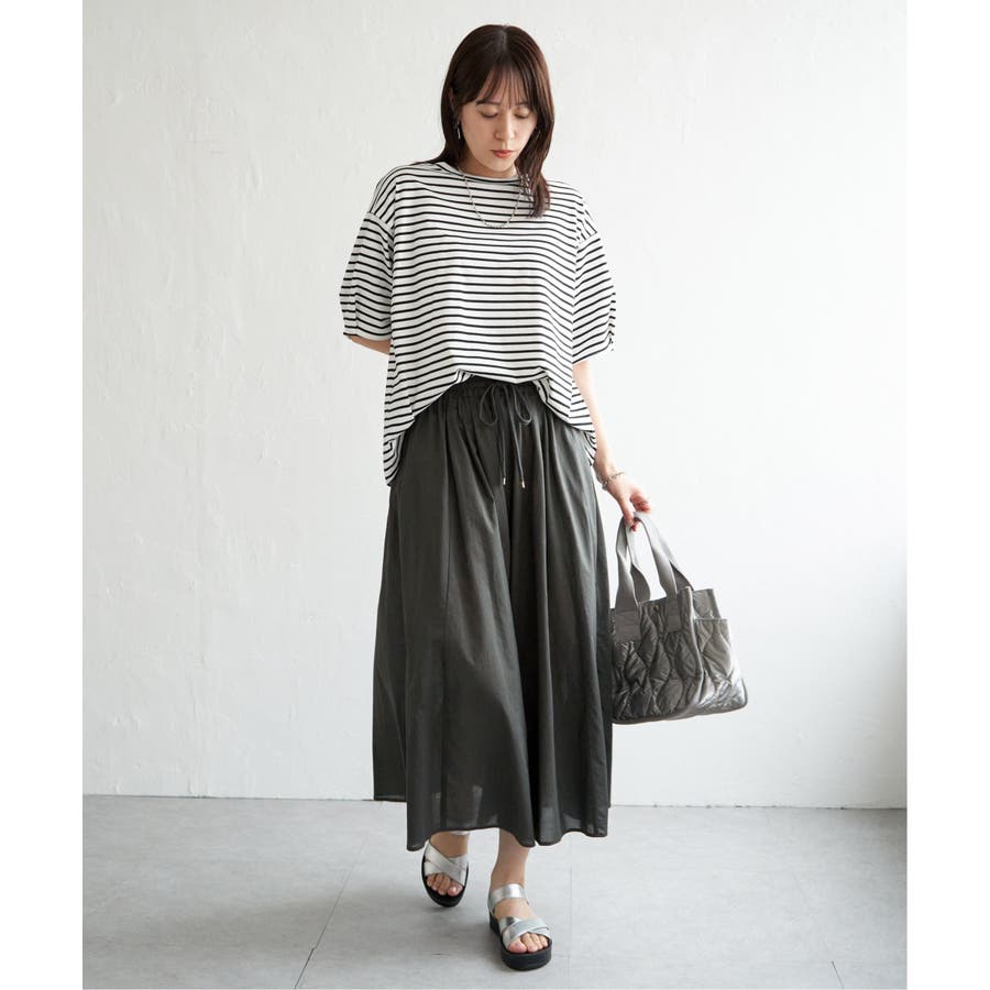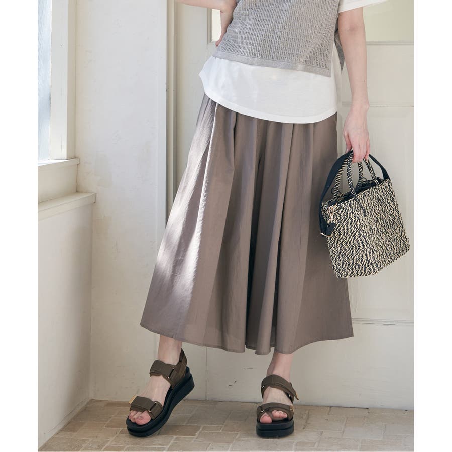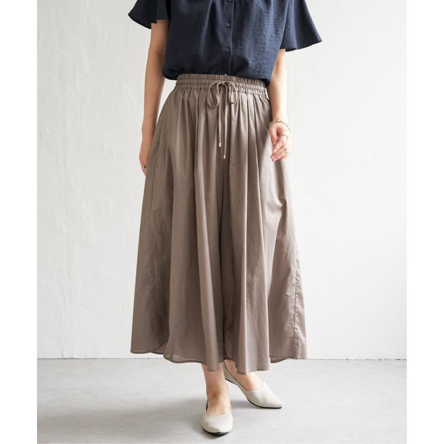 足さばきの良いミモレ丈で、総ゴムのウエストでお気軽にご着用いただけます。