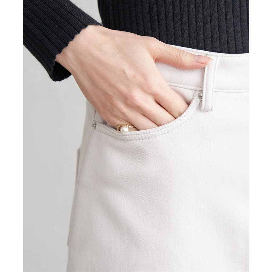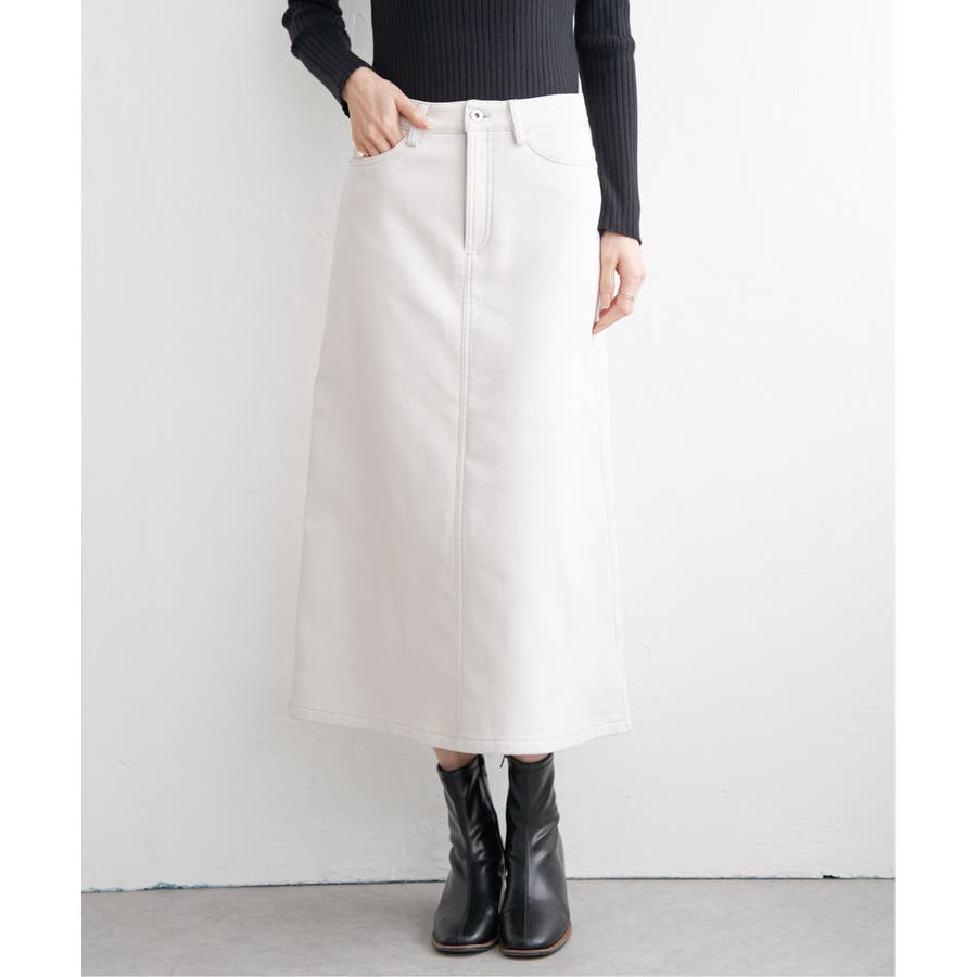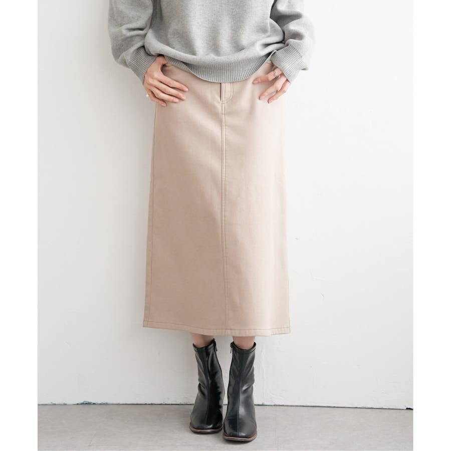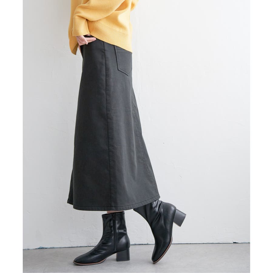ベーシックな5ポケットデザインの、ややAラインになったコンパクトなロングスカートです。