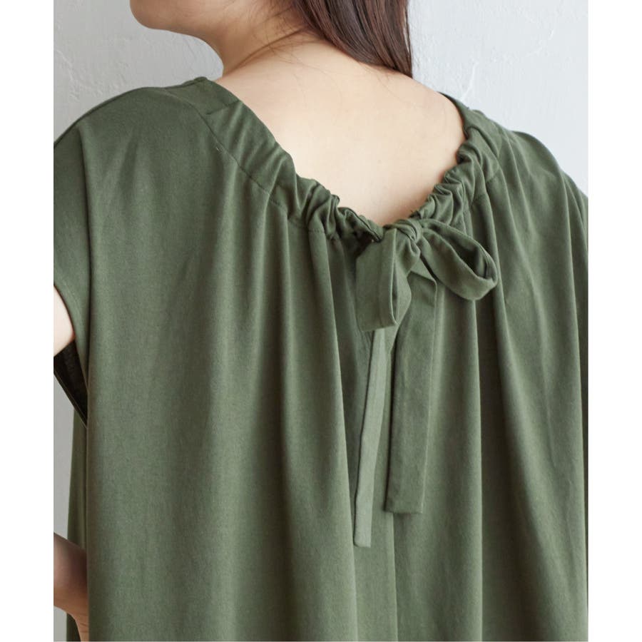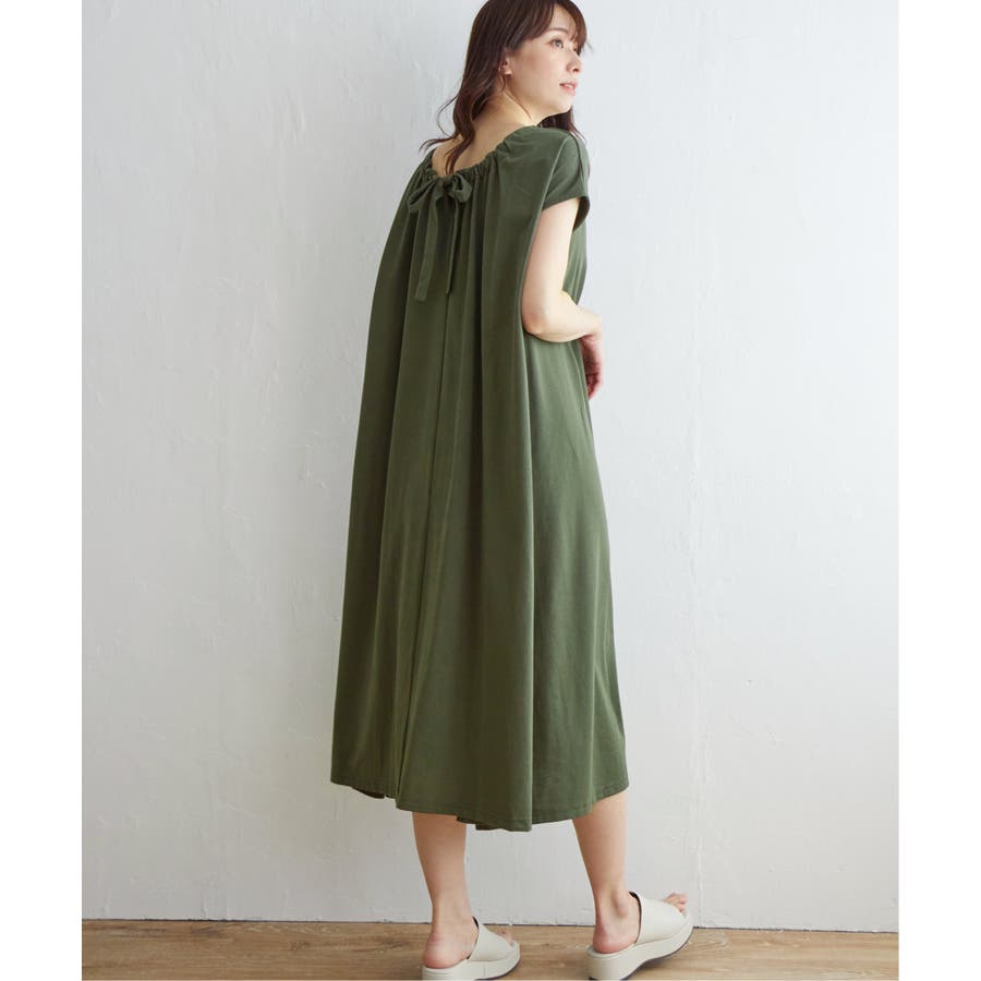 Aラインシルエットで体形カバーができ、後ろにリボンが付いてバックシルエットも可愛いデザインです。